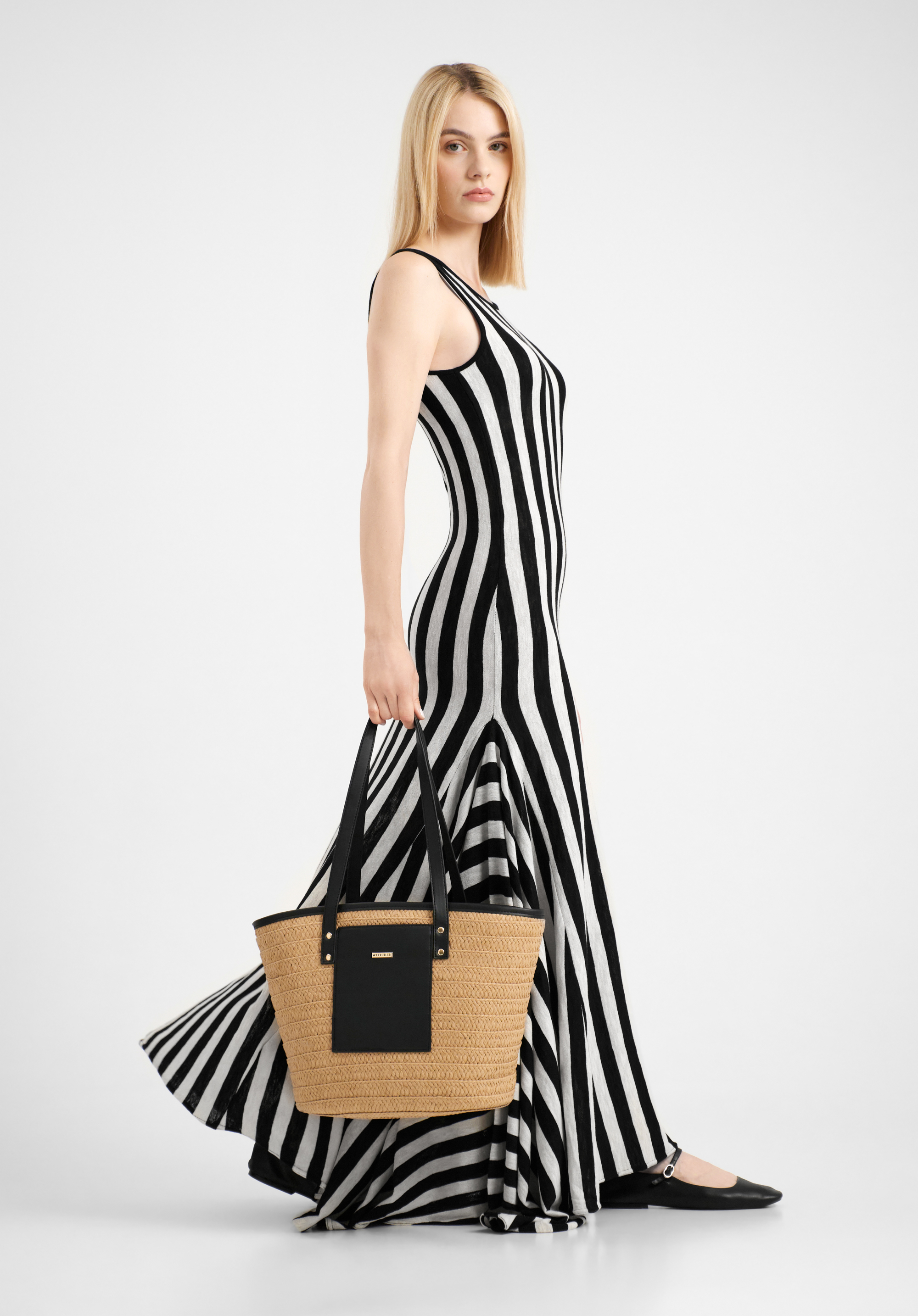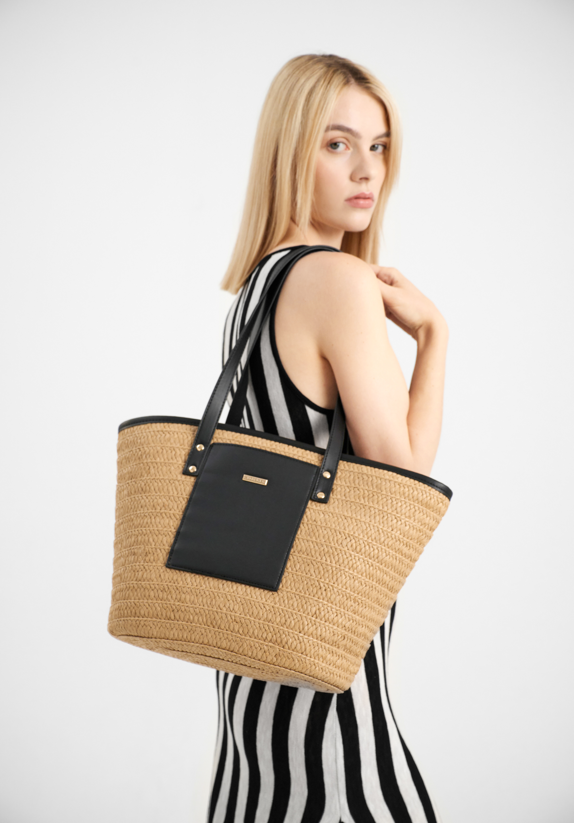 Diese Damenhandtasche im Korbstil verkörpert sommerliche Leichtigkeit und mühelosen Charme. Der Korpus aus Papierstroh besticht durch seine gewebte Textur und seinen natürlichen Look. Ein dezenter Logo-Patch und eine kleine Fronttasche sorgen für Stil und Funktionalität. Im Inneren schützt ein Polyesterfutter mit Kordelzug Ihre wichtigen Dinge sicher und ermöglicht gleichzeitig einfachen Zugriff.