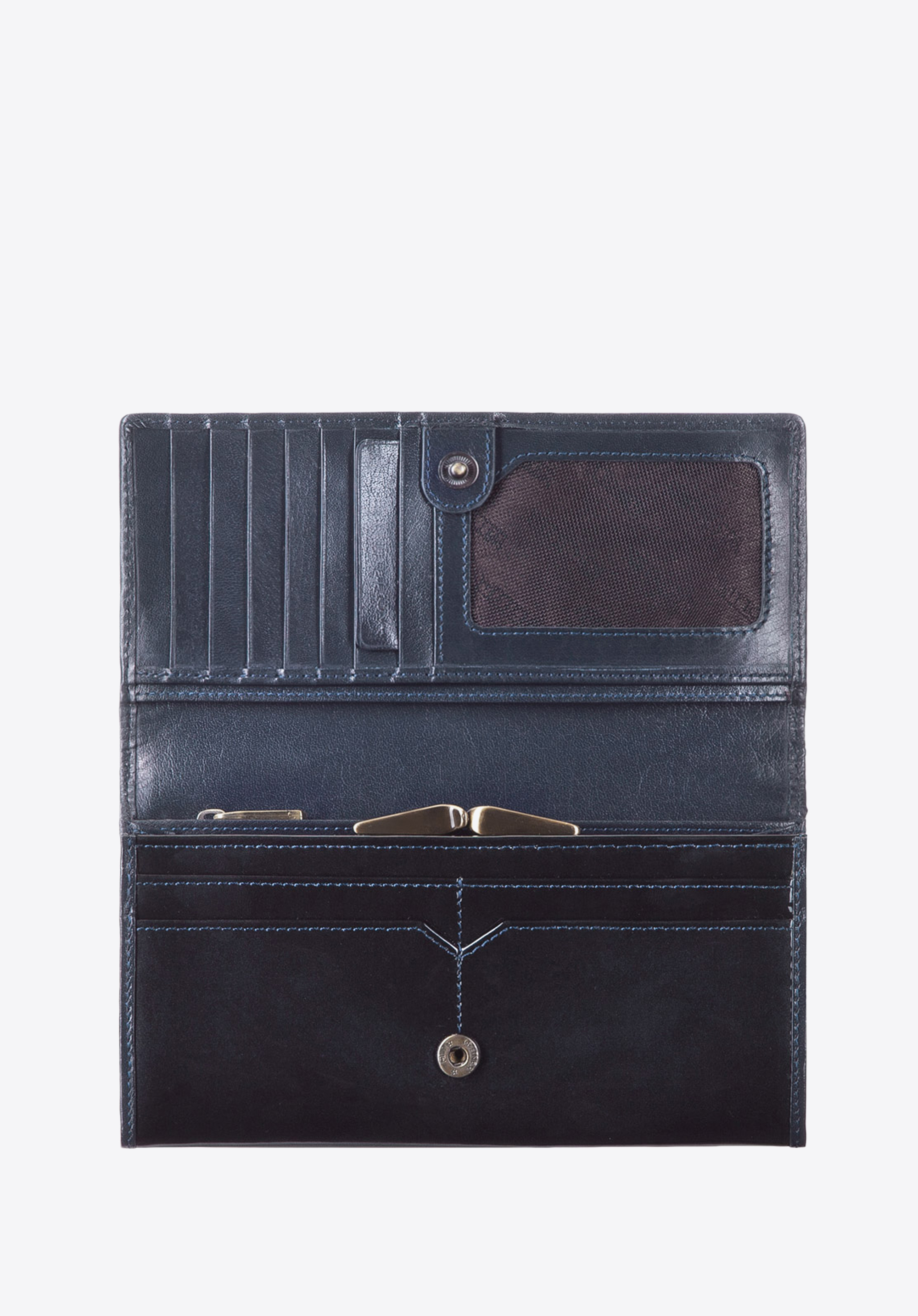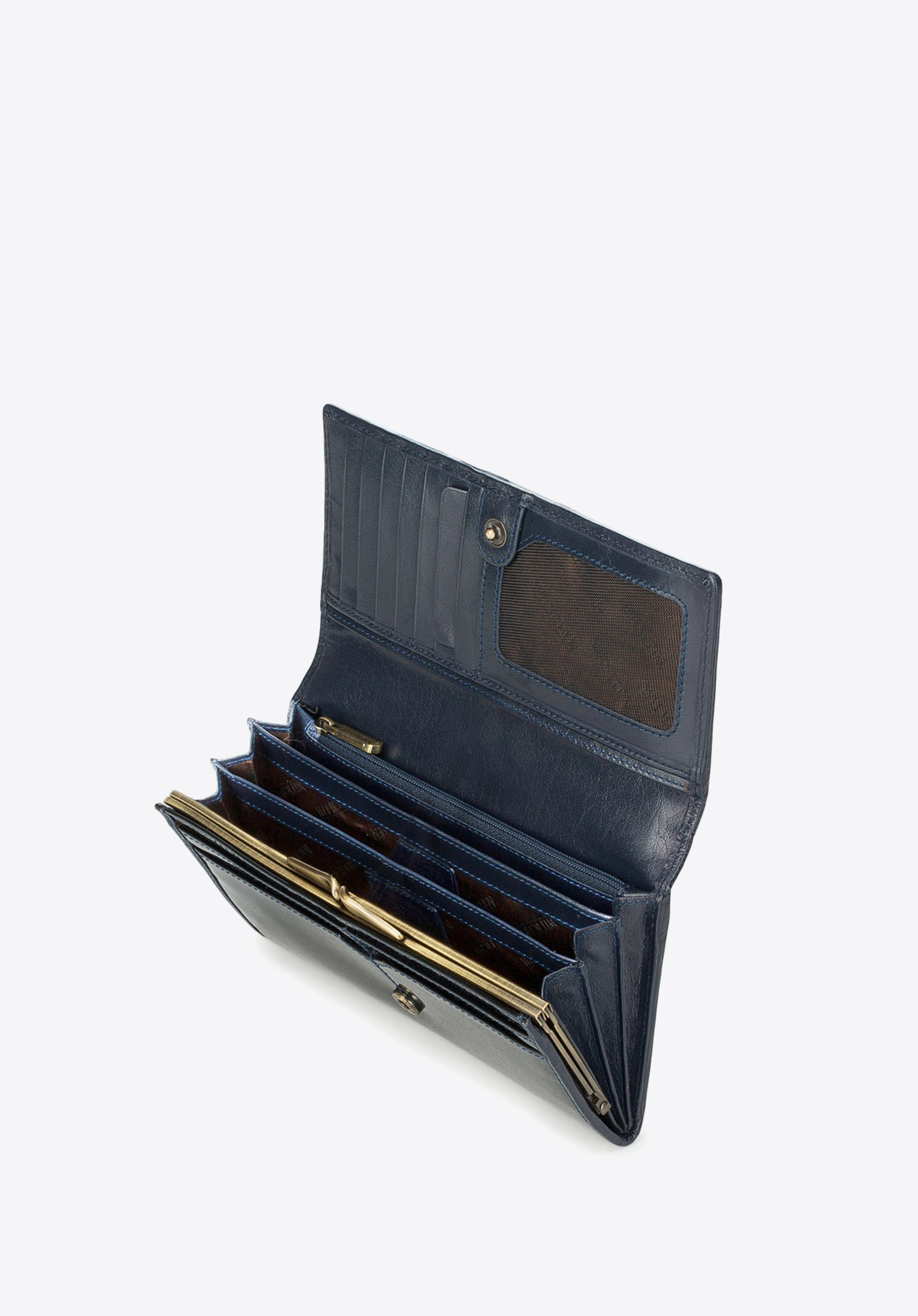 Die stilvolle Geldbörse für Damen wird aus hochwertigem Lackleder mit glänzender Oberfläche genäht. Mit goldfarbener Metallverzierung und tiefer Farbe gewinnt dieses Accessoire einen außergewöhnlichen Charakter. Darüber hinaus bietet das geräumige Modell vielfältige Staumöglichkeiten und verfügt über einen RFID-Schutz. Im Angebot befinden sich drei überzeitliche Farbvarianten: Schwarz, Dunkelblau und Burgunderrot.