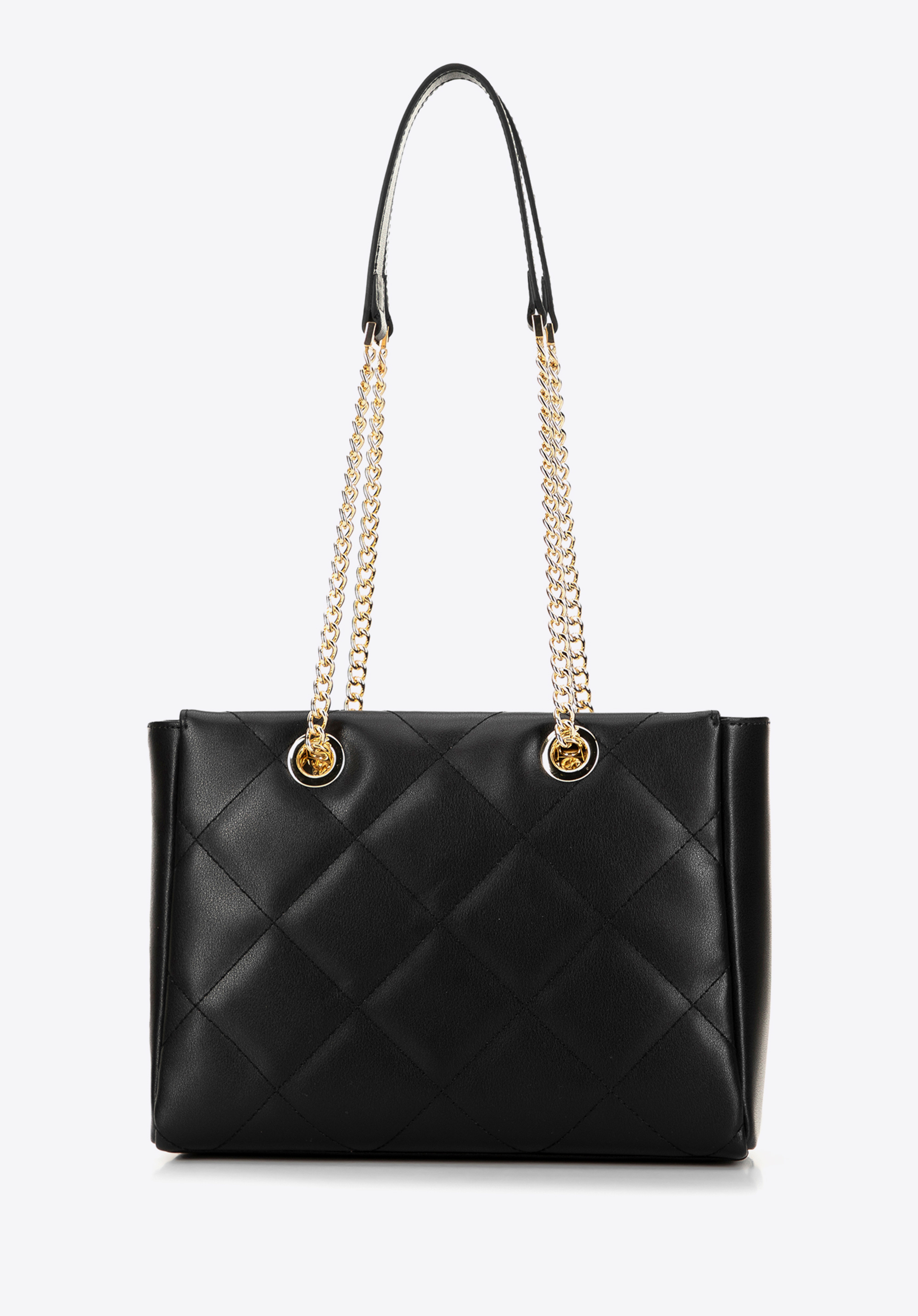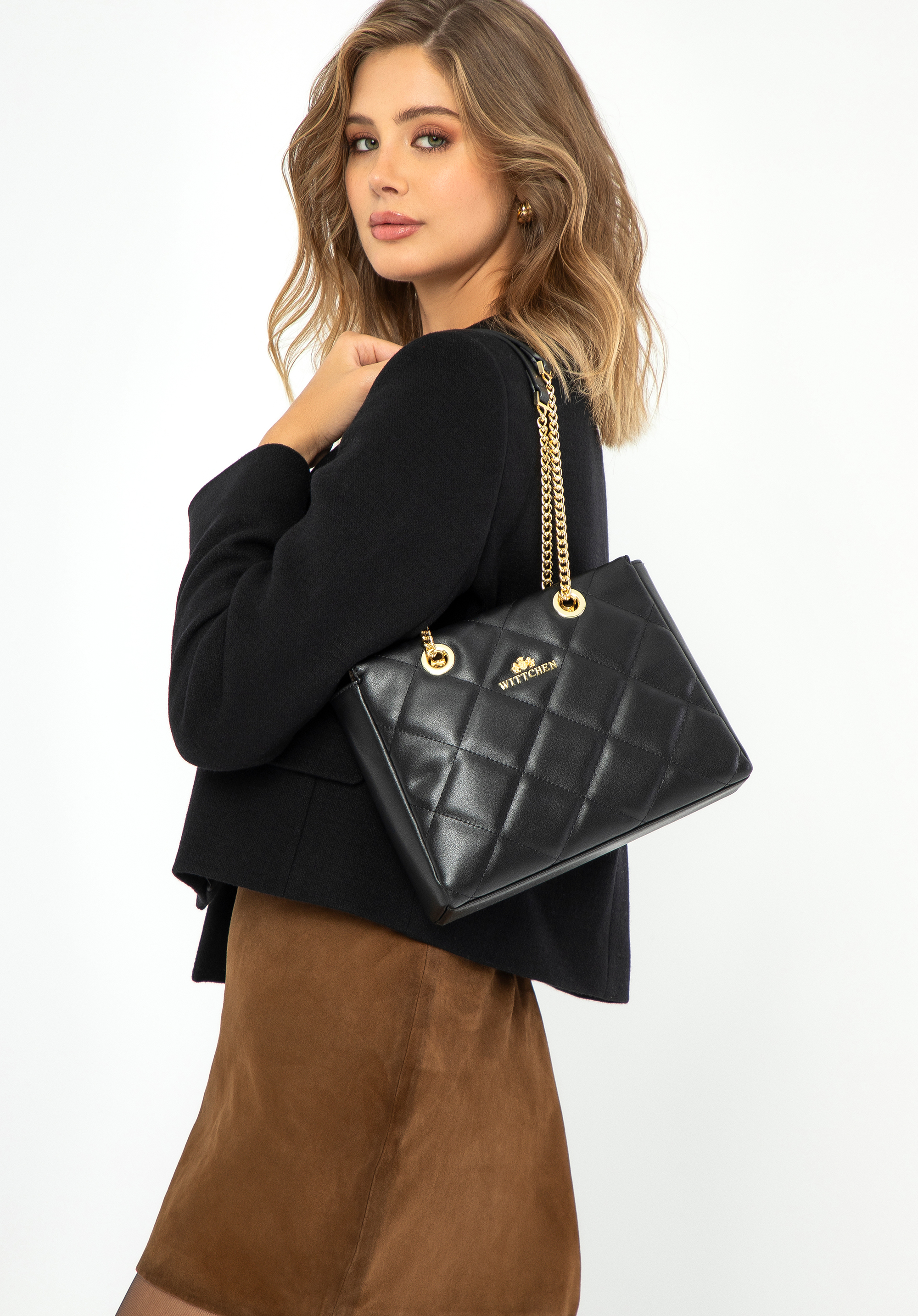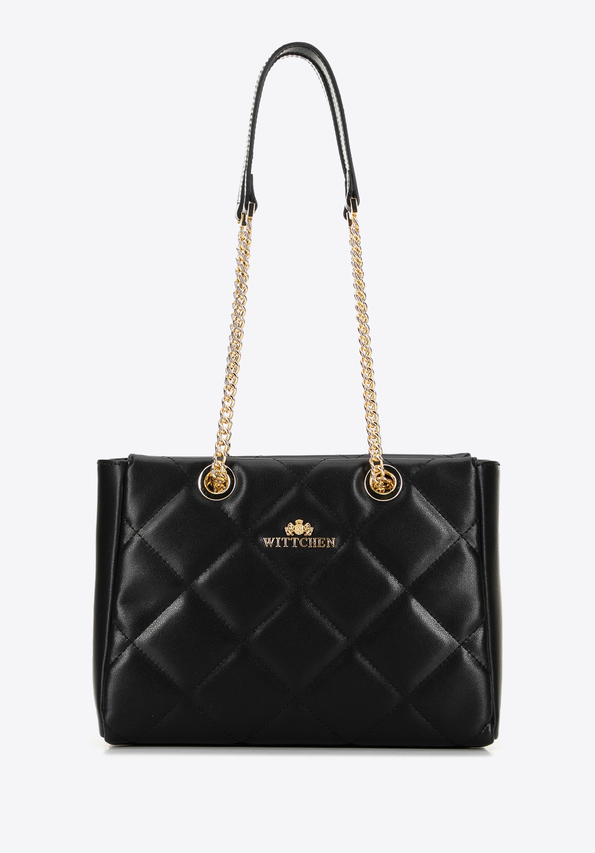 Entdecken Sie eine einzigartige, geometrisch gesteppte Damenhandtasche aus hochwertigem Naturleder, die Strapazierfähigkeit mit luxuriösem Aussehen verbindet. Der Innenraum ist mit einem WITTCHEN-Logo verziert, das für Eleganz und Stil sorgt. Der Reißverschluss sorgt dafür, dass Ihre Habseligkeiten sicher aufbewahrt werden und gleichzeitig leicht zugänglich sind. Es handelt sich um ein Modell mit einem einzigen Fach, einem gepolsterten Boden und einer eleganten Kastenform, ideal für den täglichen Gebrauch.