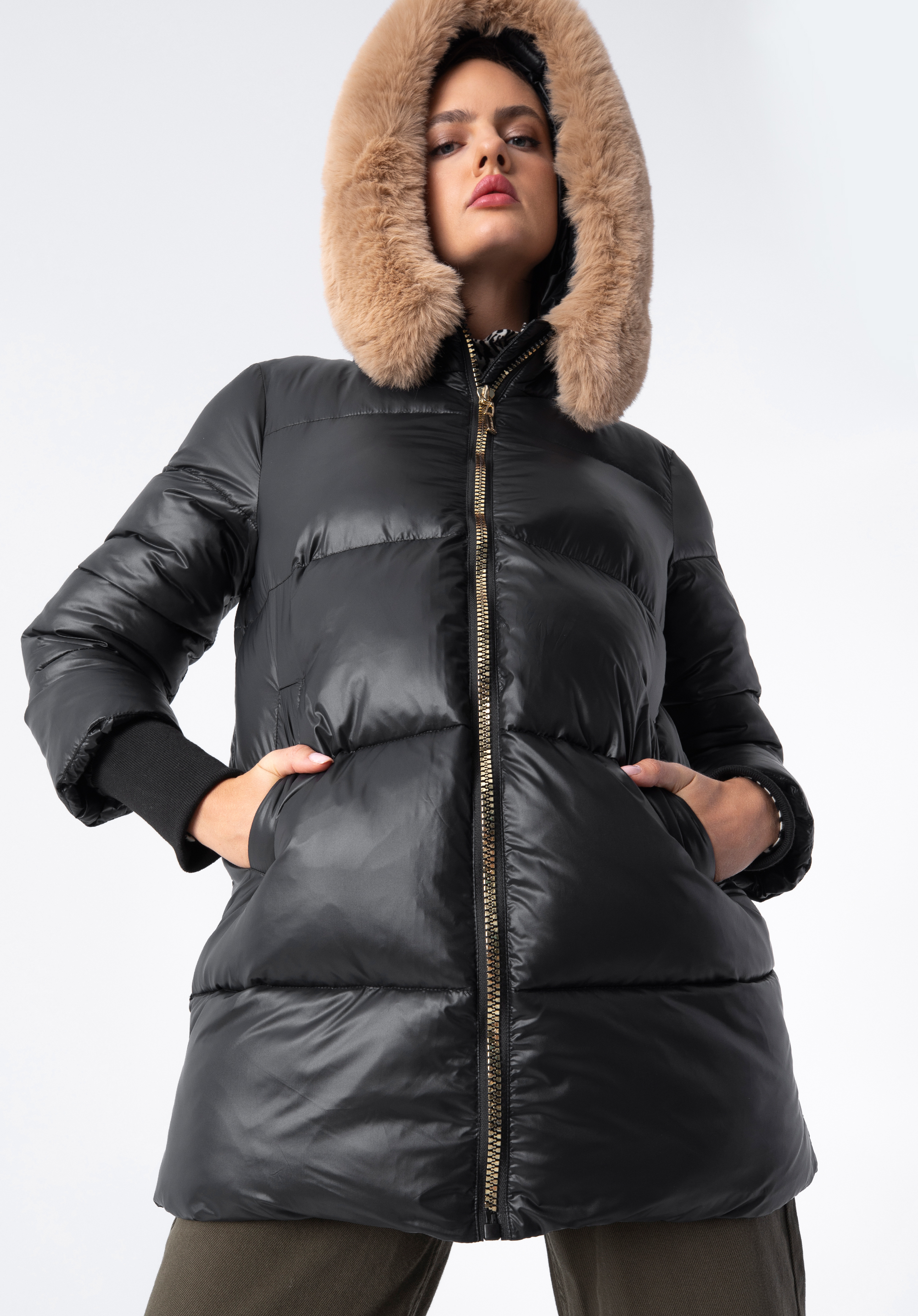 Diese stilvolle Jacke ist ein elegantes und modisches Accessoire für jede Frau. Sie wurde aus glänzendem Nylon gefertigt, das durch einen dicken, glänzenden Reißverschluss hervorgehoben wird. Dieses Modell ist gesteppt und wird nach unten hin breiter. Die Ärmel enden in langen Rippstrickbündchen, die für Komfort und Bequemlichkeit sorgen. Die Kapuze ist recht groß und schützt Ihren Kopf vor Kälte. Die gesteppte Damen-Nylonjacke mit Kapuze ist ein schickes Modell, das Sie jeden Tag tragen können. Sie sieht sowohl mit Ihren Lieblingsstiefeln mit Absatz als auch mit warmen Wintertrappern toll aus.