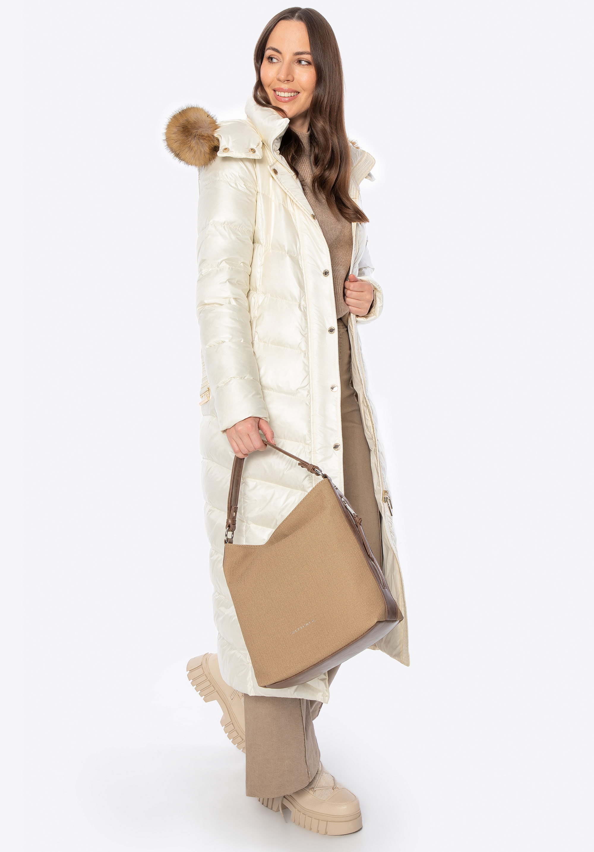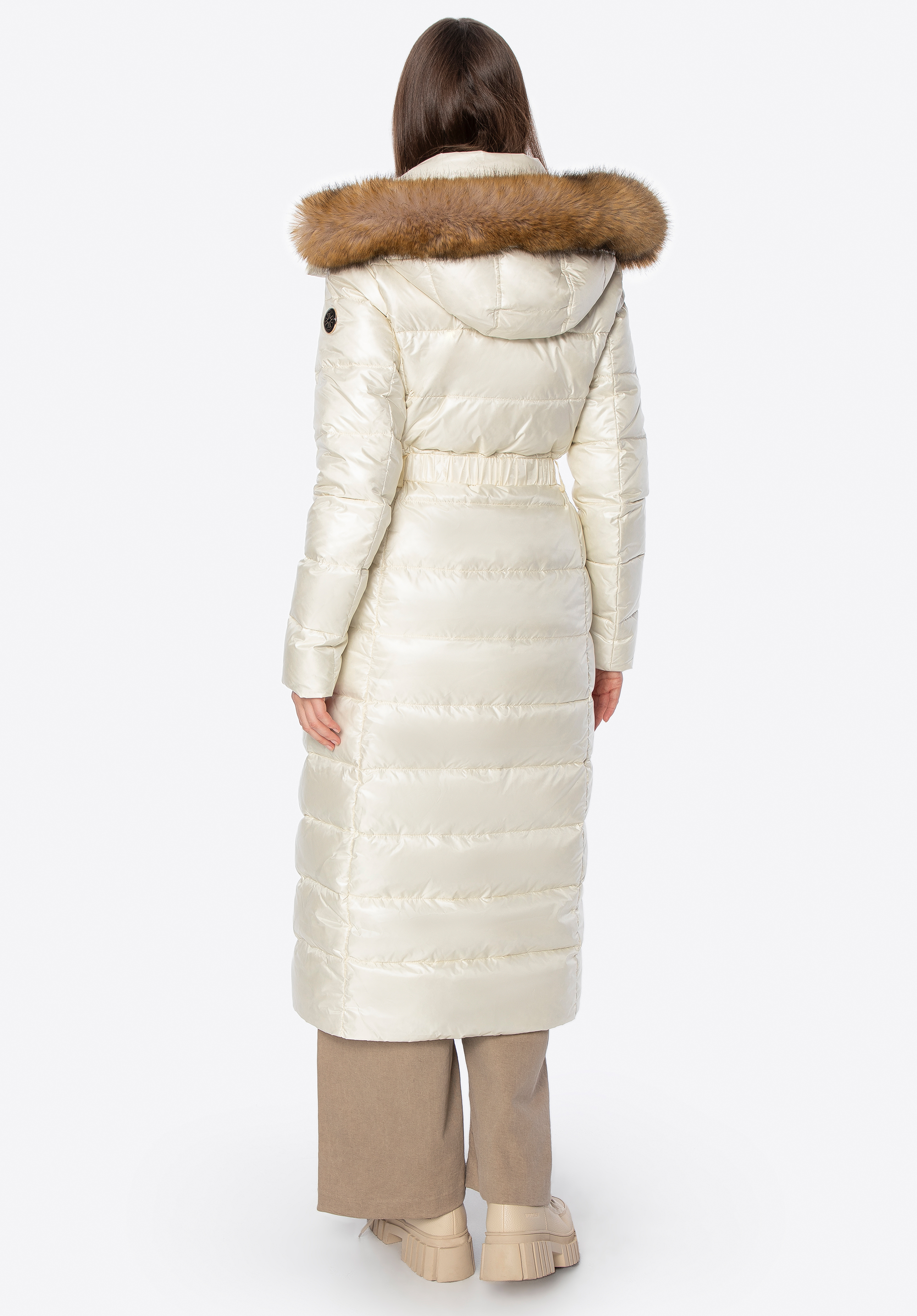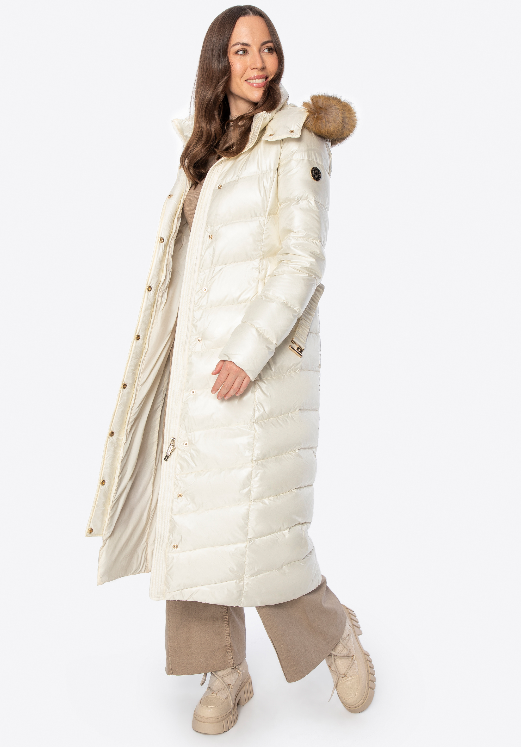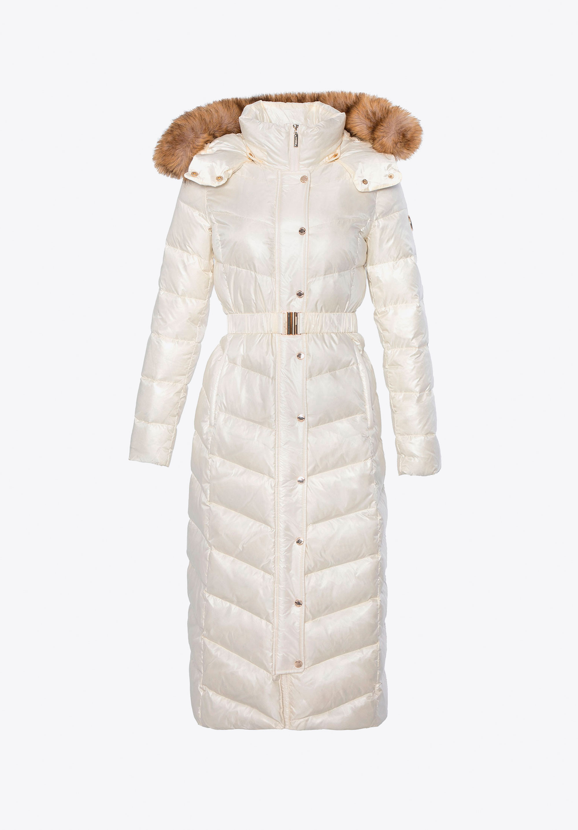 Dieser Daunenmantel vereint Stil und Komfort an Wintertagen. Die Füllung aus natürlichen Entendaunen und Federn sorgt für hervorragende Wärmeisolation, während die lange, schmal geschnittene Silhouette die Figur vorteilhaft betont und sanft umspielt – für eine schmeichelhafte Silhouette und optimale Bewegungsfreiheit. Das Außenmaterial aus strapazierfähigem Nylon schützt vor Wind und Nässe. Zu den durchdachten Details gehören ein robuster Reißverschluss mit Druckknöpfen , zwei Reißverschlusstaschen , ein Gürtel in der Taille , der die feminine Silhouette betont, und eine Kapuze mit abnehmbarem Kunstpelzbesatz .