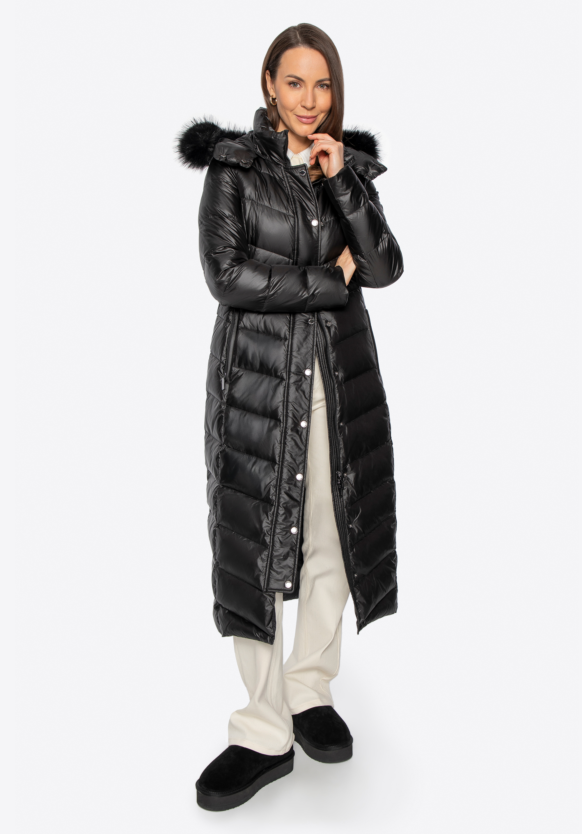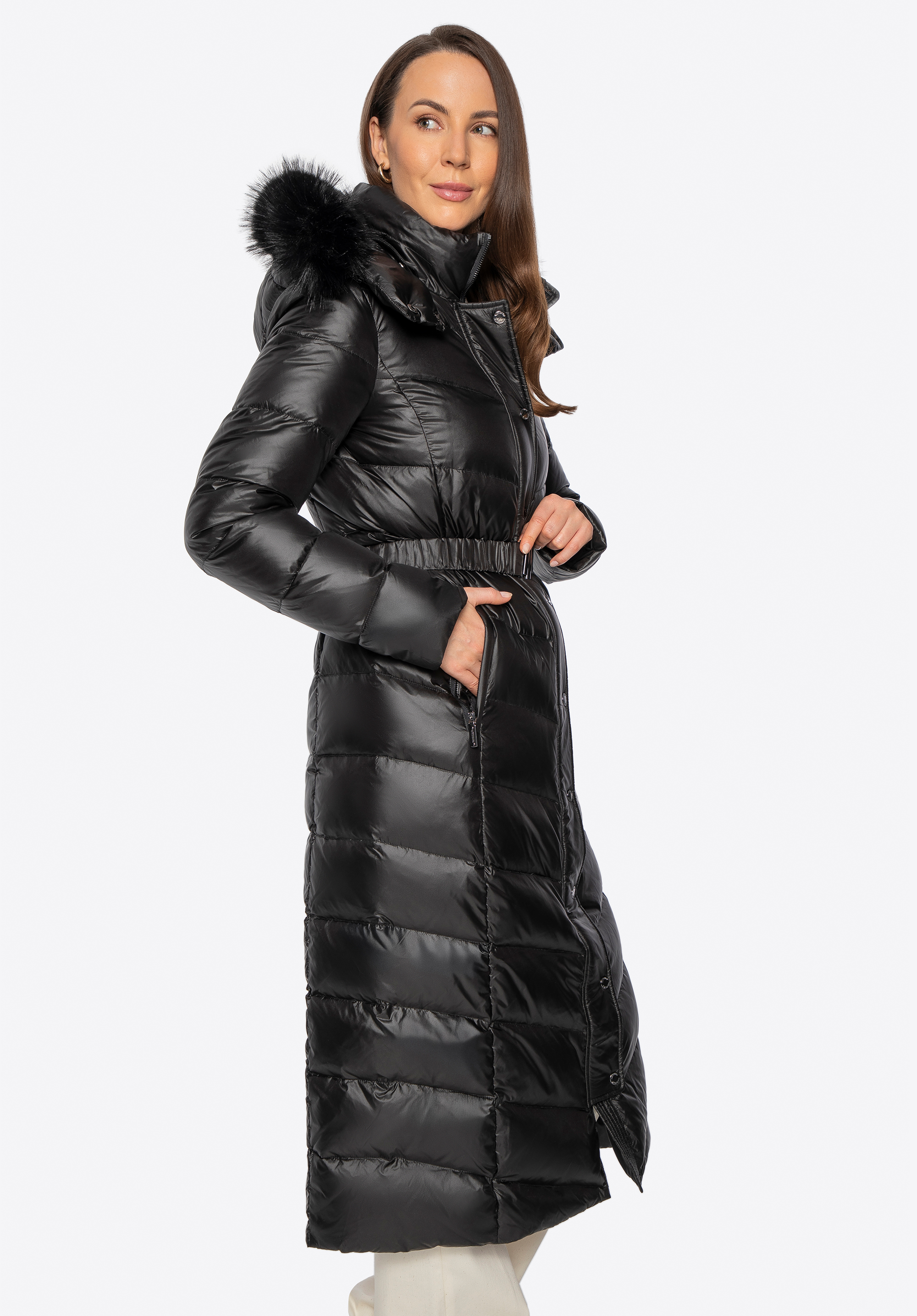 Dieser Daunenmantel vereint Stil und Komfort an Wintertagen. Die Füllung aus natürlichen Entendaunen und Federn sorgt für hervorragende Wärmeisolation, während die lange, schmal geschnittene Silhouette die Figur vorteilhaft betont und sanft umspielt – für eine schmeichelhafte Silhouette und optimale Bewegungsfreiheit. Das Außenmaterial aus strapazierfähigem Nylon schützt vor Wind und Nässe. Zu den durchdachten Details gehören ein robuster Reißverschluss mit Druckknöpfen , zwei Reißverschlusstaschen , ein Gürtel in der Taille , der die feminine Silhouette betont, und eine Kapuze mit abnehmbarem Kunstpelzbesatz .