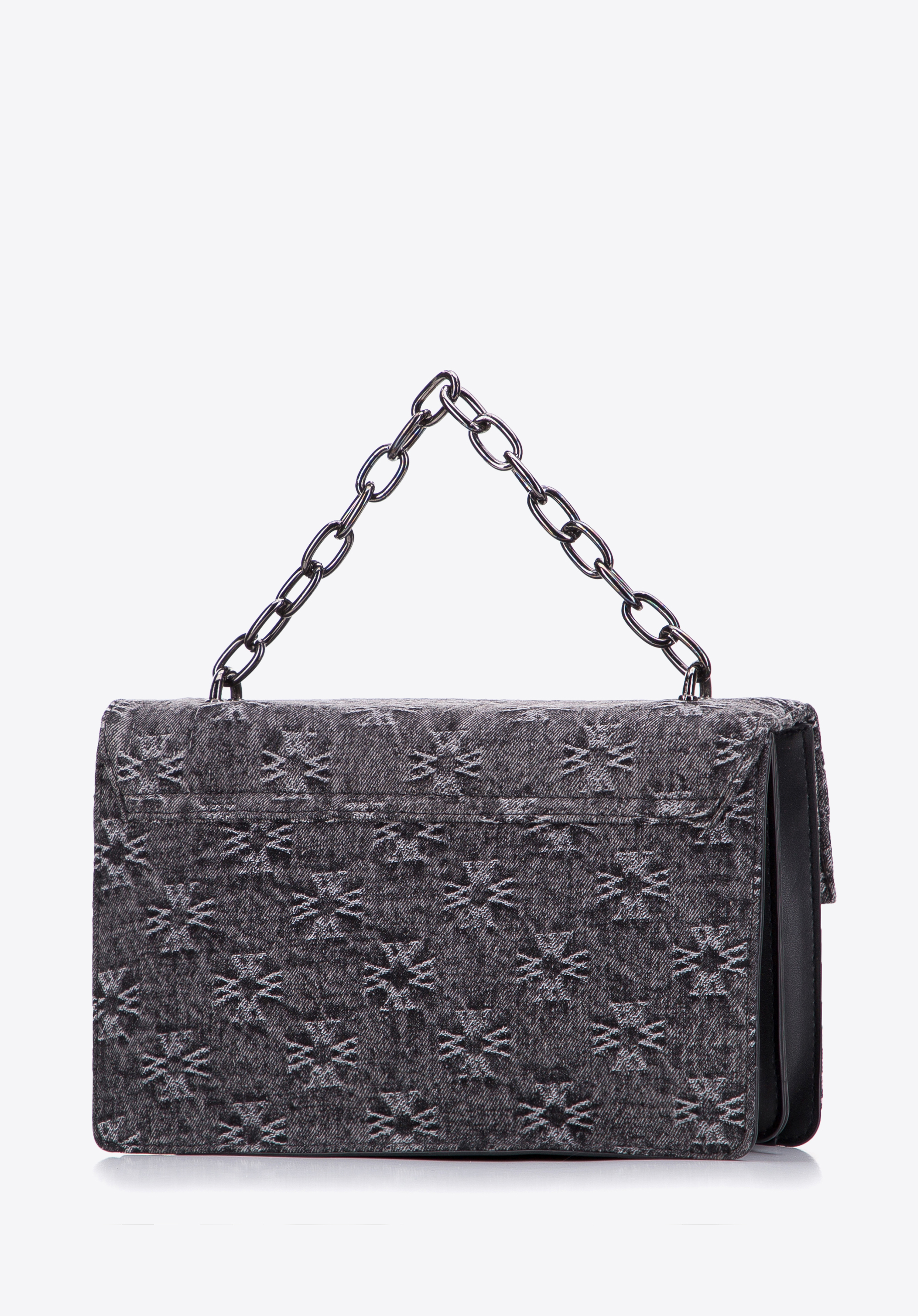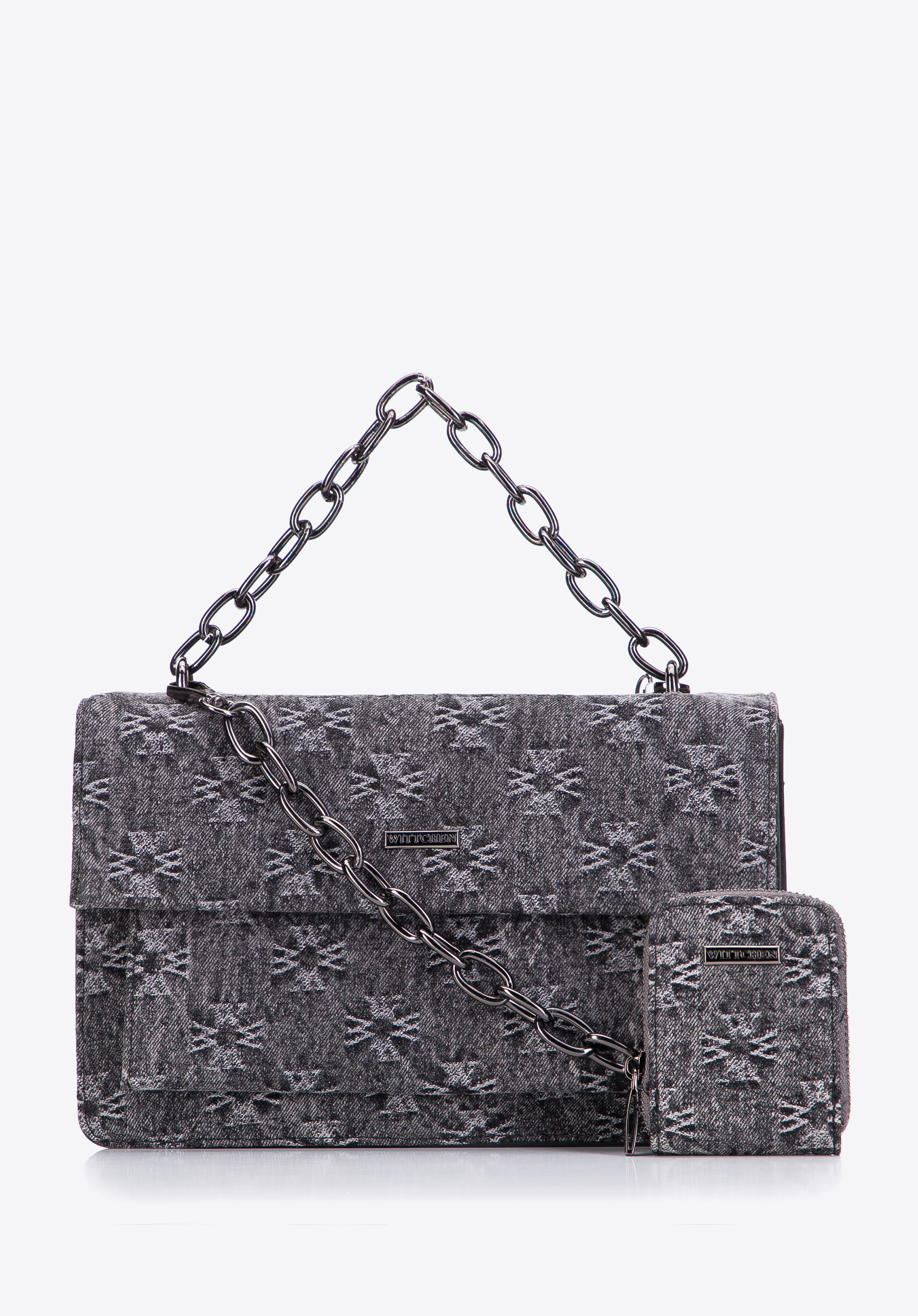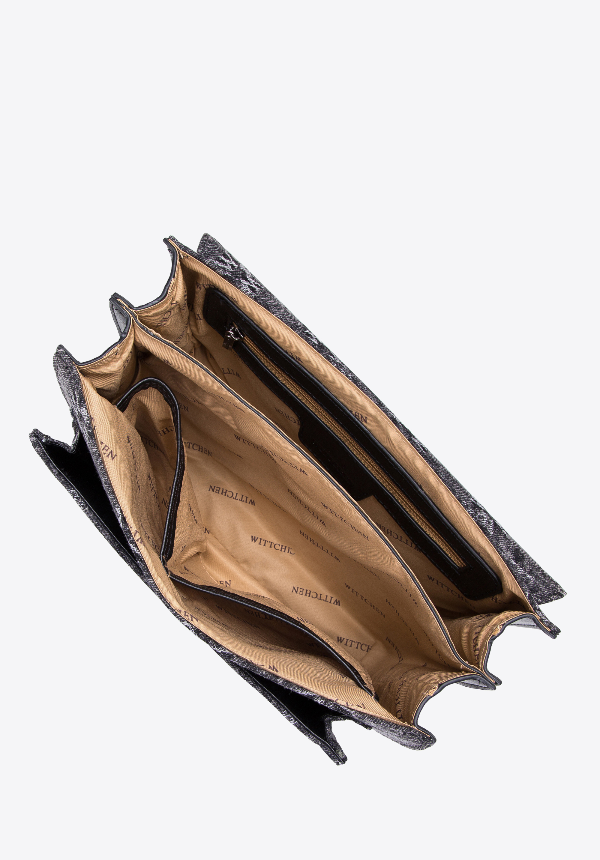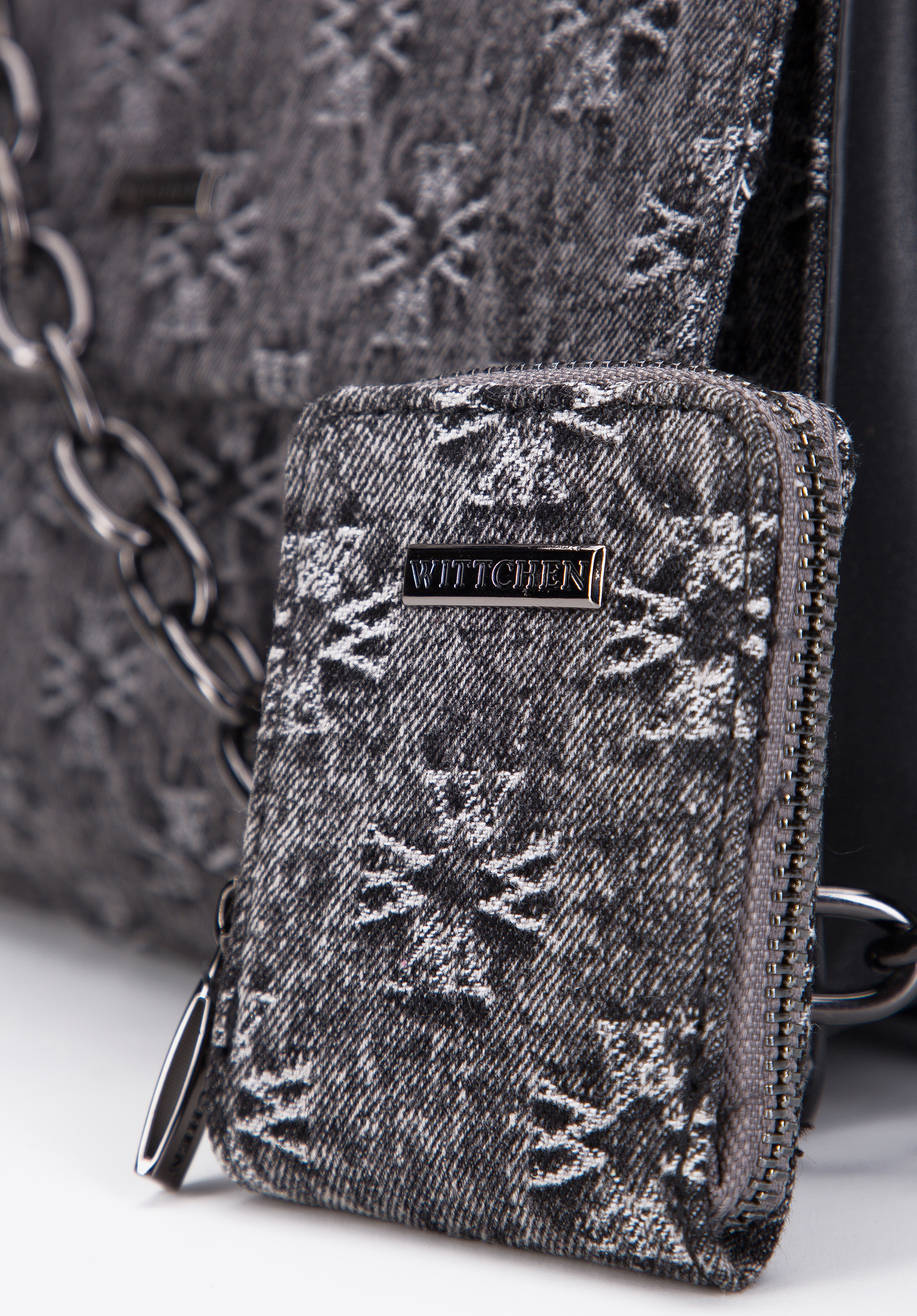 Diese originelle Umhängetasche mit Monogramm unterstreicht Ihren Stil. Ein Denim-Finish mit dem WITTCHEN-Monogramm bedeckt die Vorderseite und den Überschlag der Tasche. Die Seiten sind aus hochwertigem Öko-Leder gefertigt. Im Inneren befinden sich zwei Fächer, in denen Sie alles gut unterbringen können: Geldbörse, Handy, Taschentücher, Handcreme, einen kleinen Kalender und ein paar Kleinigkeiten. Sie können ihn nach Belieben tragen: über der Schulter oder in der Hand, nachdem Sie die lange Kette abgenommen haben. Dieses Modell bringt Abwechslung in fast jedes schlichte Kleid Die Tasche aus Denim mit Monogramm für Damen ist ein modisches Accessoire, das Sie in Ihrer Garderobe unbedingt haben sollten.