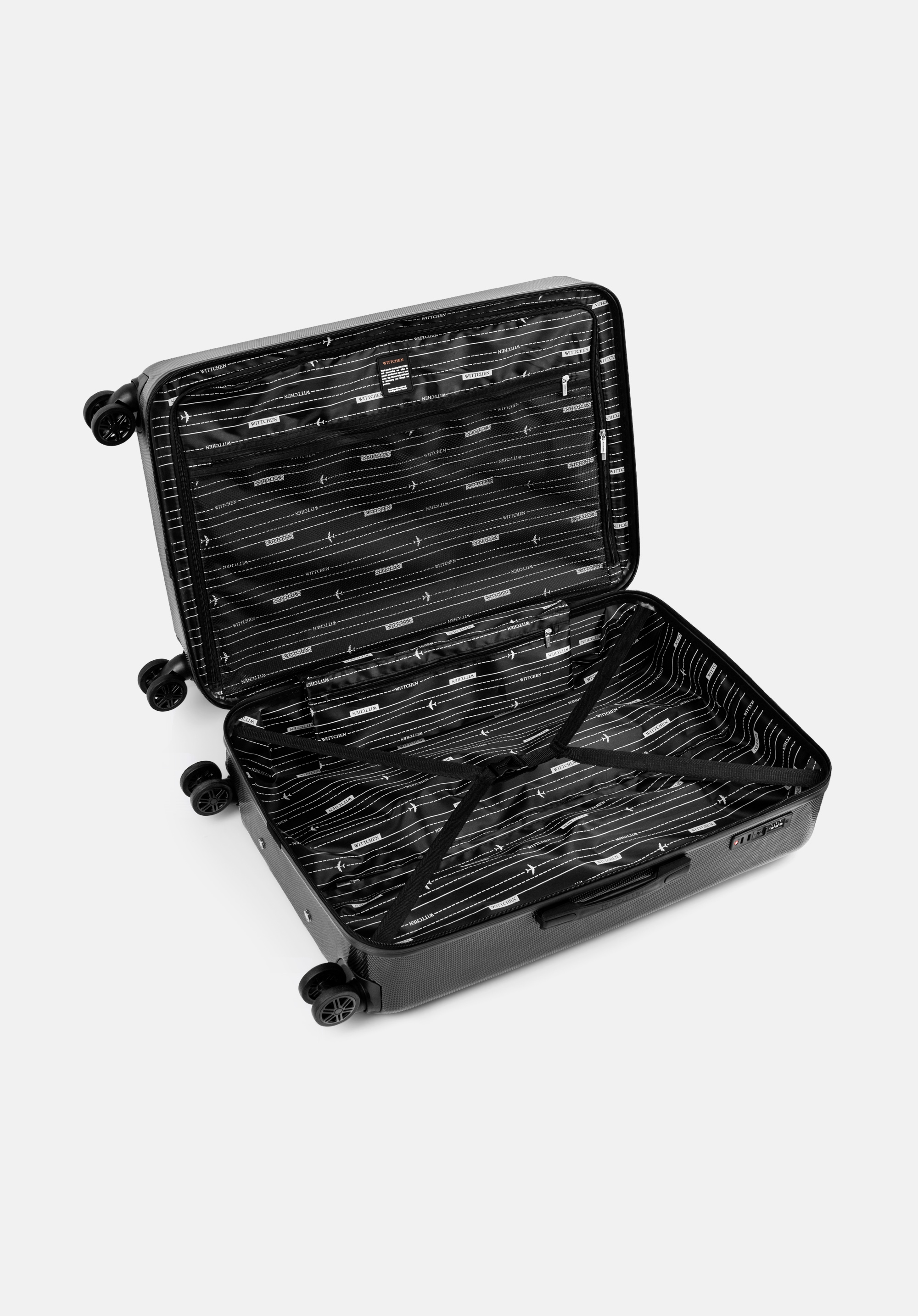 Platz und Organisation: Der Koffer bietet einen geräumigen Innenraum mit zwei Fächern, Riemen zum Sichern des Gepäcks und zusätzlichen Taschen, um den Inhalt perfekt zu organisieren.