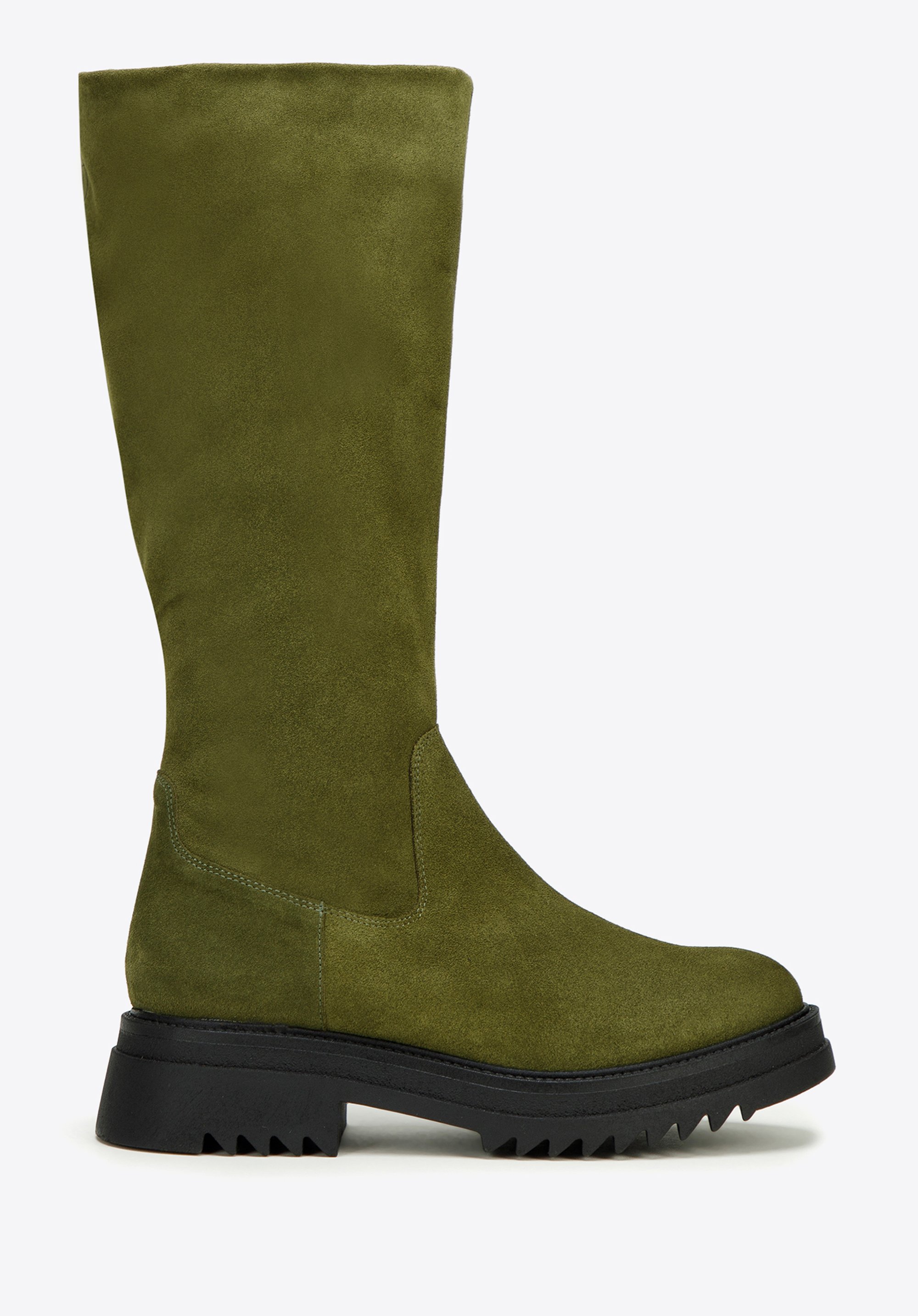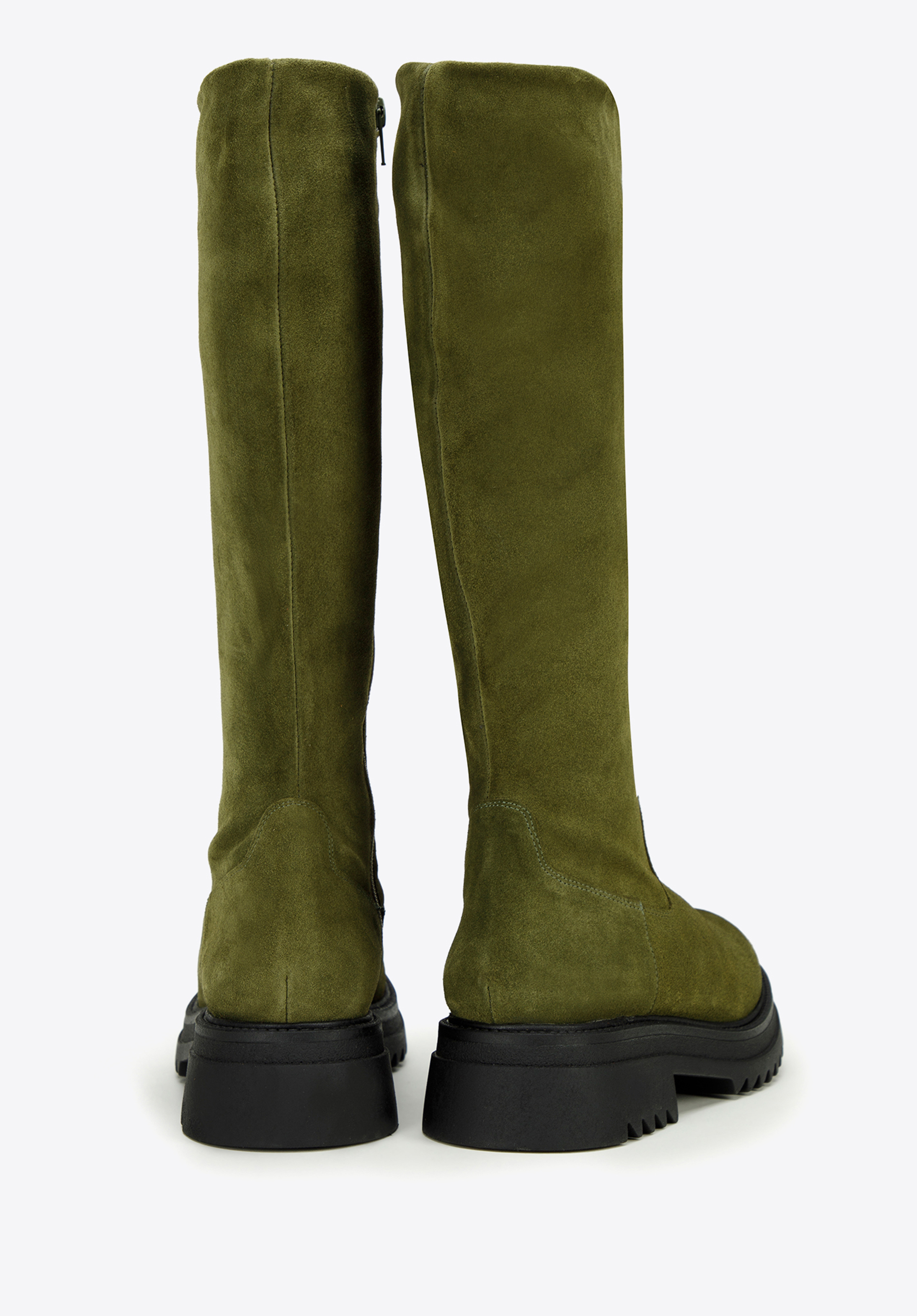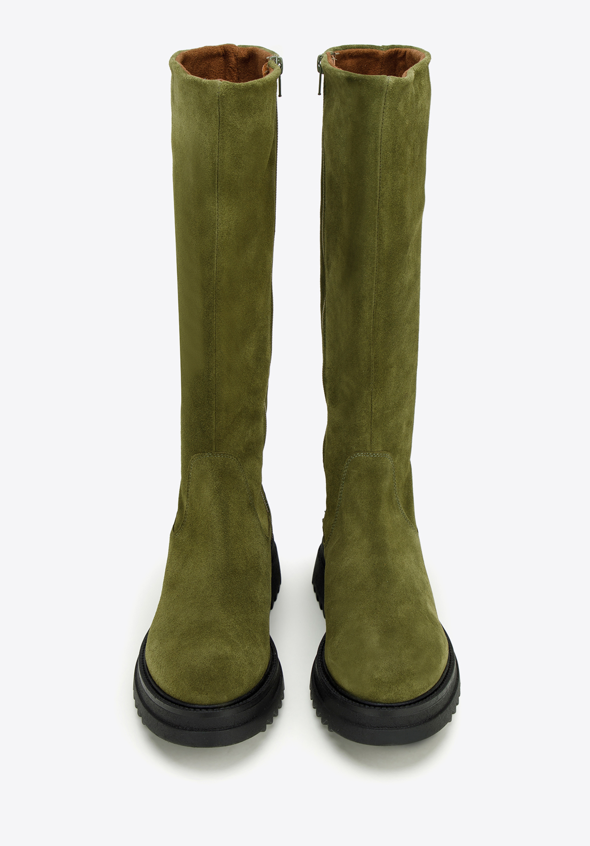 Klare Linien und schlichte Details legen den Fokus auf die klobige Plateausohle dieses kniehohen Stiefels. Eine Plateausohle verleiht jedem Look den perfekten Touch. Diese aus dem hochwertigsten Wildleder in Spanien gefertigten Statement-Schuhe zeichnen sich durch ein modisches Design aus und die Textileinlegesohle schützt vor Witterungseinflüssen. Dank des praktischen seitlichen Reißverschlusses für einen einfachen Einstieg sind sie der ideale Begleiter für Ihre Füße an kalten Wintertagen. Bringen Sie etwas Gemütlichkeit in Ihre Schuhkollektion mit einem Paar klobiger kniehoher Stiefel .
