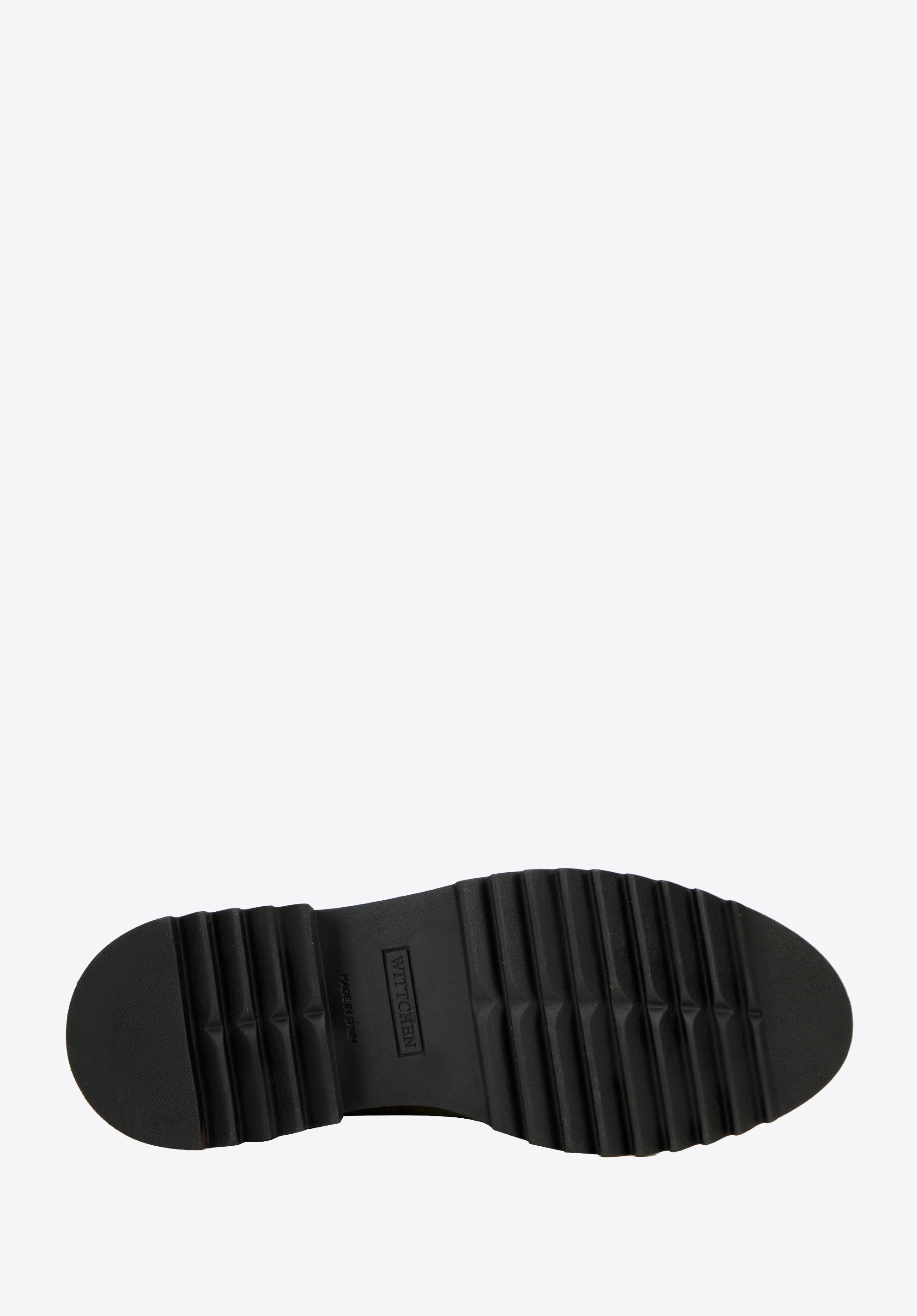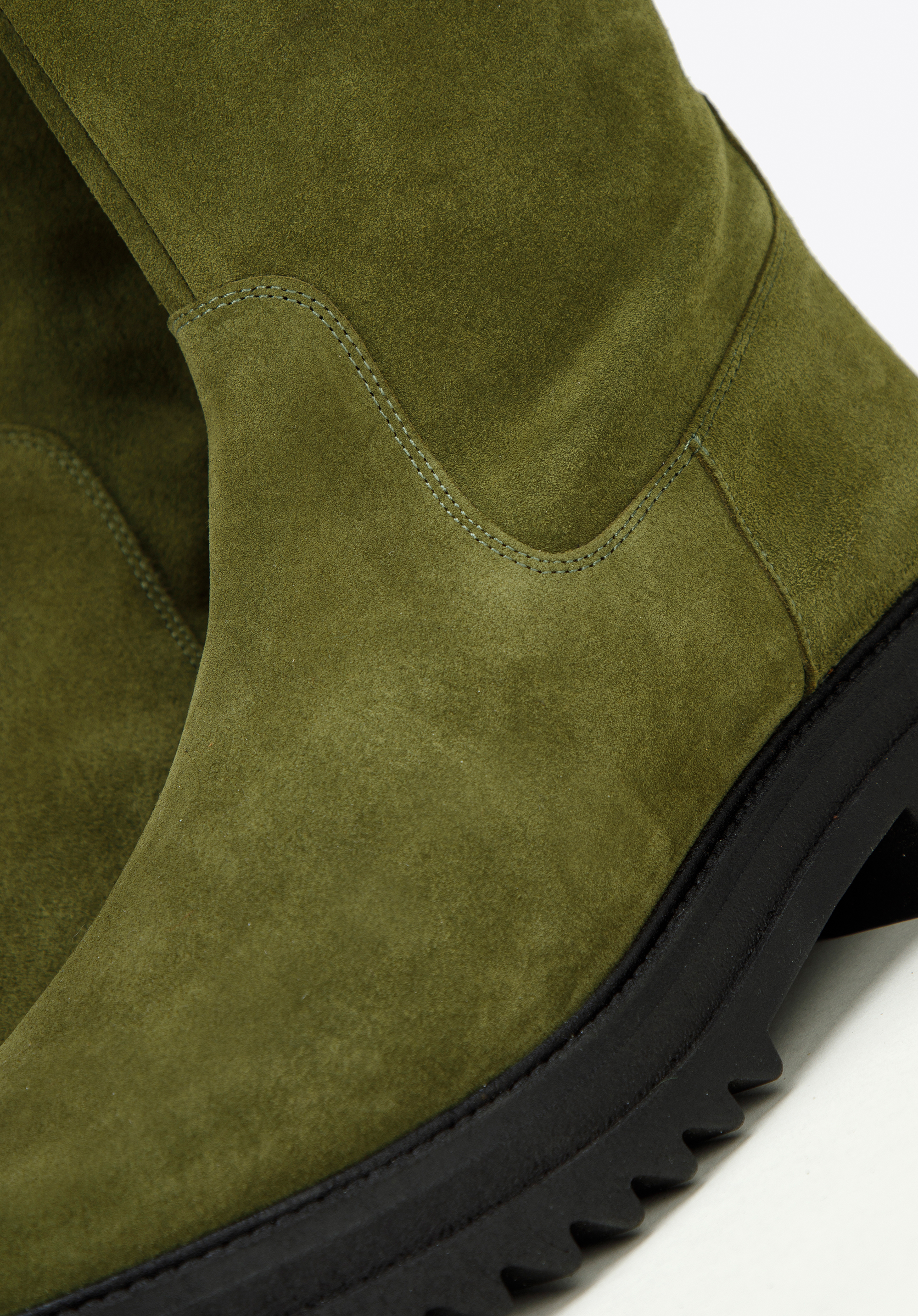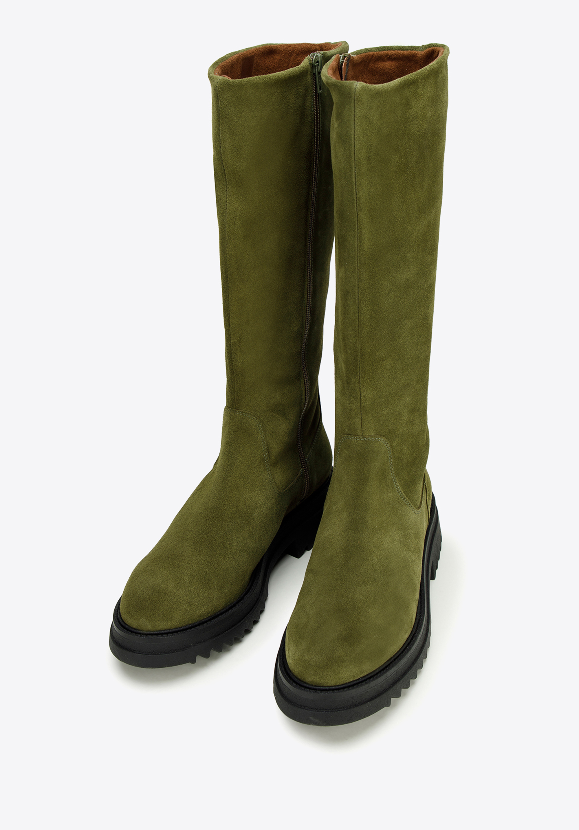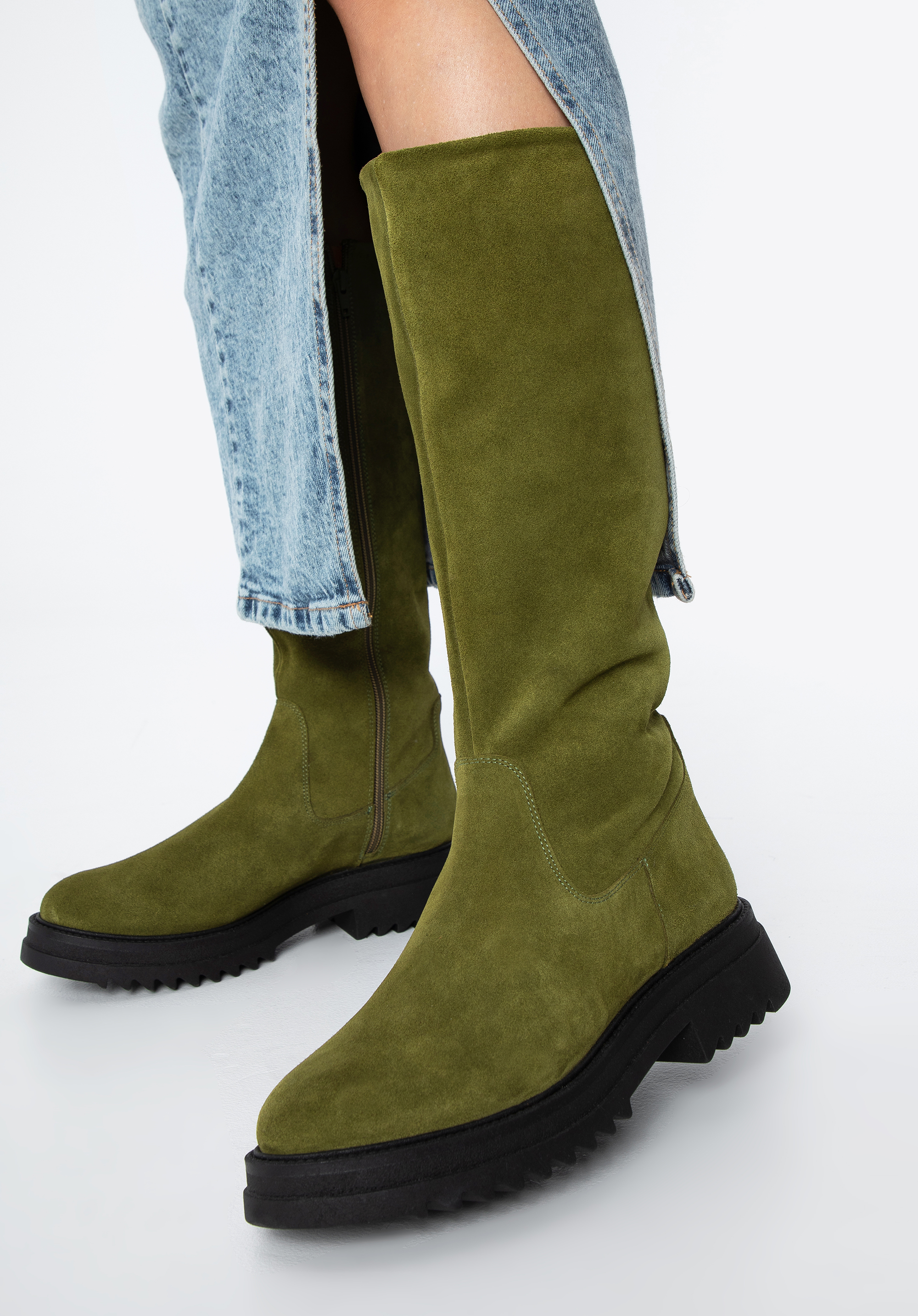 Klare Linien und schlichte Details legen den Fokus auf die klobige Plateausohle dieses kniehohen Stiefels. Eine Plateausohle verleiht jedem Look den perfekten Touch. Diese aus dem hochwertigsten Wildleder in Spanien gefertigten Statement-Schuhe zeichnen sich durch ein modisches Design aus und die Textileinlegesohle schützt vor Witterungseinflüssen. Dank des praktischen seitlichen Reißverschlusses für einen einfachen Einstieg sind sie der ideale Begleiter für Ihre Füße an kalten Wintertagen. Bringen Sie etwas Gemütlichkeit in Ihre Schuhkollektion mit einem Paar klobiger kniehoher Stiefel .