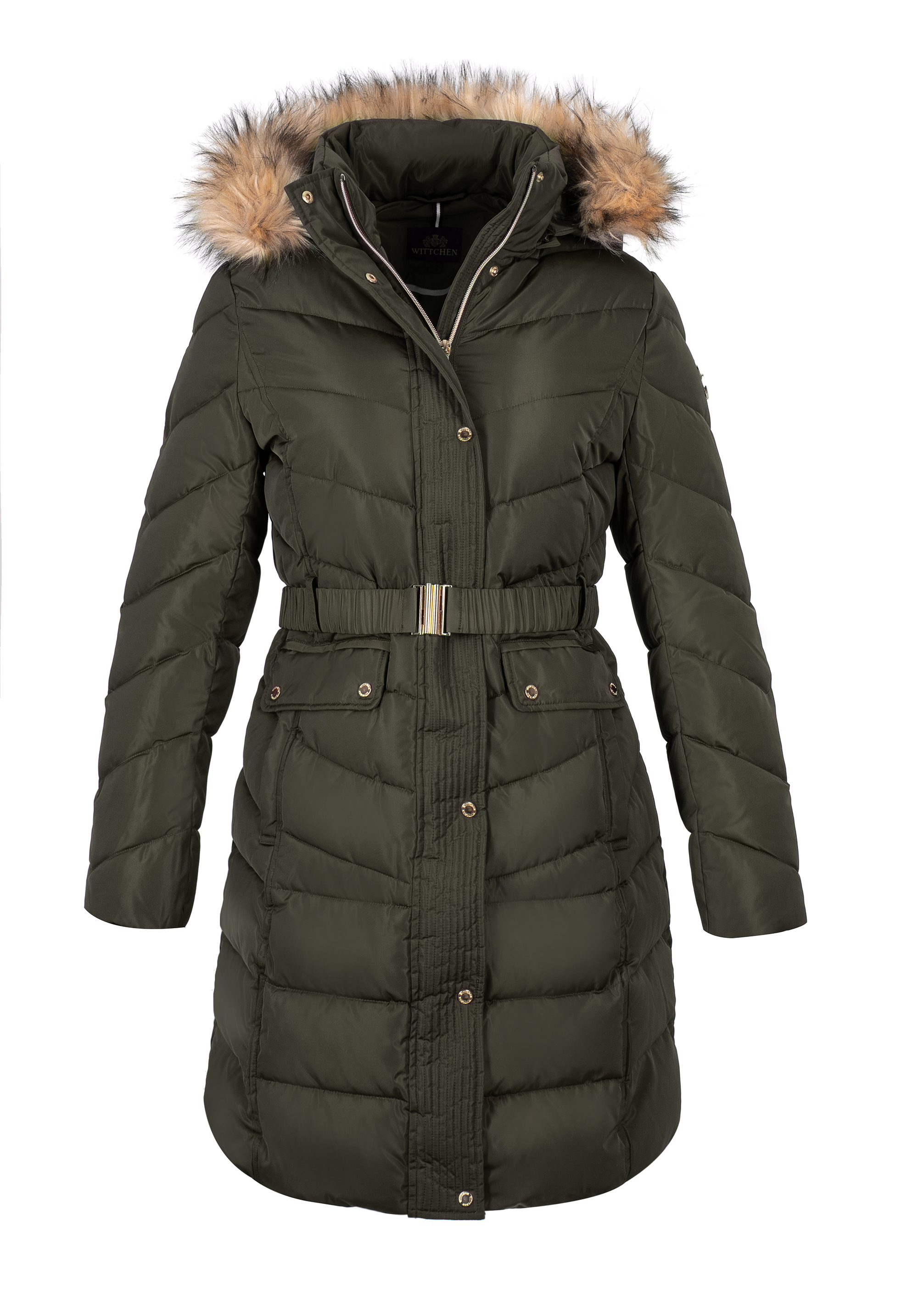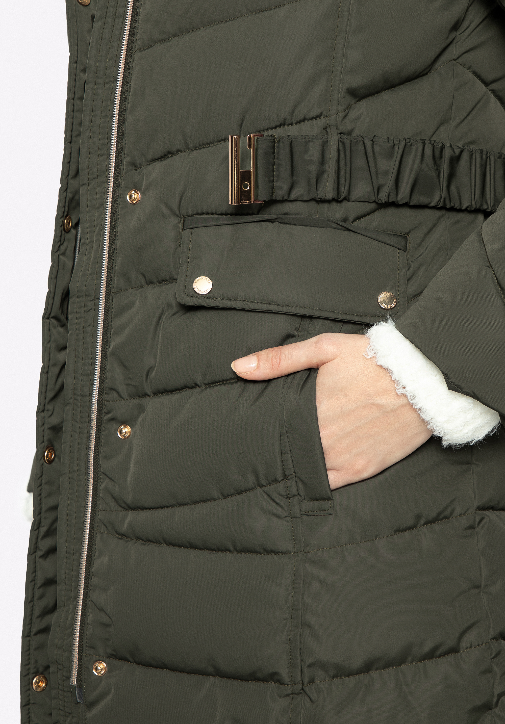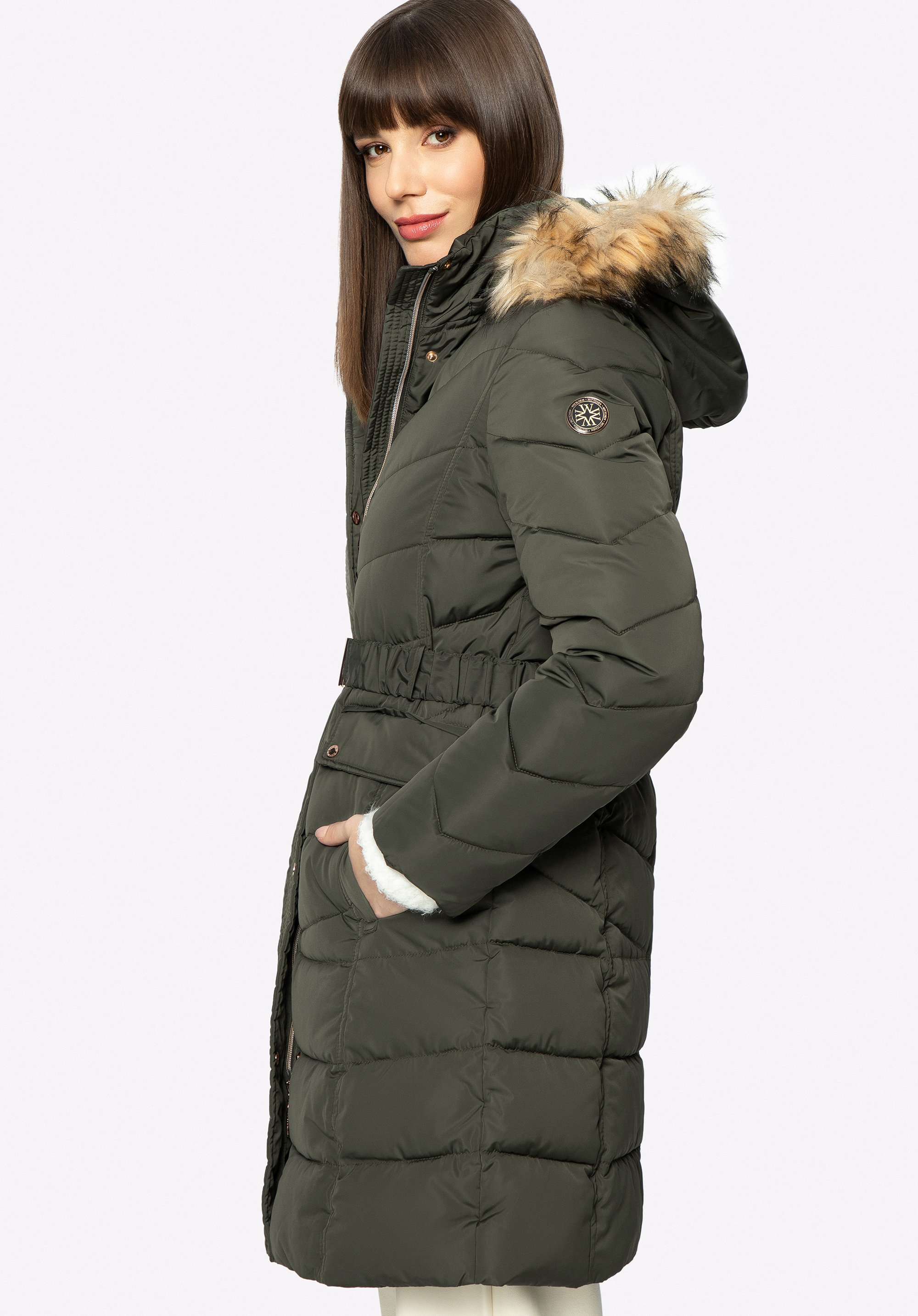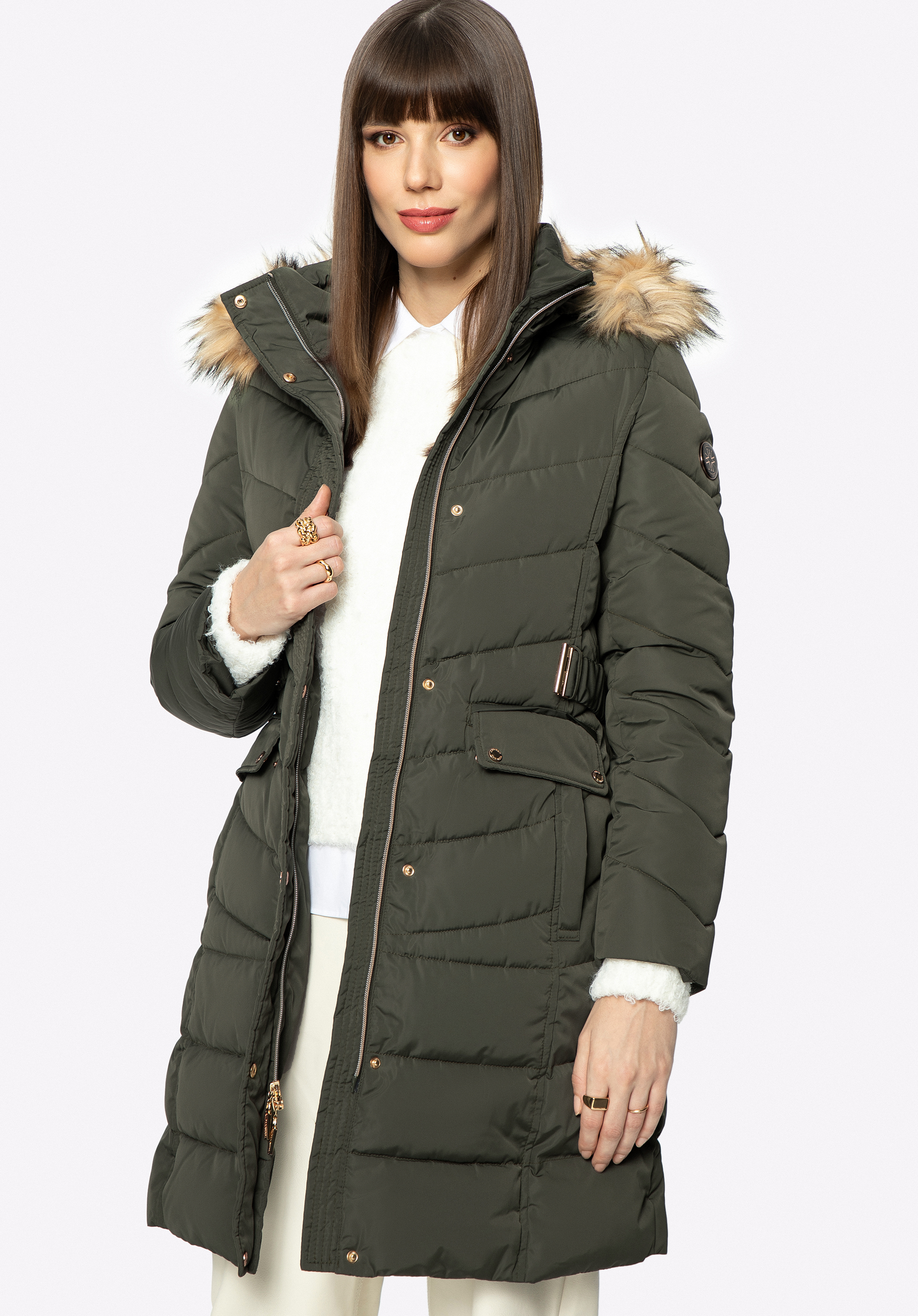 Dieser stilvolle Damenmantel ist eine gute Wahl für Herbst und Winter. Er hat einen leicht verlängerten Schnitt und eine diagonale Steppung, die seinen Charakter unterstreicht. Der zerknitterte Taillengürtel wird mit einer Schnalle geschlossen und betont jeden Tag aufs Neue Ihre Silhouette. Die Kapuze ist mit einem Kunstfellbesatz versehen, den Sie auch abnehmen und nach Belieben tragen können. In den seitlichen Eingrifftaschen können Sie Ihre Hände bequem verstecken und sie vor Kälte schützen. Der Steppmantel für Damen mit Gürtel ist ein zeitloses Accessoire, das sowohl zu Stiefeln mit Absatz als auch zu Plateau-Trappern gut aussieht.