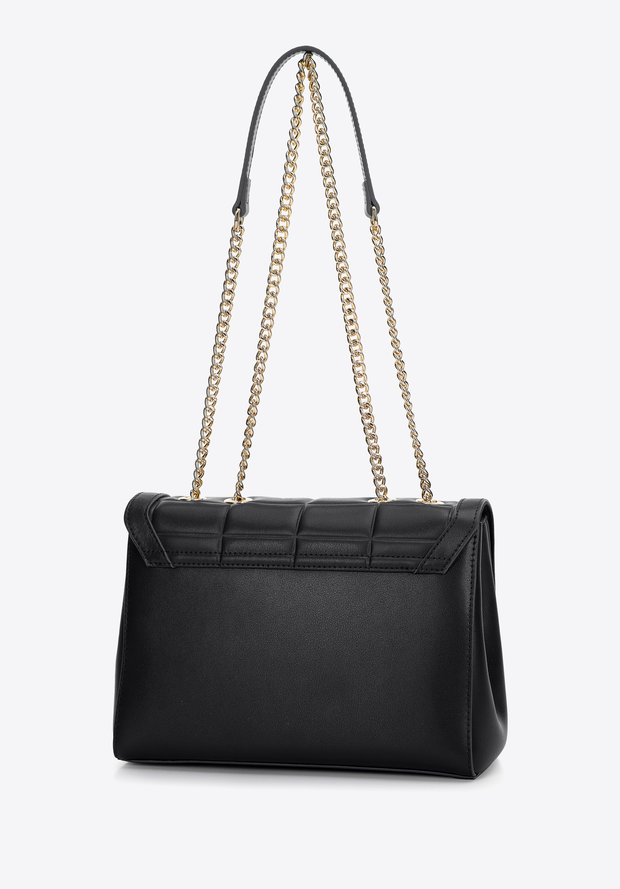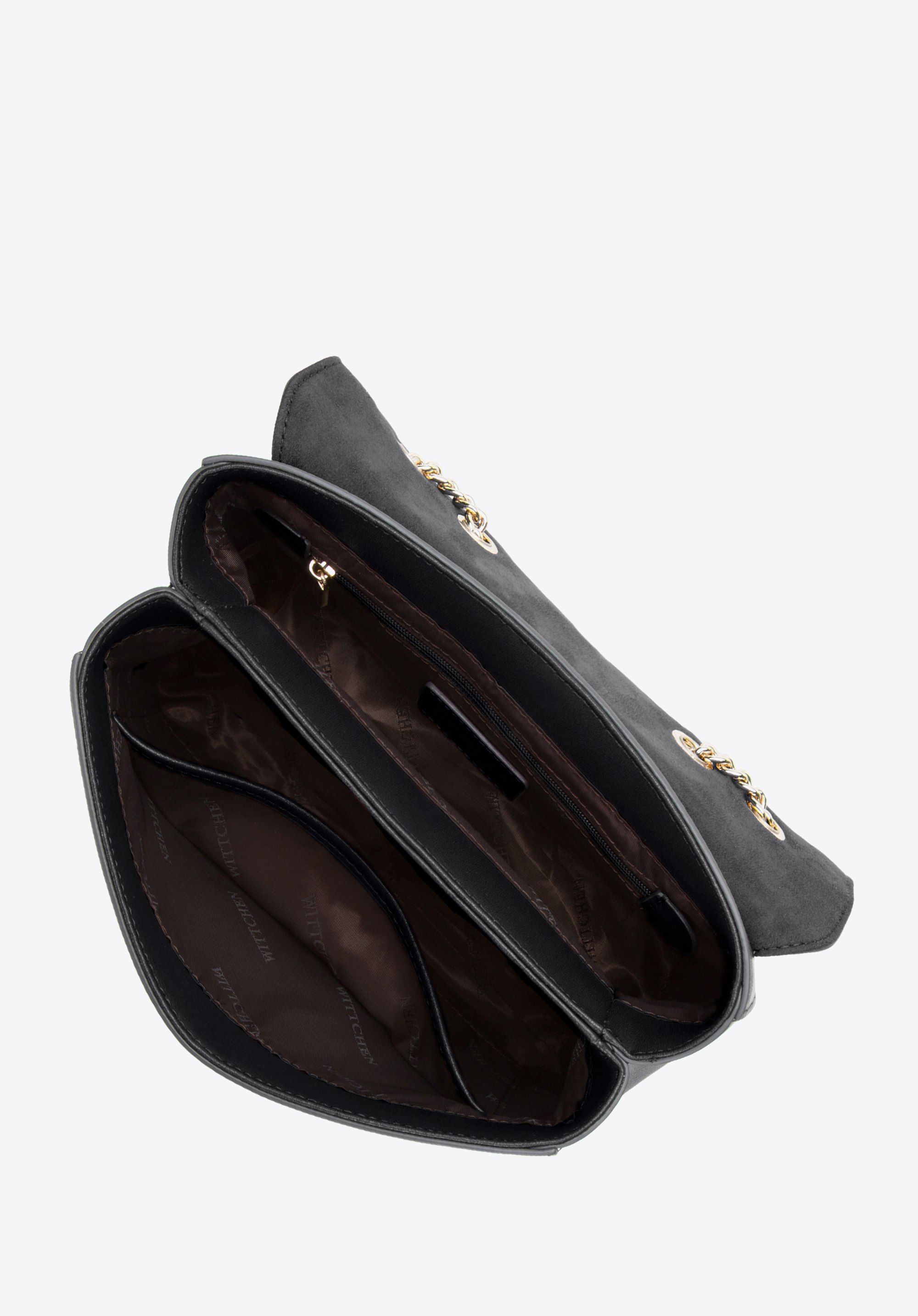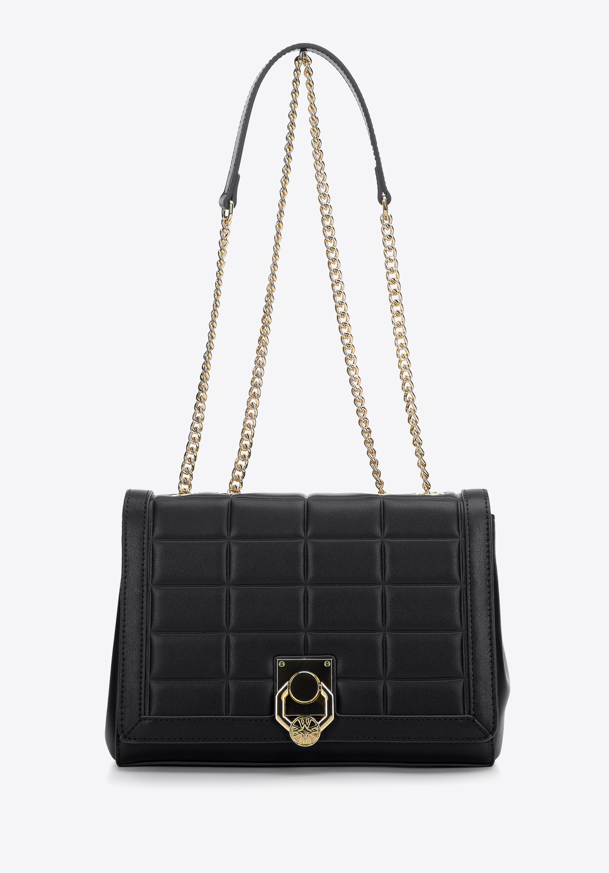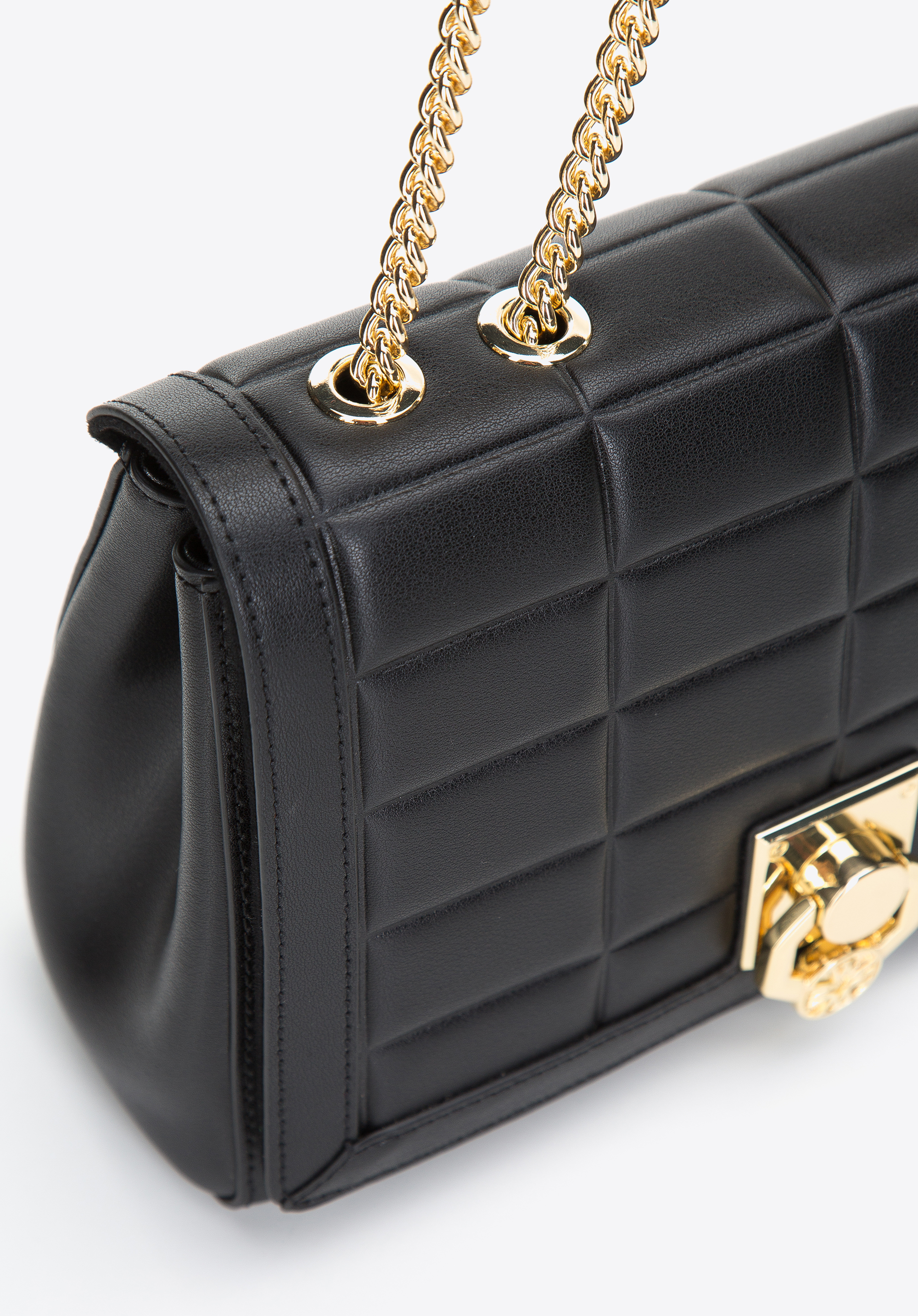 Diese Damenhandtasche ist ein äußerst originelles Accessoire für jede Frau. Sie ist aus hochwertigem Naturleder gefertigt und mit einer auffälligen, glänzenden Monogrammschnalle geschmückt. Die geometrisch gesteppte Klappe und die feste Struktur unterstreichen ihren Charakter. Der Kettenriemen lässt sich zur Hälfte umlegen oder in voller Länge nutzen und wie eine Crossbody-Tasche aufhängen. In das Innere der Tasche passen Handy und Portemonnaie, aber auch der Lieblingslippenstift und einige andere Kleinigkeiten. Dieses Modell passt sowohl zu Jeans und klassischem Hemd als auch zu eleganten Abendgarderobe. Die Ledertasche für Damen mit dekorativer Kettenschnalle ist eine originelle Handtasche, die in Ihrem Kleiderschrank nicht fehlen darf.