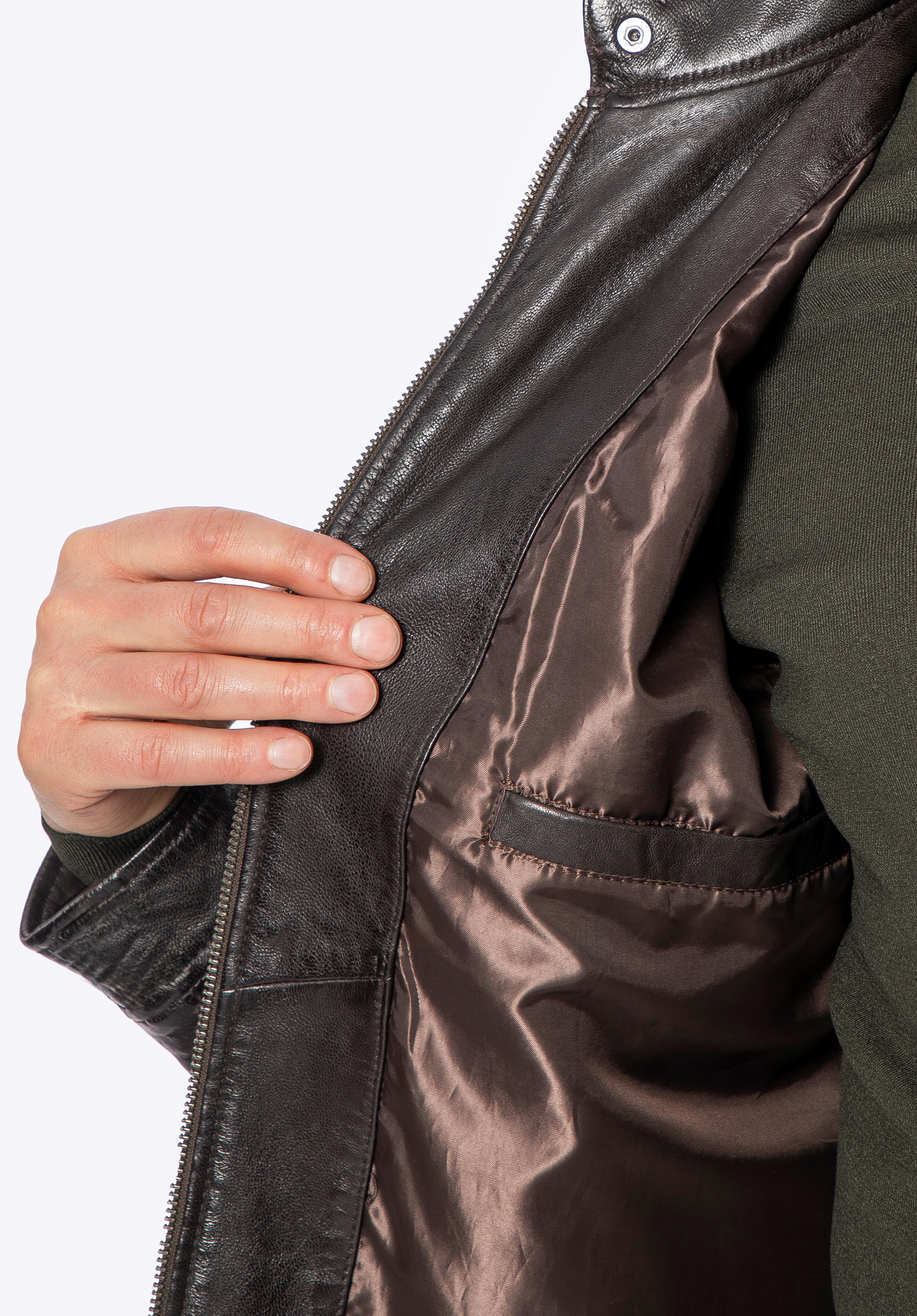 Machen Sie sich bereit, Ihre Garderobe aufzuwerten! Diese Herrenjacke aus natürlichem Schafsleder kombiniert zeitloses Design mit modernen Details, die Ihren Stil unterstreichen. Metallakzente, darunter das Logo der Marke, verleihen ihr einen unverwechselbaren Charakter. Dekorative Steppeinsätze an Schultern und Ärmeln verleihen einen robusten, maskulinen Touch, während die verstellbaren Bündchen mit Reißverschluss für eine perfekte Passform sorgen.