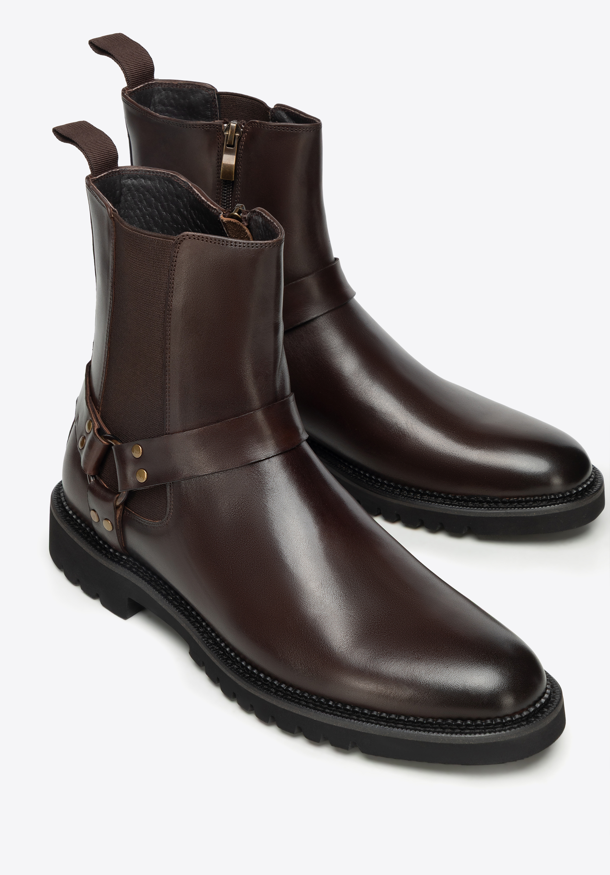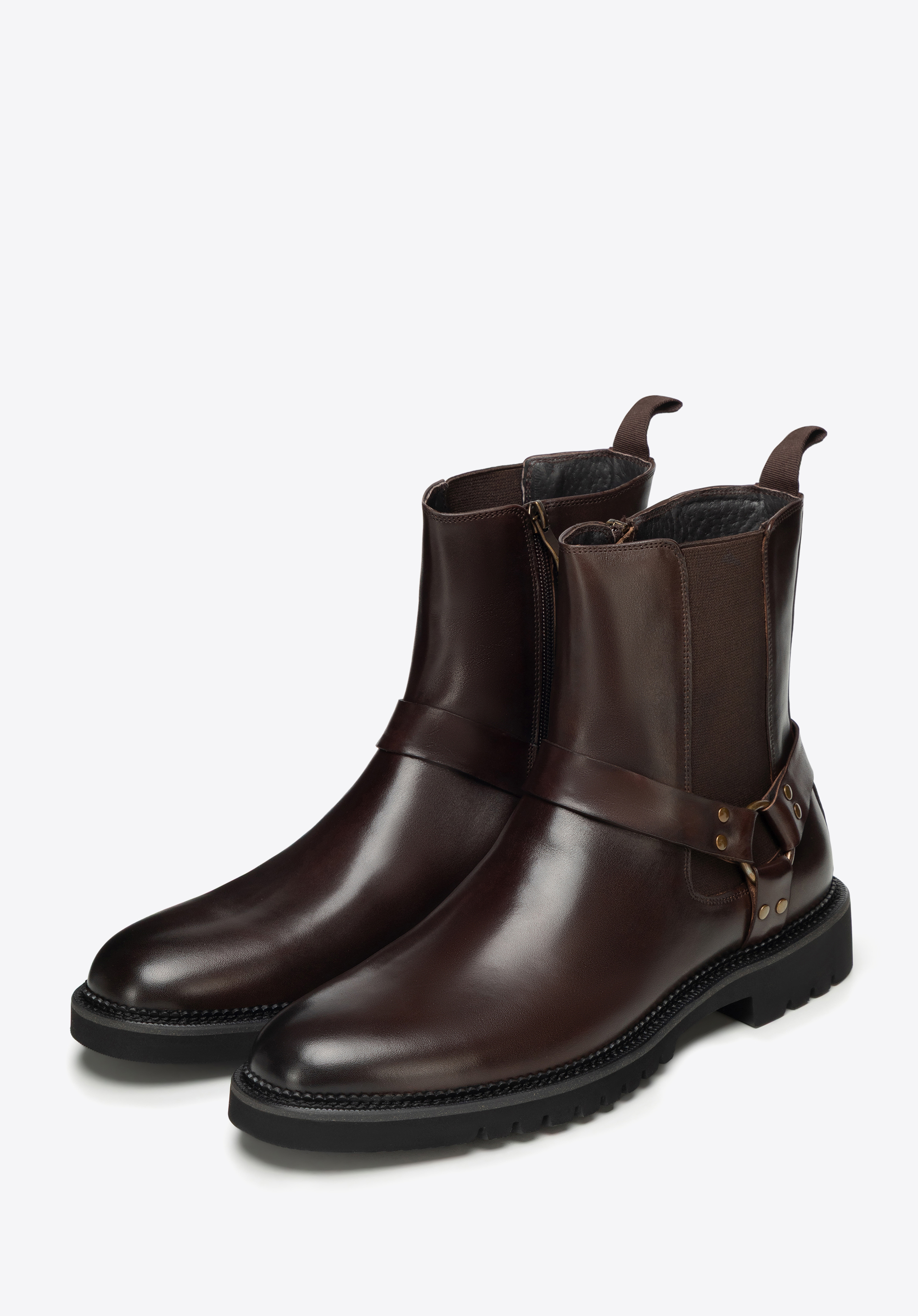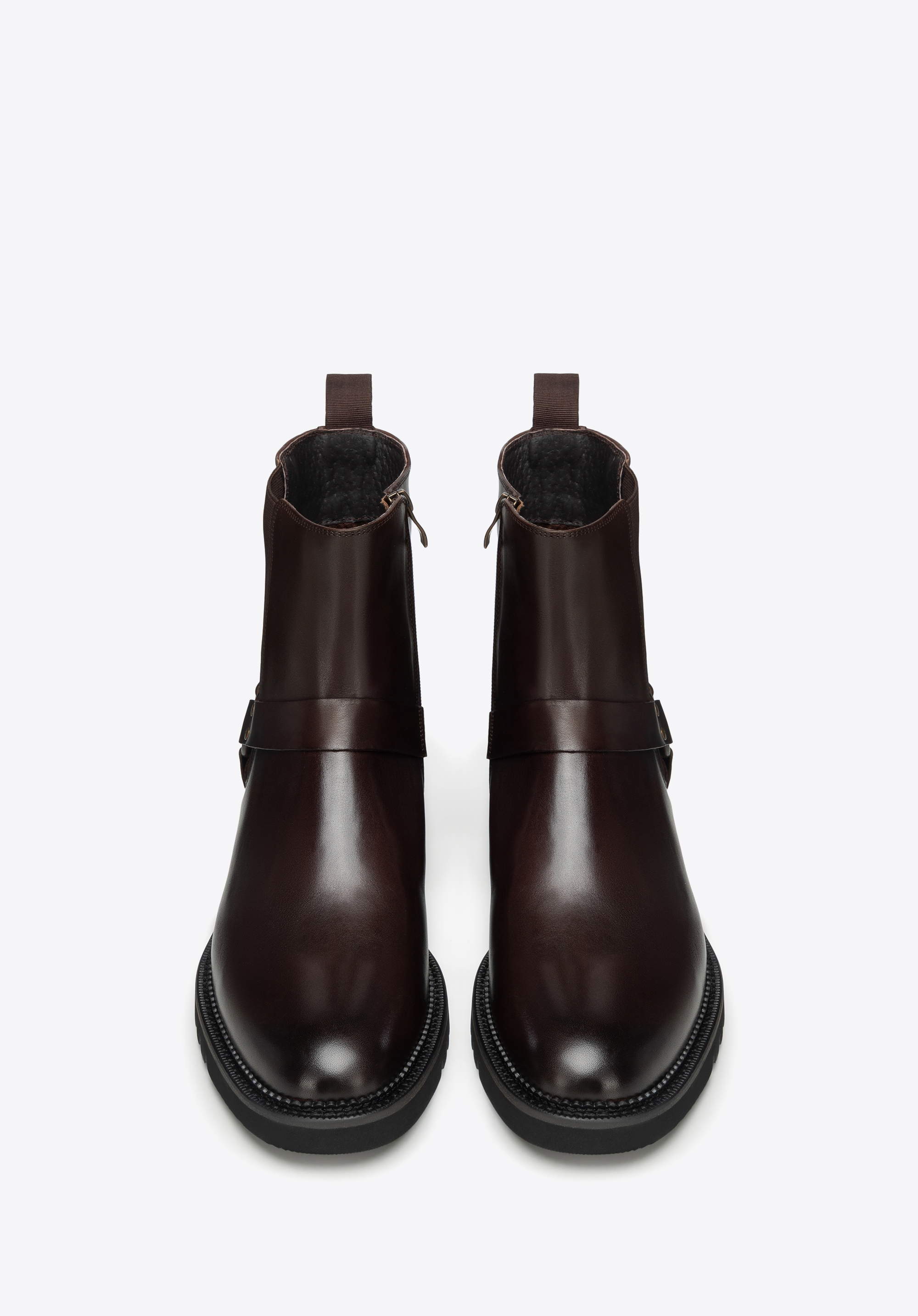Diese Herren-Lederstiefeletten mit Zierriemen sind die perfekte Herbst-Winter-Option für alle, die elegant aussehen und gleichzeitig bequem sein möchten. Dank des innenliegenden Reißverschlusses lassen sie sich leicht anziehen, der Zierriemen setzt einen modischen Akzent, und das Lederfutter sowie die Profilsohle sorgen für Stabilität im hektischen Stadtleben.