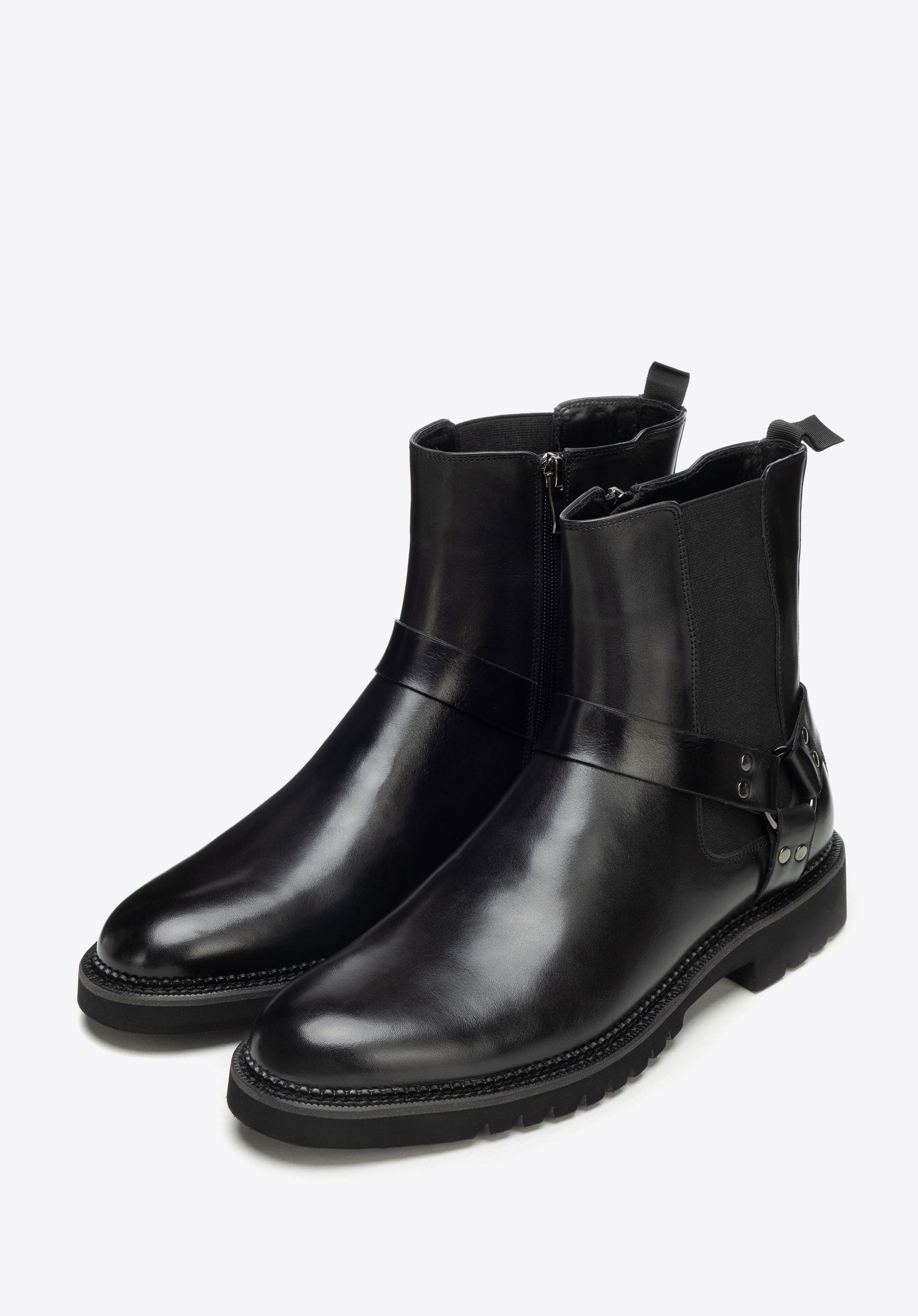 Entdecken Sie die perfekte Kombination aus zeitlosem Design und Alltagskomfort mit diesen Chelsea Boots aus hochwertigem Leder für Herren . Die mandelförmige Spitze verleiht Ihrem Fuß eine schlanke, elegante Silhouette, während das Design mit dekorativem Riemen einen Hauch moderner Raffinesse verleiht. Ein Reißverschluss an der Innenseite erleichtert das An- und Ausziehen, ohne die edle Optik zu beeinträchtigen. Der flache Absatz und die Laufsohle sorgen für Stabilität und sicheres Auftreten auf jedem Untergrund.