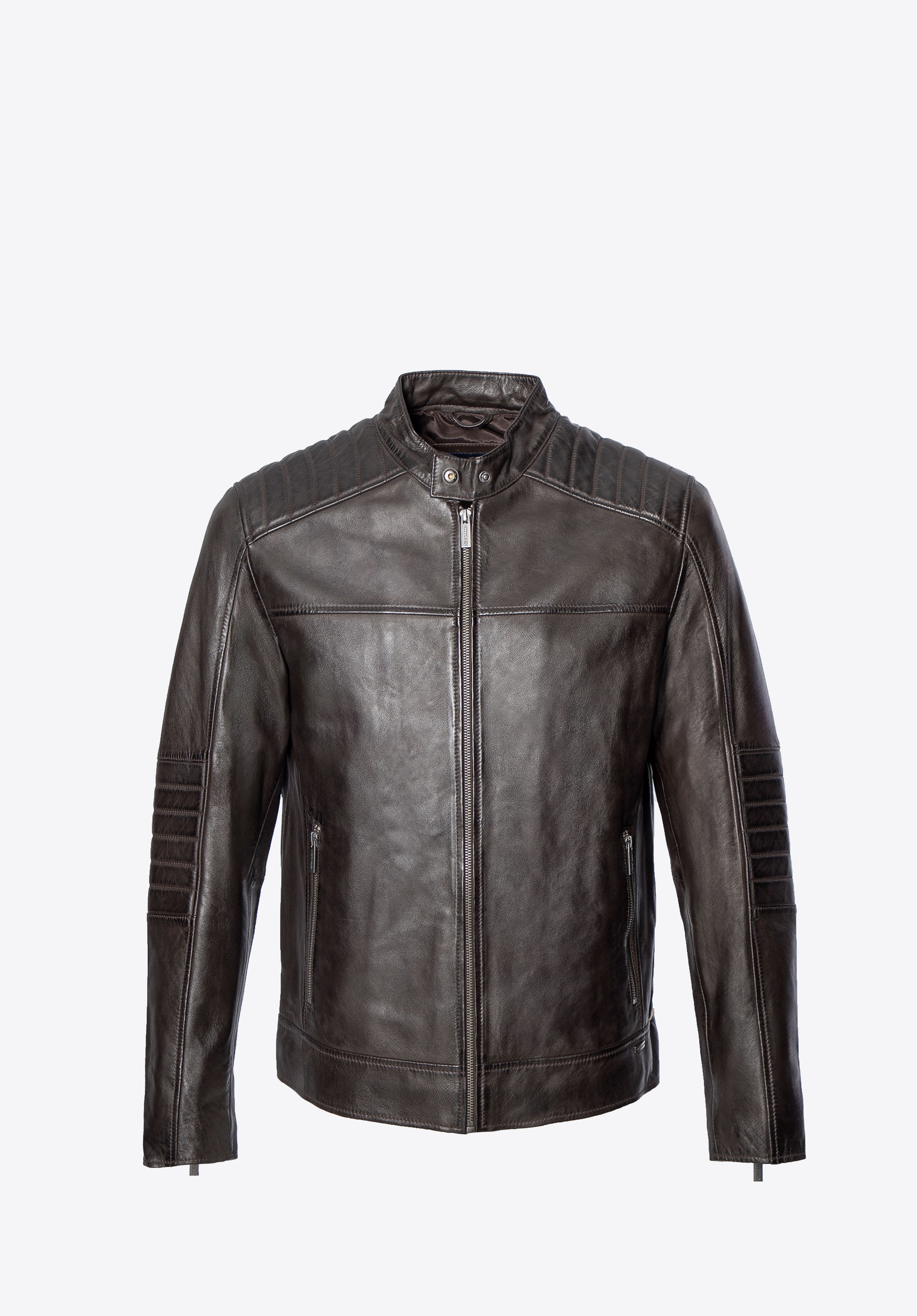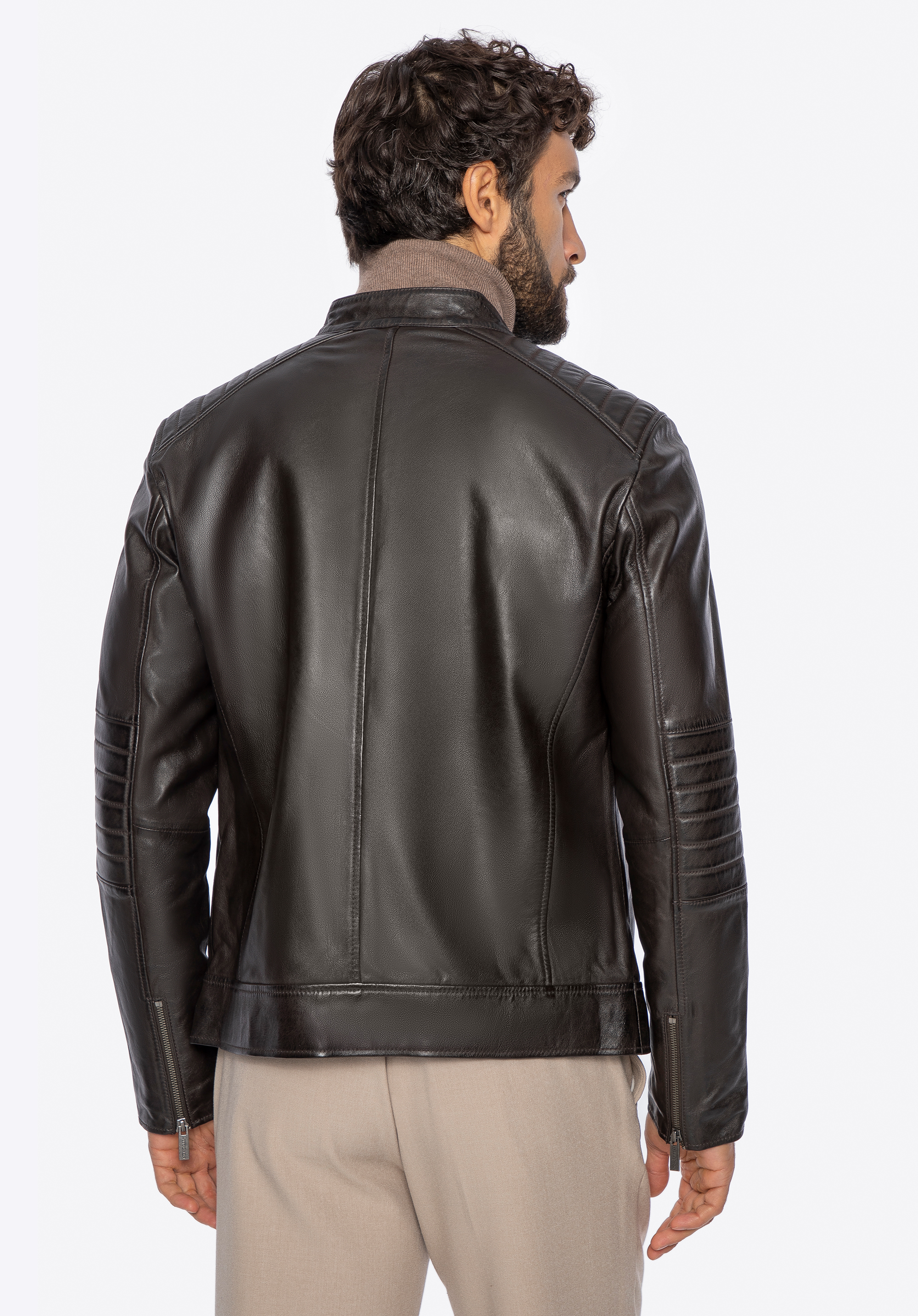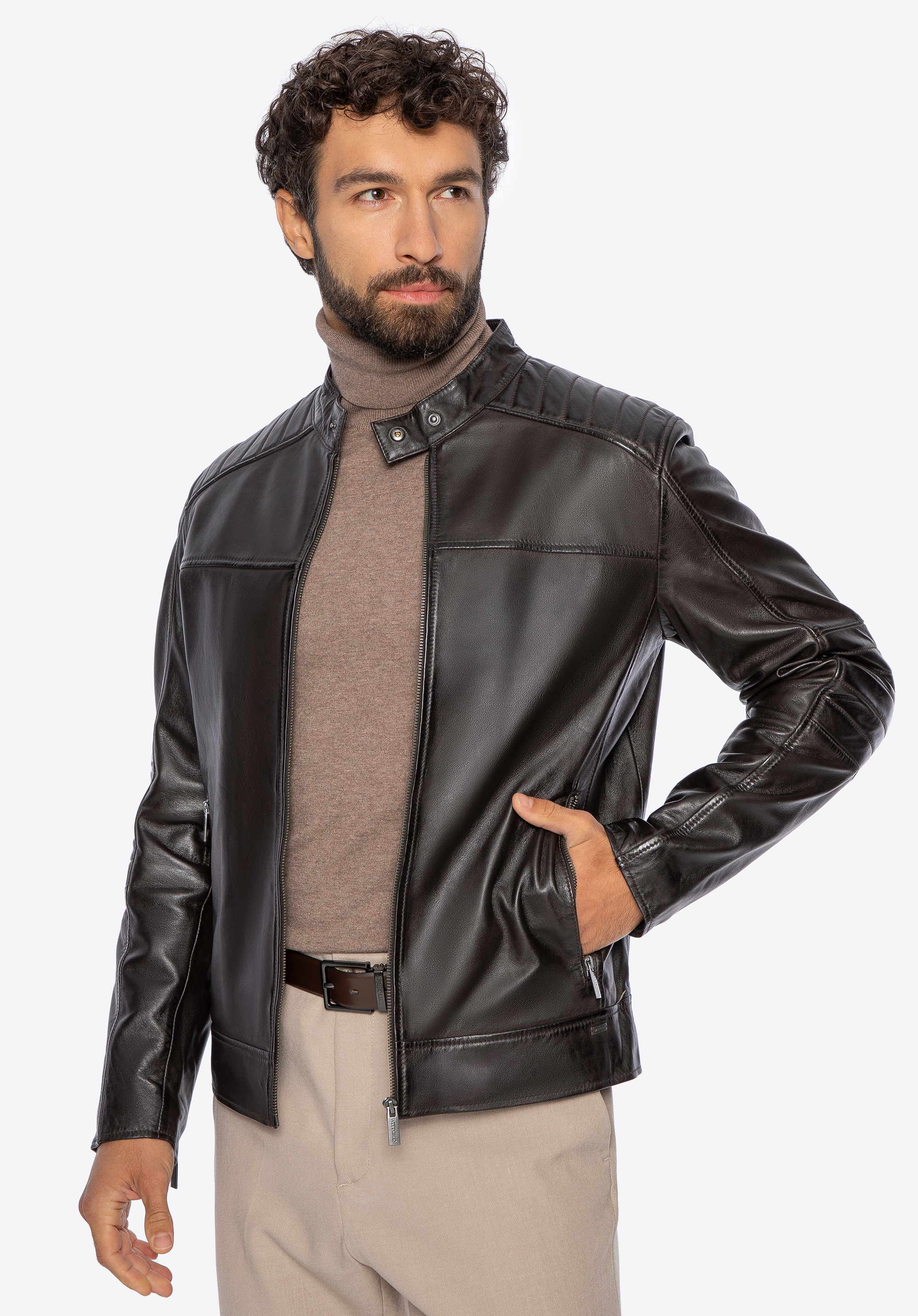 Wählen Sie eine Jacke , die Luxus und zeitloses Design perfekt vereint. Sie ist aus Schafsleder gefertigt und überzeugt durch Weichheit, Strapazierfähigkeit und eine makellose Passform. Der klassische Schnitt wird durch Nähte an Schultern und Ärmeln aufgewertet, die Charakter verleihen und einen ausgesprochen maskulinen Stil betonen. Ein dezentes Metalllogo an der Seite und die charakteristischen Reißverschlüsse unterstreichen subtil die Liebe zum Detail. Praktische Features – zwei Außentaschen mit Reißverschluss und zwei Innentaschen (eine mit Reißverschluss, eine offen) – machen diese Jacke ebenso funktional wie stilvoll.