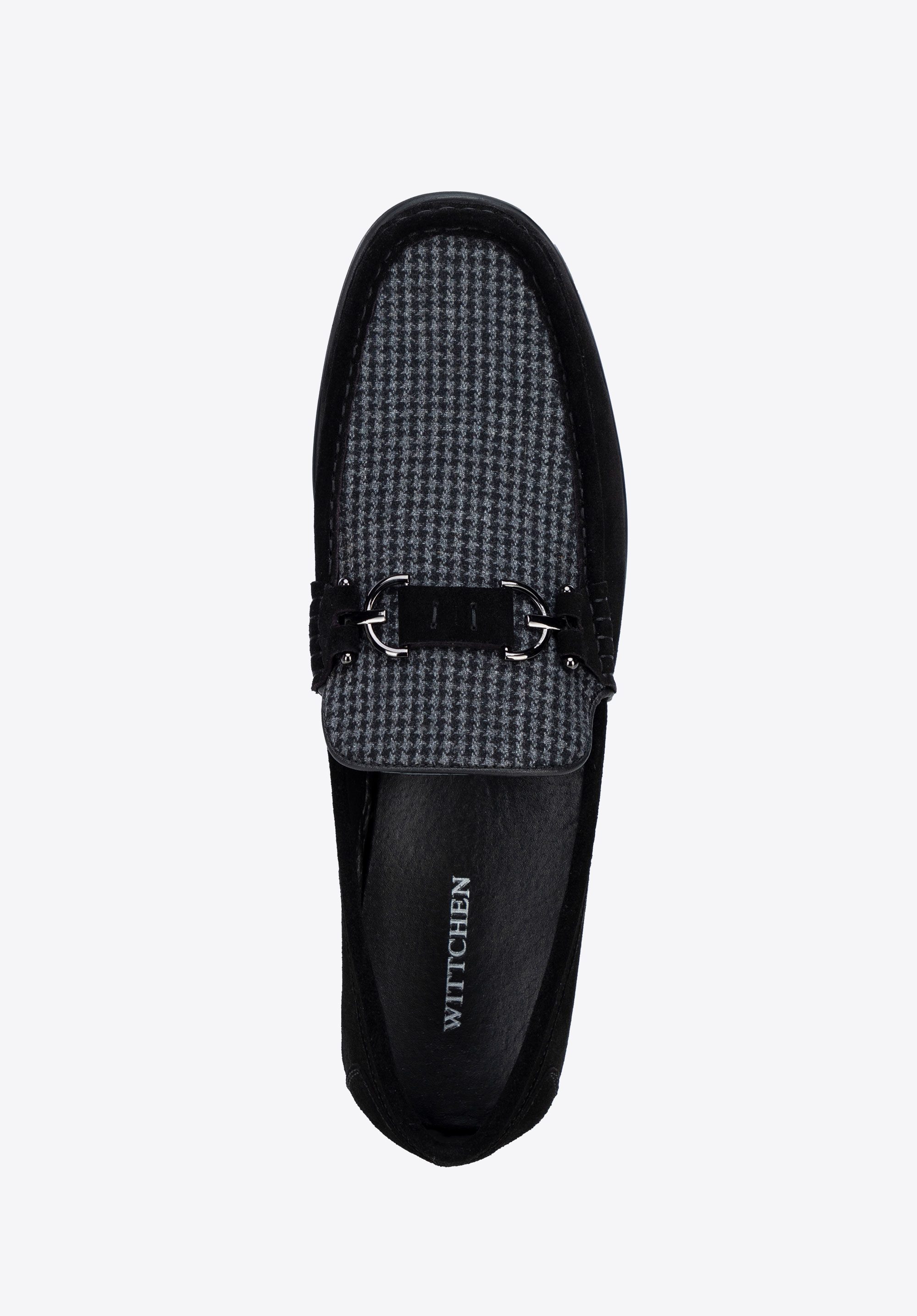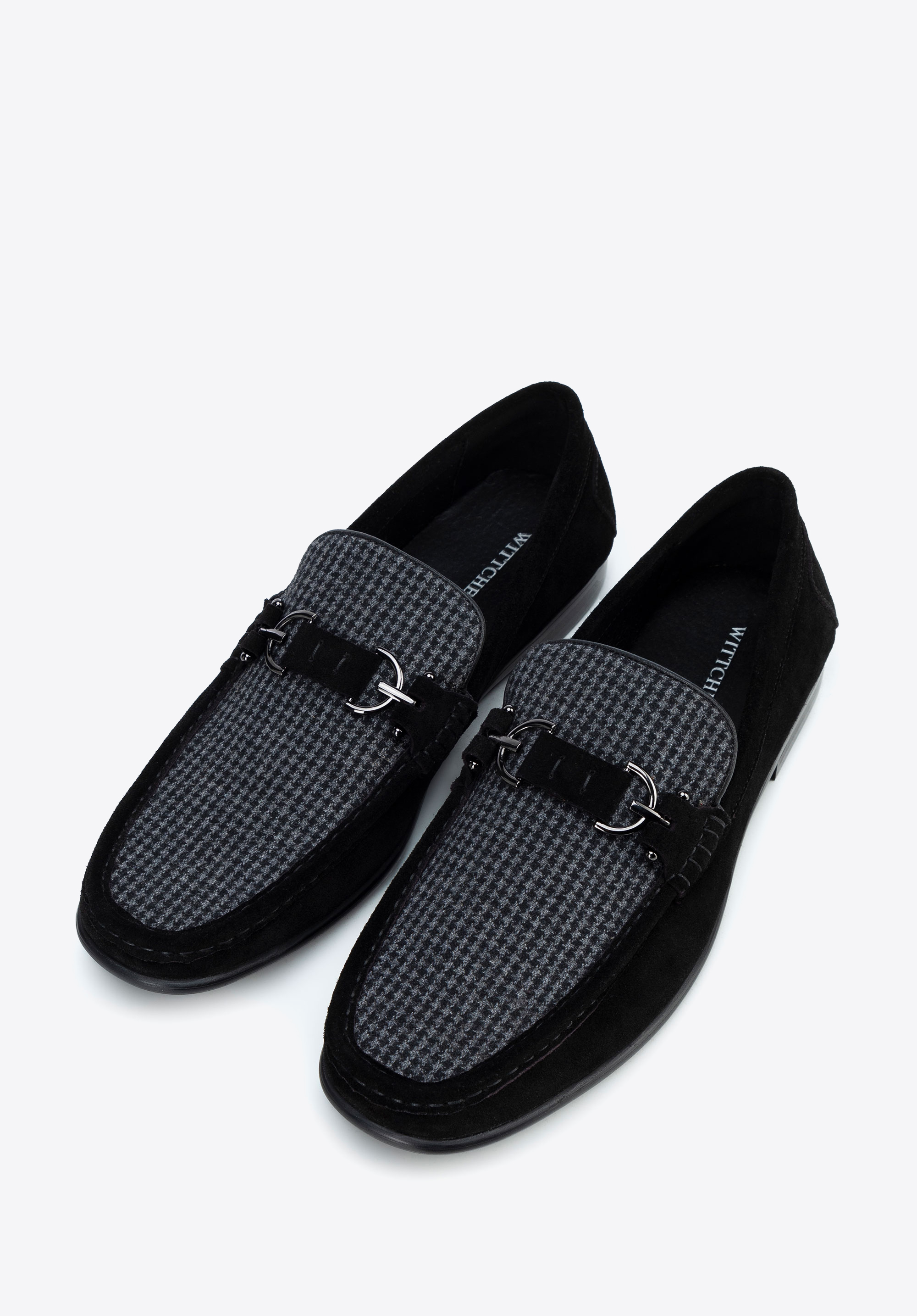 Diese Mokassins sind die perfekte Kombination aus Eleganz und Komfort. Sie bestehen aus Leder und Textil und sind mit einem dezenten Karomuster und einer dekorativen Schnalle verziert, die für einen raffinierten Touch sorgen. Der Schlupfstil ist bequem und praktisch, während die Innensohle aus Leder und das weiche Innenfutter den ganzen Tag über für Komfort sorgen. Dank der robusten Sohle wird jeder Schritt zum Vergnügen. Dieser Schuh passt sowohl zu legeren als auch zu eleganten Outfits.
