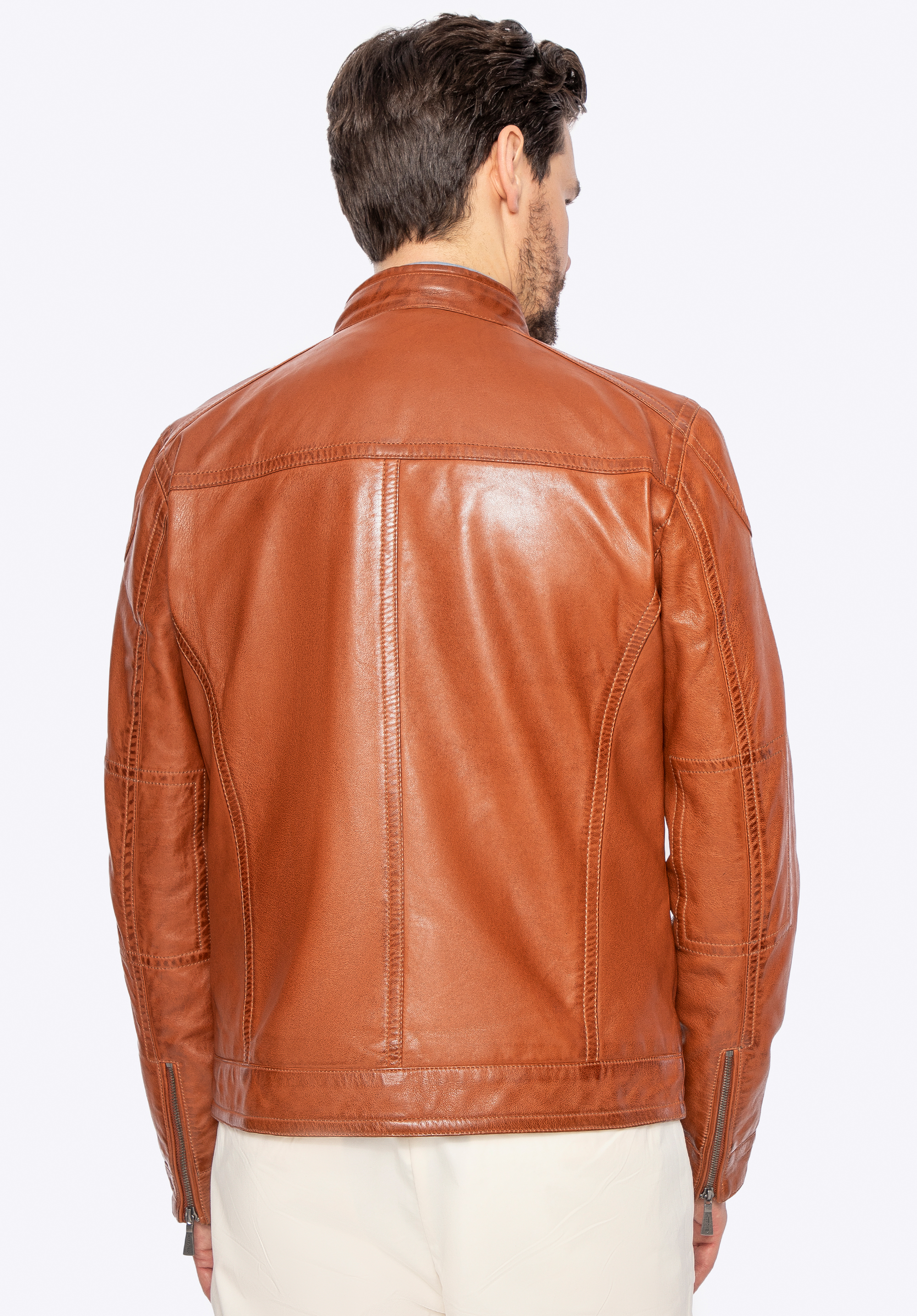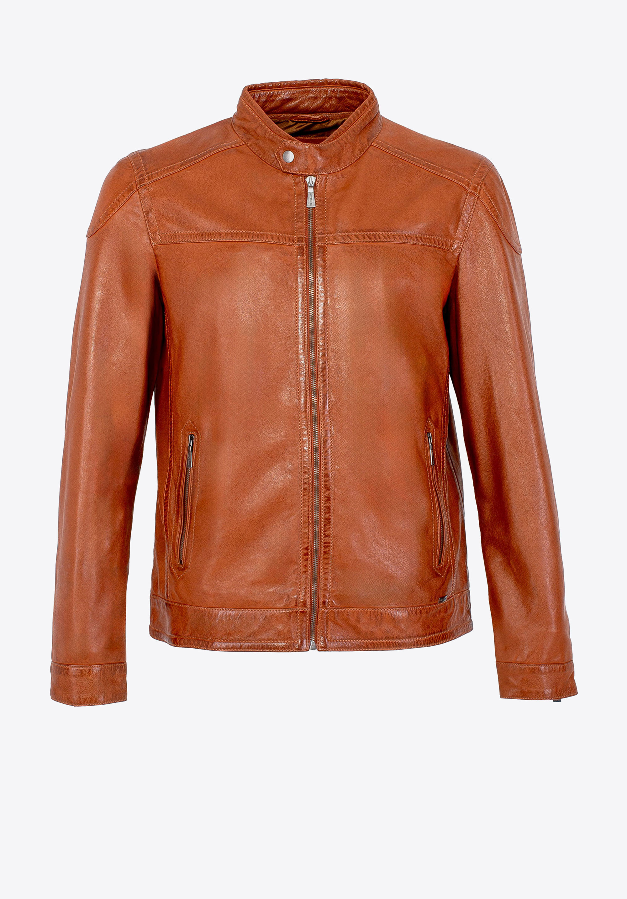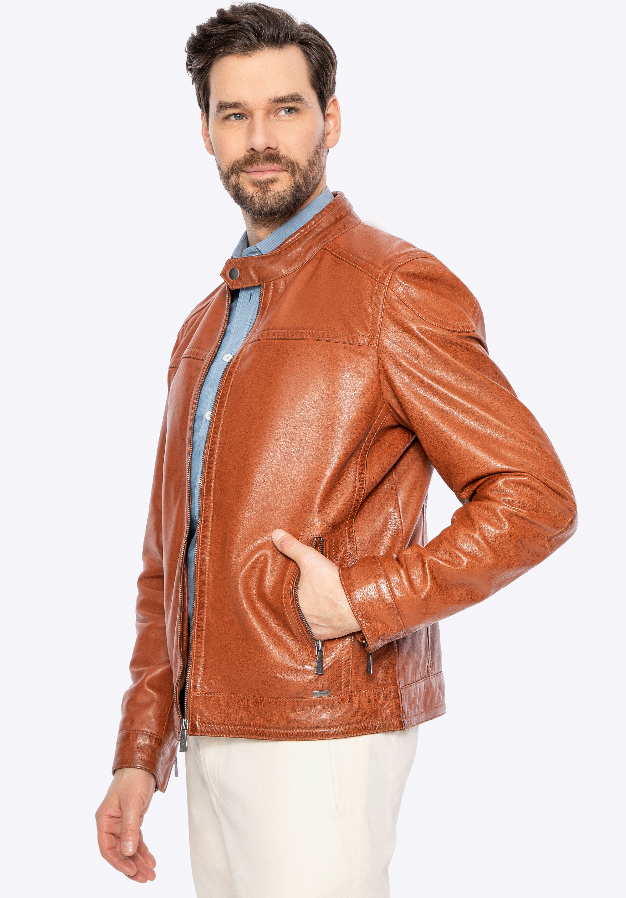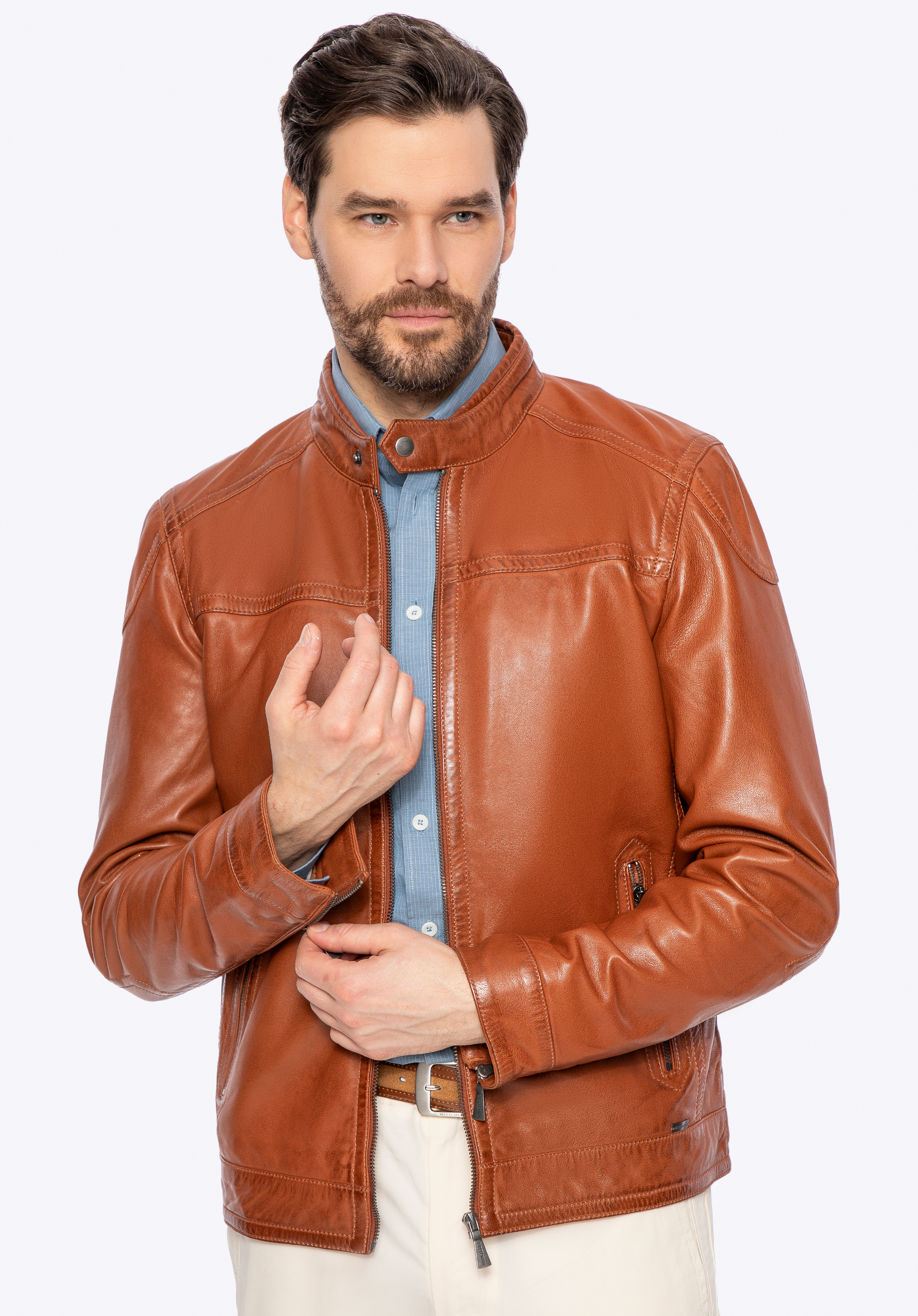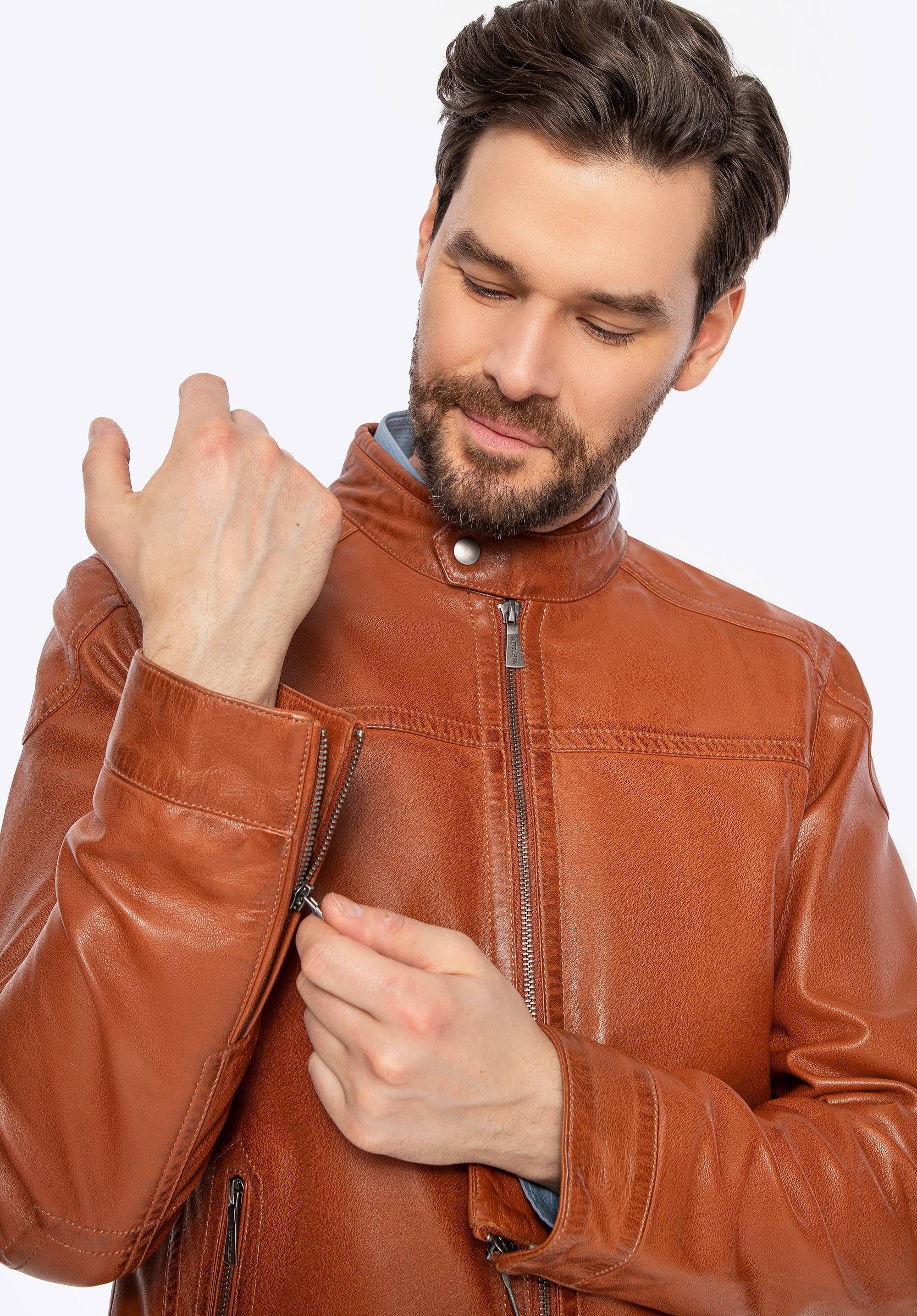 Entdecken Sie die Herrenjacke , die Aufmerksamkeit auf sich zieht und Ihren Stil unterstreicht. Sie ist aus natürlichem Schafsleder gefertigt und zeichnet sich durch ihre Weichheit und Haltbarkeit aus. Metalldetails – das Markenlogo an der Seite und Markenreißverschlüsse – verleihen eine unverwechselbare Note. Dieses Kleidungsstück wird mit einem robusten Reißverschluss geschlossen, verfügt über einen hohen Kragen mit Druckknopfverschluss und Reißverschlüsse an den Manschetten und verbindet Eleganz mit einem urbanen Touch. Praktische Taschen – zwei vertikale Reißverschlusstaschen und zwei Innentaschen (eine mit Reißverschluss, die andere offen) – sorgen für Funktionalität und Komfort.