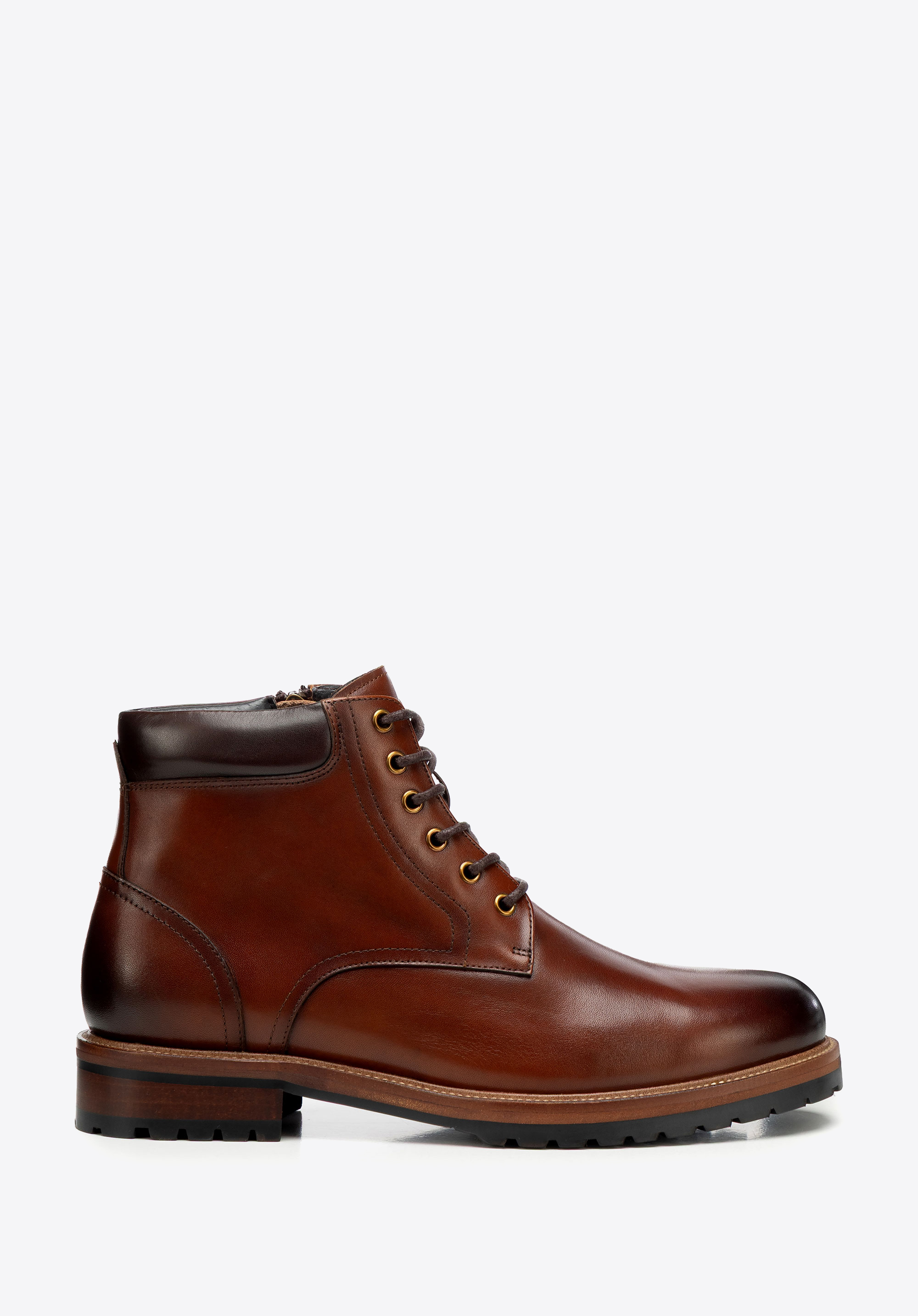 Entdecken Sie die perfekte Mischung aus klassischem Stil und modernem Komfort mit Herrenstiefeln aus hochwertigem Naturleder . Die schlanke mandelförmige Spitze verleiht den Stiefeln eine elegante Silhouette, während die durchdachten Details Tragekomfort mit praktischen Lösungen verbinden. Seitliche Reißverschlüsse ermöglichen schnelles An- und Ausziehen, während die Schnürung vorne für einen perfekten Sitz sorgt. Der flache Absatz und die robuste Gummisohle sorgen für Stabilität und Sicherheit bei jedem Schritt.