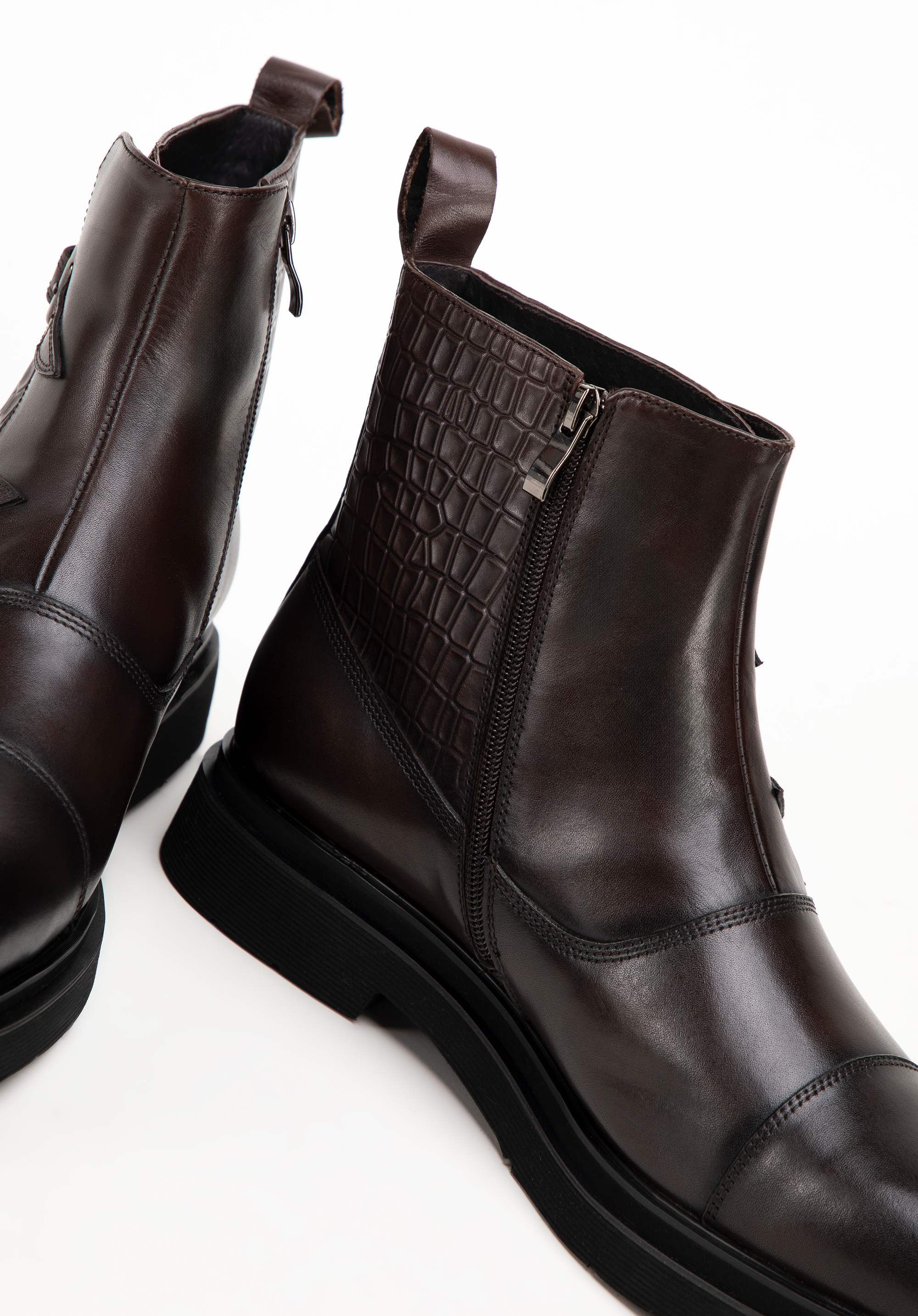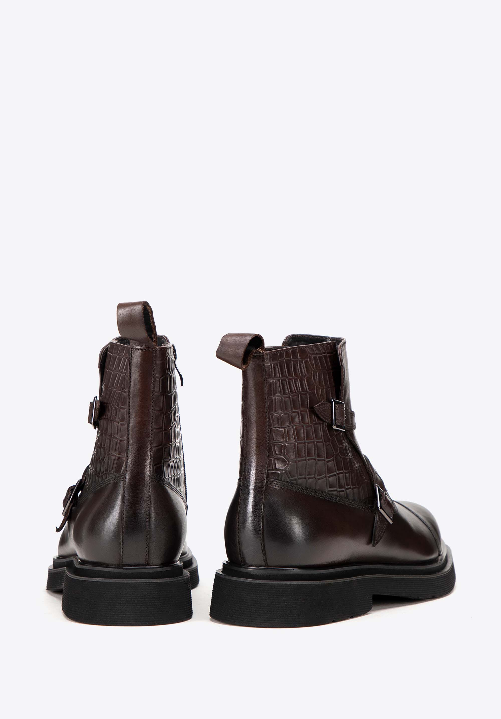 Diese Chelsea-Boots für Herren sind der Inbegriff von Eleganz und Komfort. Sie bestehen aus hochwertigem, natürlichem Vollnarbenleder und sind mit Kroko-Details verziert. Das weiche Lederfutter und die mandelförmige Spitze sorgen den ganzen Tag über für unvergleichlichen Komfort. Der flache Absatz und das strapazierfähige Gummi an der Ferse sorgen für Stabilität. Ein praktischer Reißverschluss erleichtert das Anziehen, während zwei dekorative Schnallen und Nähte an der Spitze den Stiefeln einen unverwechselbaren und anspruchsvollen Look verleihen. Die perfekte Kombination aus Stil und Funktionalität für den modernen Mann.