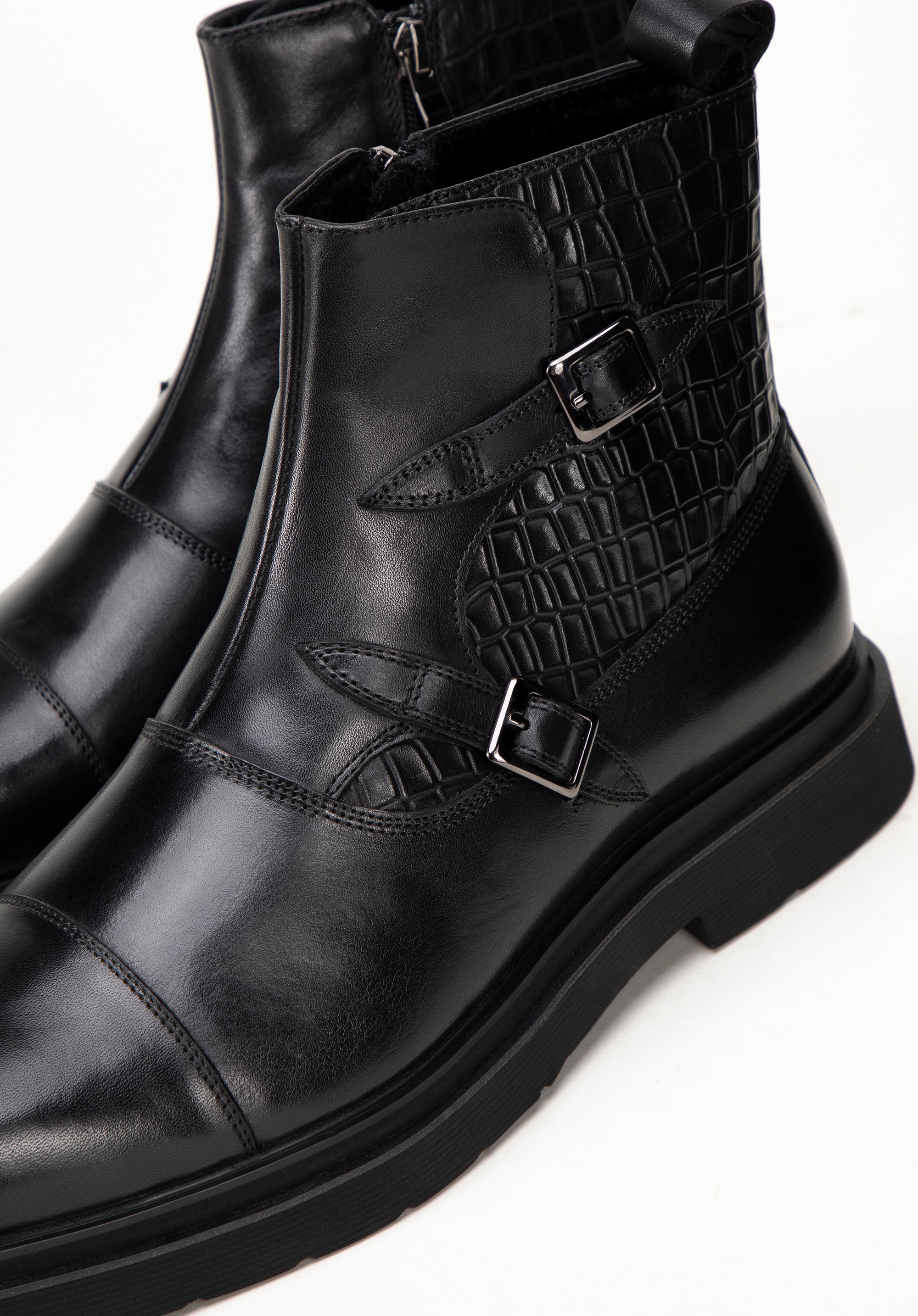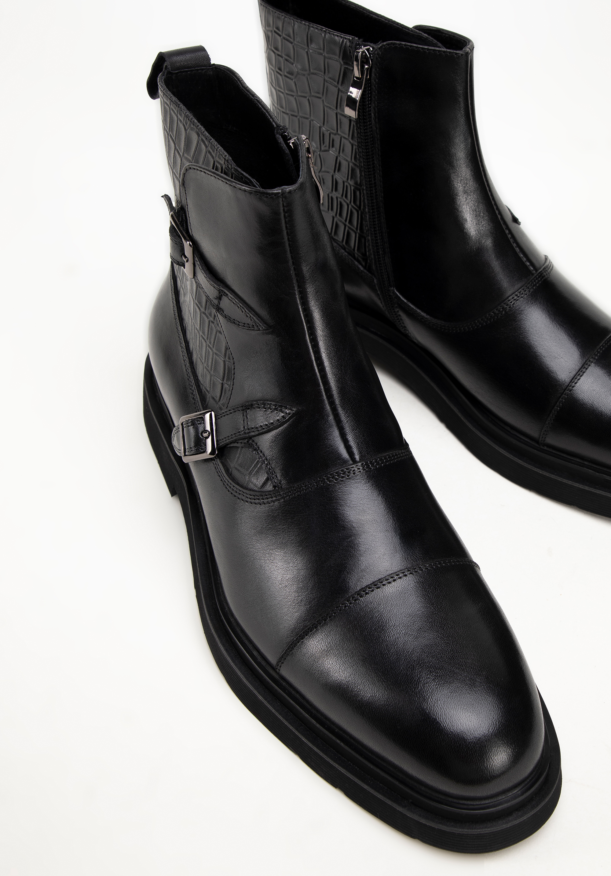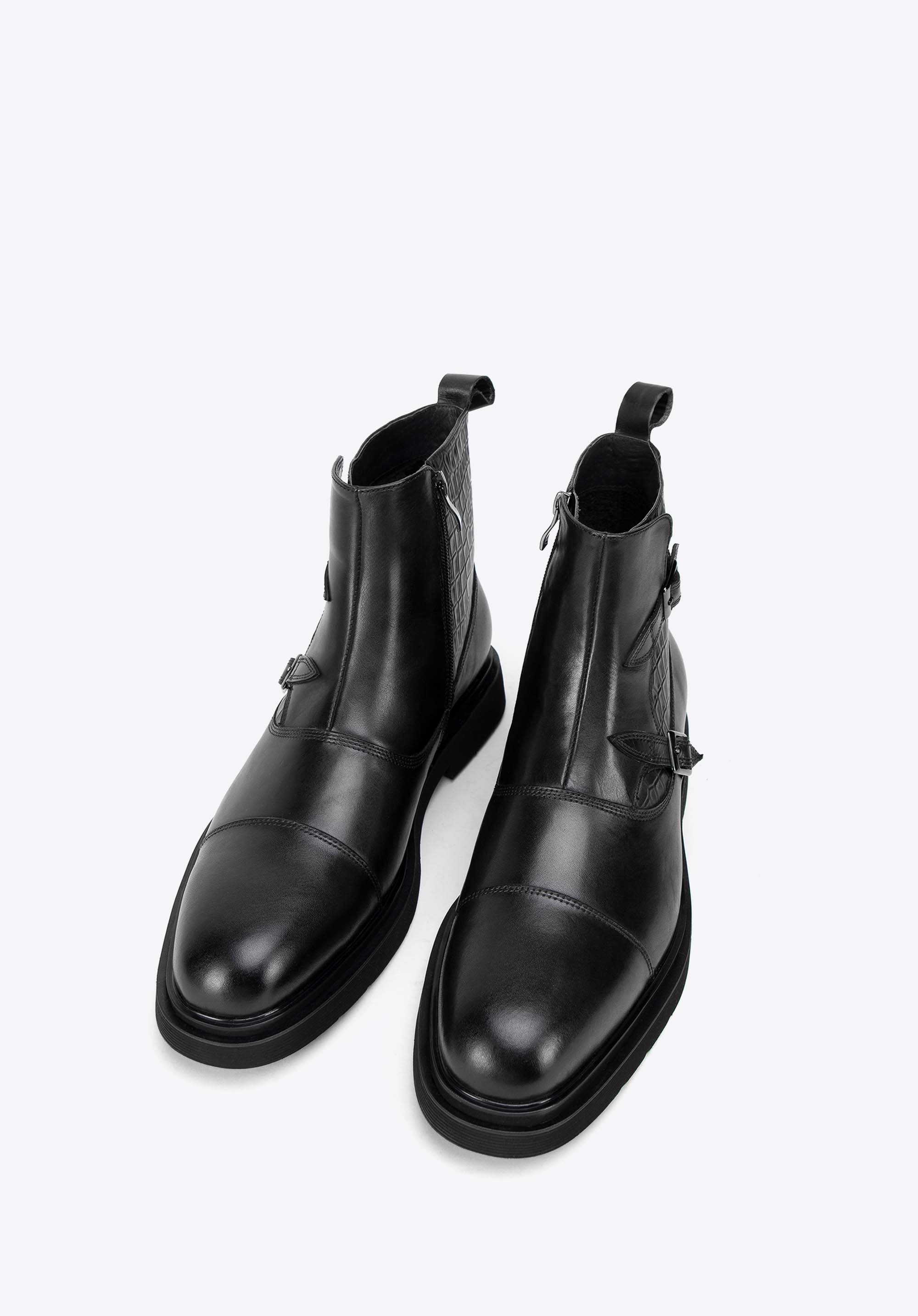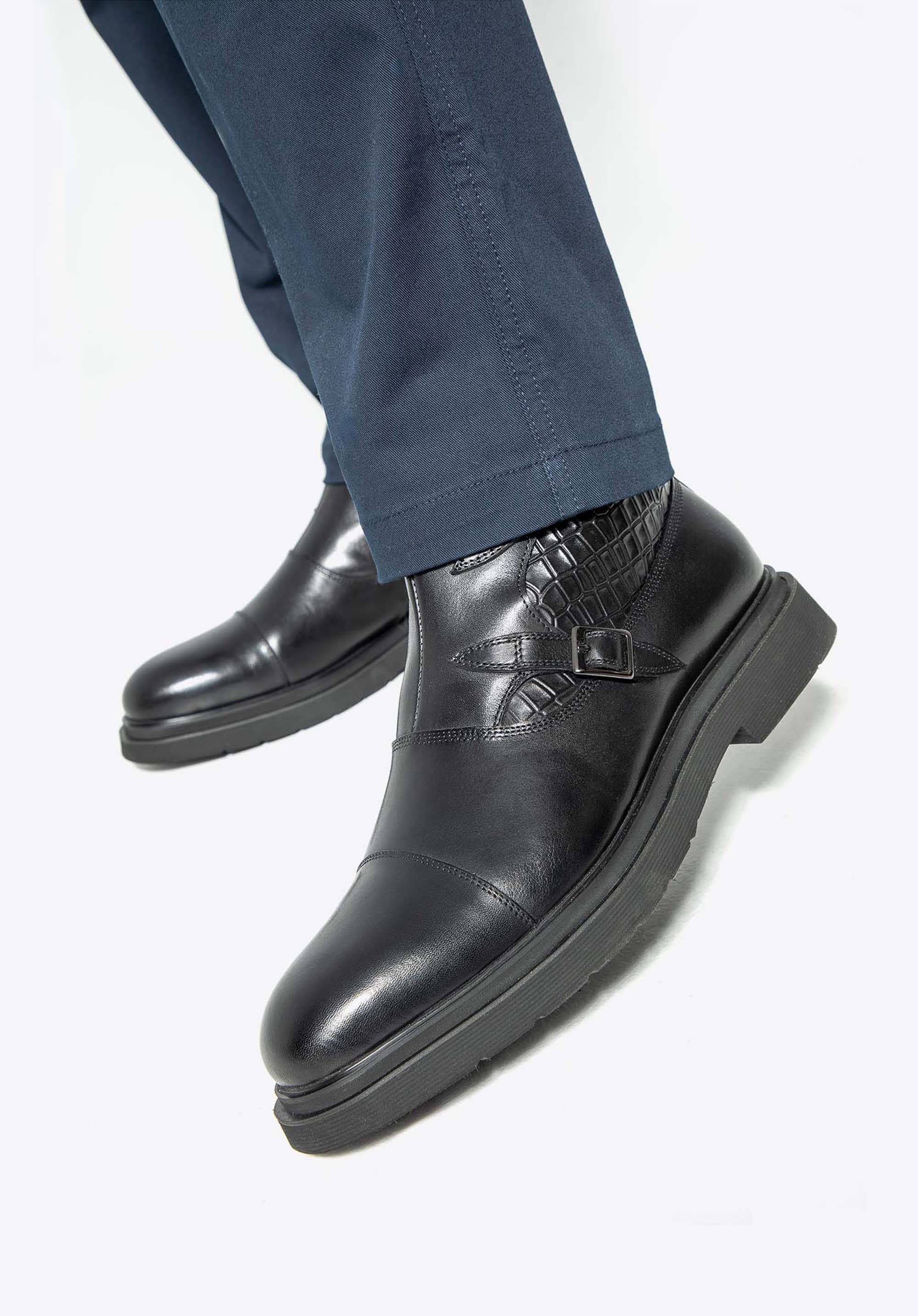 Diese Chelsea-Boots für Herren sind der Inbegriff von Eleganz und Komfort. Sie bestehen aus hochwertigem, natürlichem Vollnarbenleder und sind mit Kroko-Details verziert. Das weiche Lederfutter und die mandelförmige Spitze sorgen den ganzen Tag über für unvergleichlichen Komfort. Der flache Absatz und das strapazierfähige Gummi an der Ferse sorgen für Stabilität. Ein praktischer Reißverschluss erleichtert das Anziehen, während zwei dekorative Schnallen und Nähte an der Spitze den Stiefeln einen unverwechselbaren und anspruchsvollen Look verleihen. Die perfekte Kombination aus Stil und Funktionalität für den modernen Mann.
