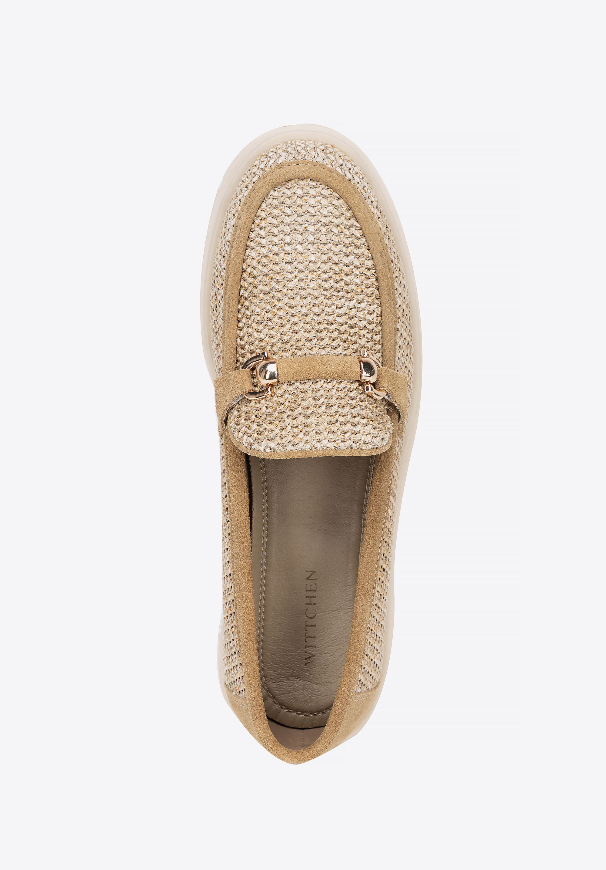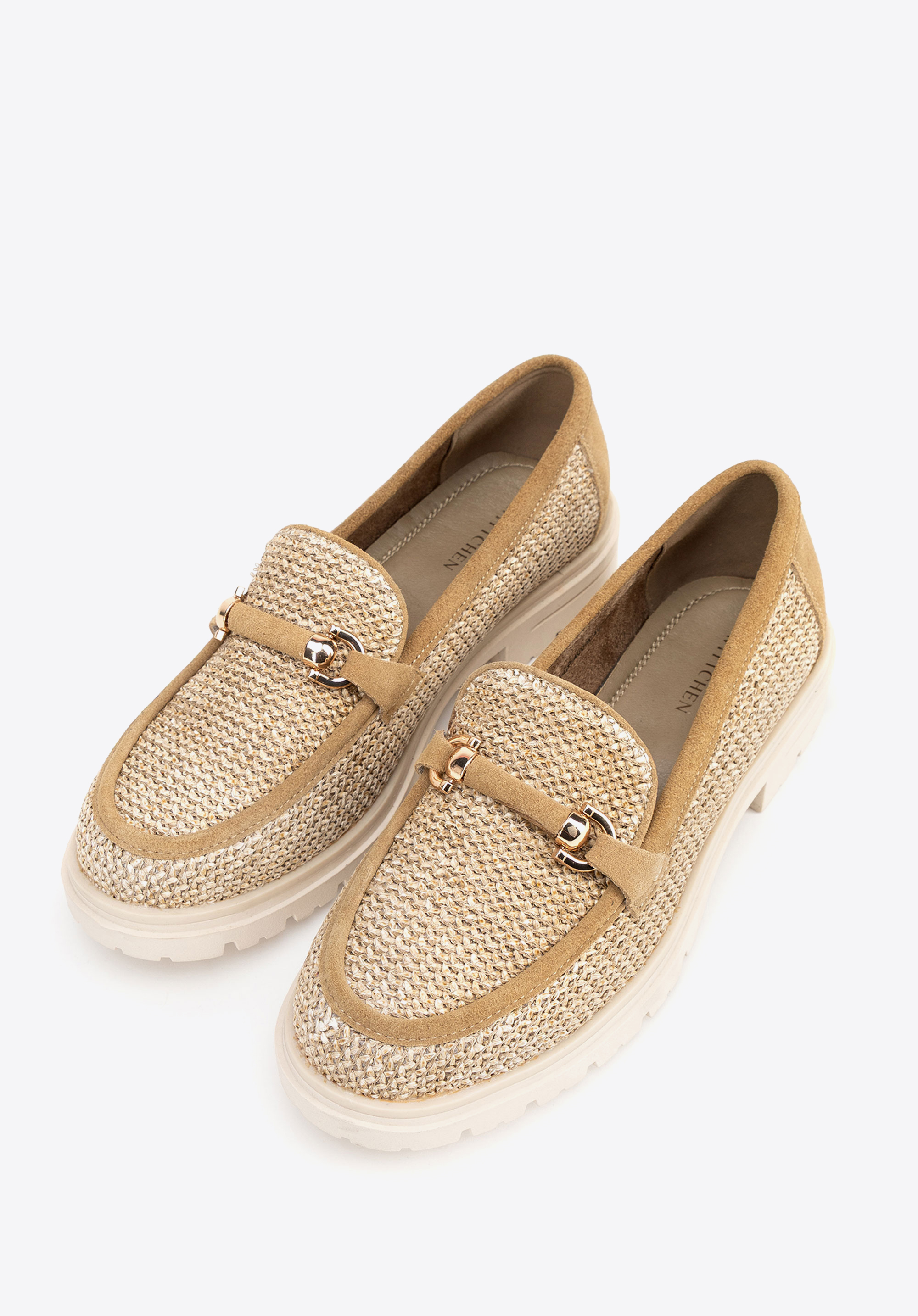 Veredeln Sie Ihren Stil mit Loafern , die natürliche Eleganz mit modernem Design verbinden. Dieses Modell aus auffälligem Kunstbast und weichem Wildleder besticht durch seine einzigartige Webstruktur und die dekorative Schnalle und verleiht ihm einen Hauch von Raffinesse. Die Slip-On-Konstruktion sorgt für Komfort, während die Plateausohle die Silhouette dezent streckt und so Stabilität und Tragekomfort bietet.