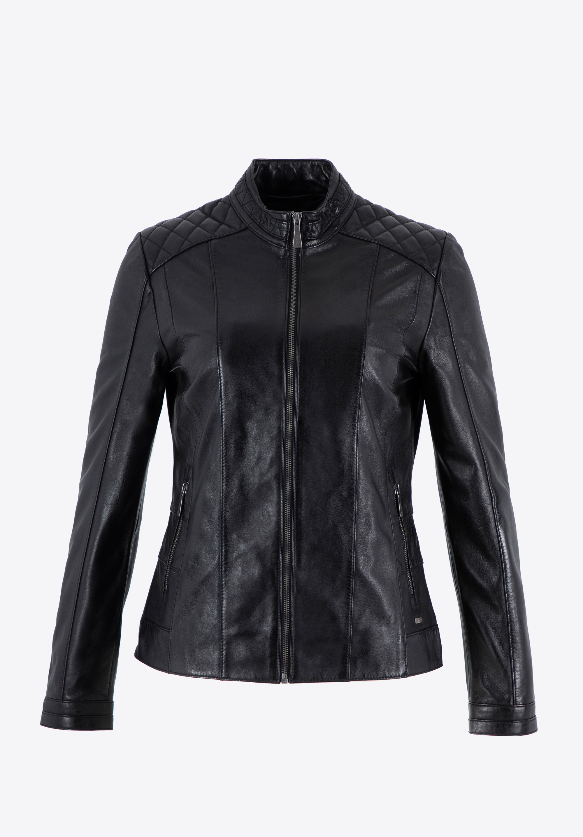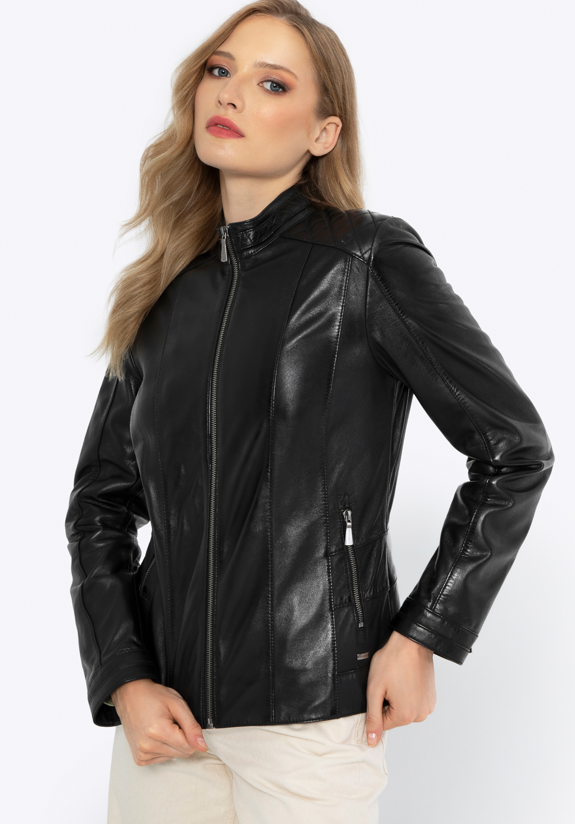 Wenn Sie zeitlose, hochwertige Kleidung schätzen, ist diese klassische Damenlederjacke genau das Richtige für Sie. Eine Lederjacke bringt Vielseitigkeit in Ihre Garderobe. Sie verfügt über einen einfachen Reißverschluss und zwei Taschen , ideal für Ihre wichtigsten Dinge. Metallakzente verleihen eine elegante Note. Die Schulternähte betonen das raffinierte Design dieser ikonischen Jacke. Ein weiteres praktisches Merkmal sind die geraden Ärmel mit Manschetten, die mit einem Reißverschluss geöffnet und mit einem Druckknopf gesichert werden können, sodass Sie sie bis zur Mitte des Handgelenks hochkrempeln können. Die Taille der Jacke betont Ihre Silhouette und passt sich Ihrer Form an, während das weiche Futter für Komfort sorgt. Sie werden die Vielseitigkeit dieser Damenlederjacke zu schätzen wissen.