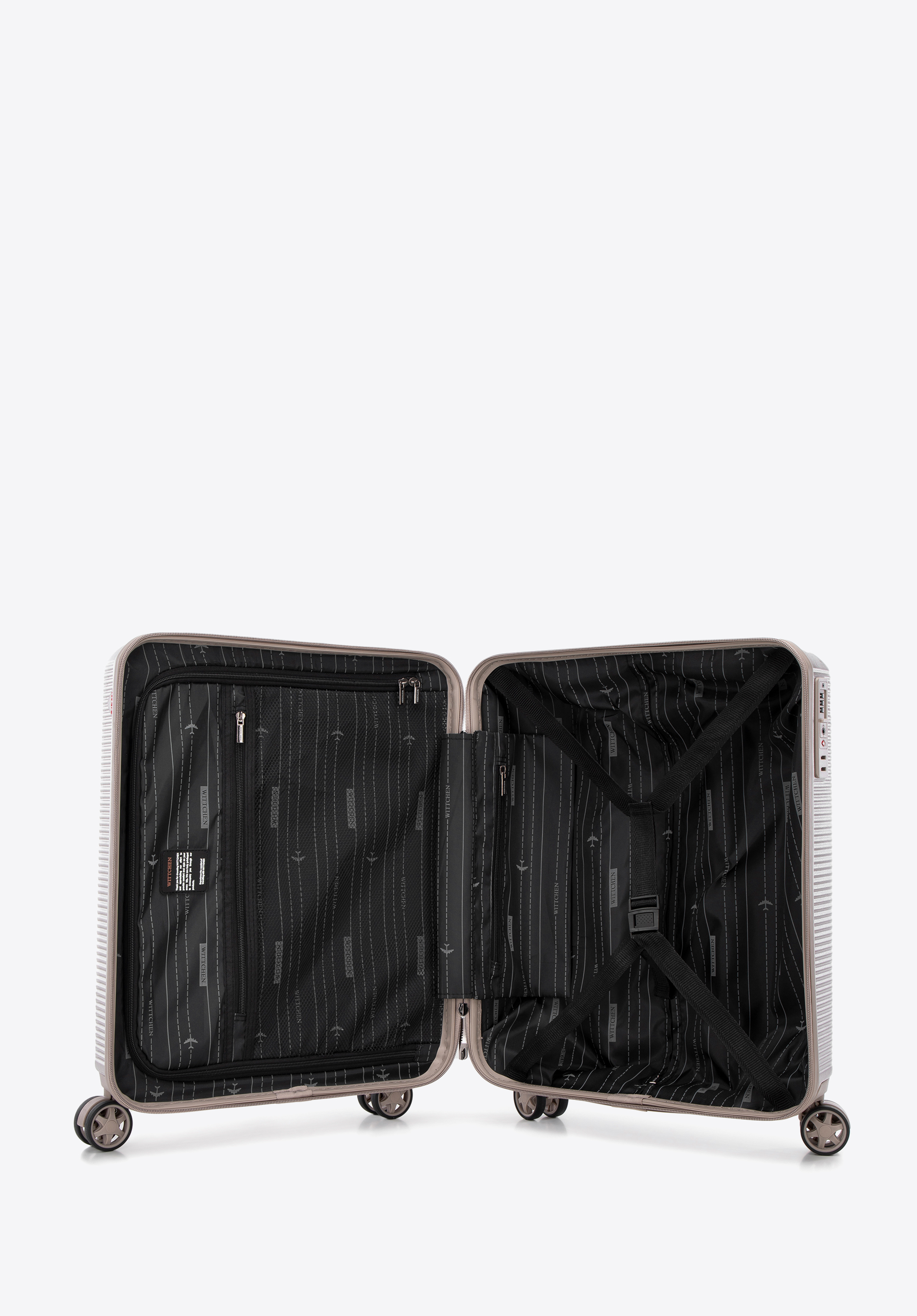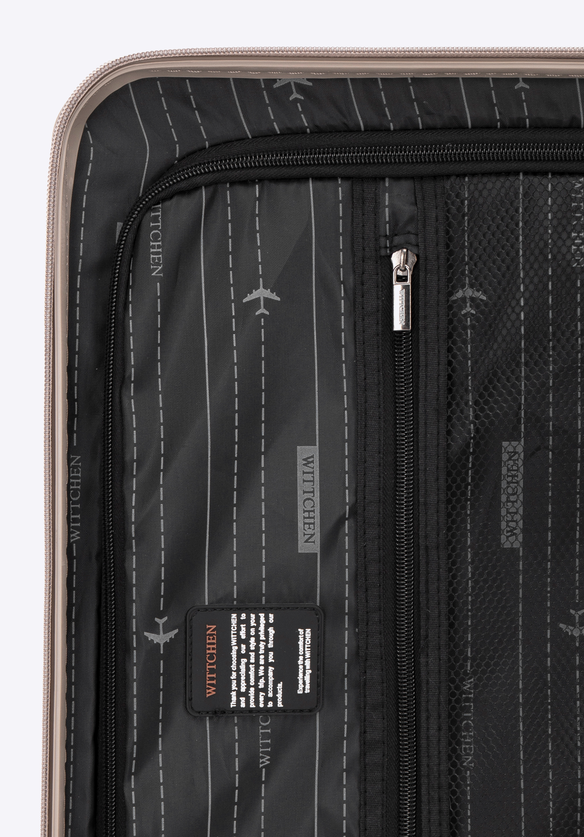 - Innenfutter: Der Koffer hat ein Innenfutter aus dunklem Polyester, das mit einem dezenten Herstellerlogo verziert ist.