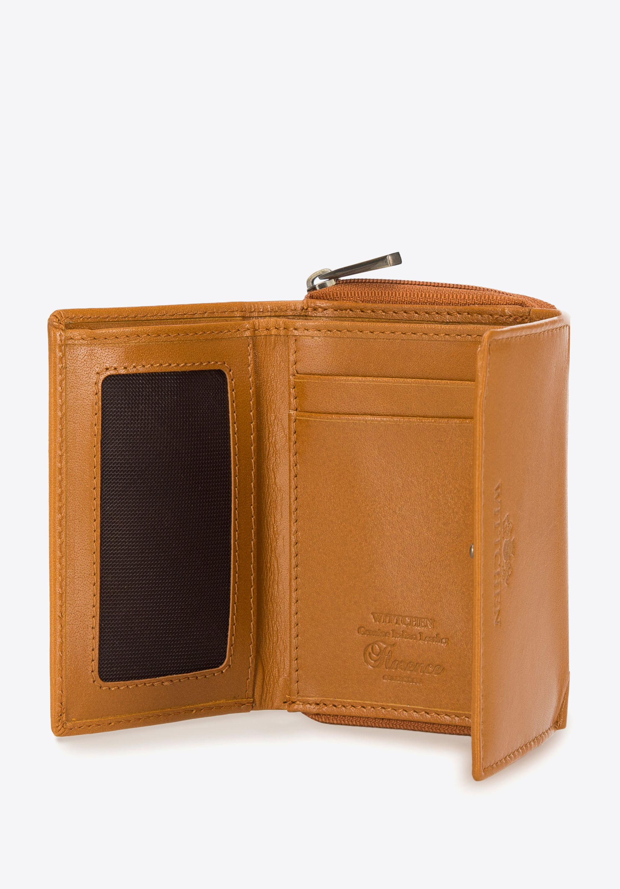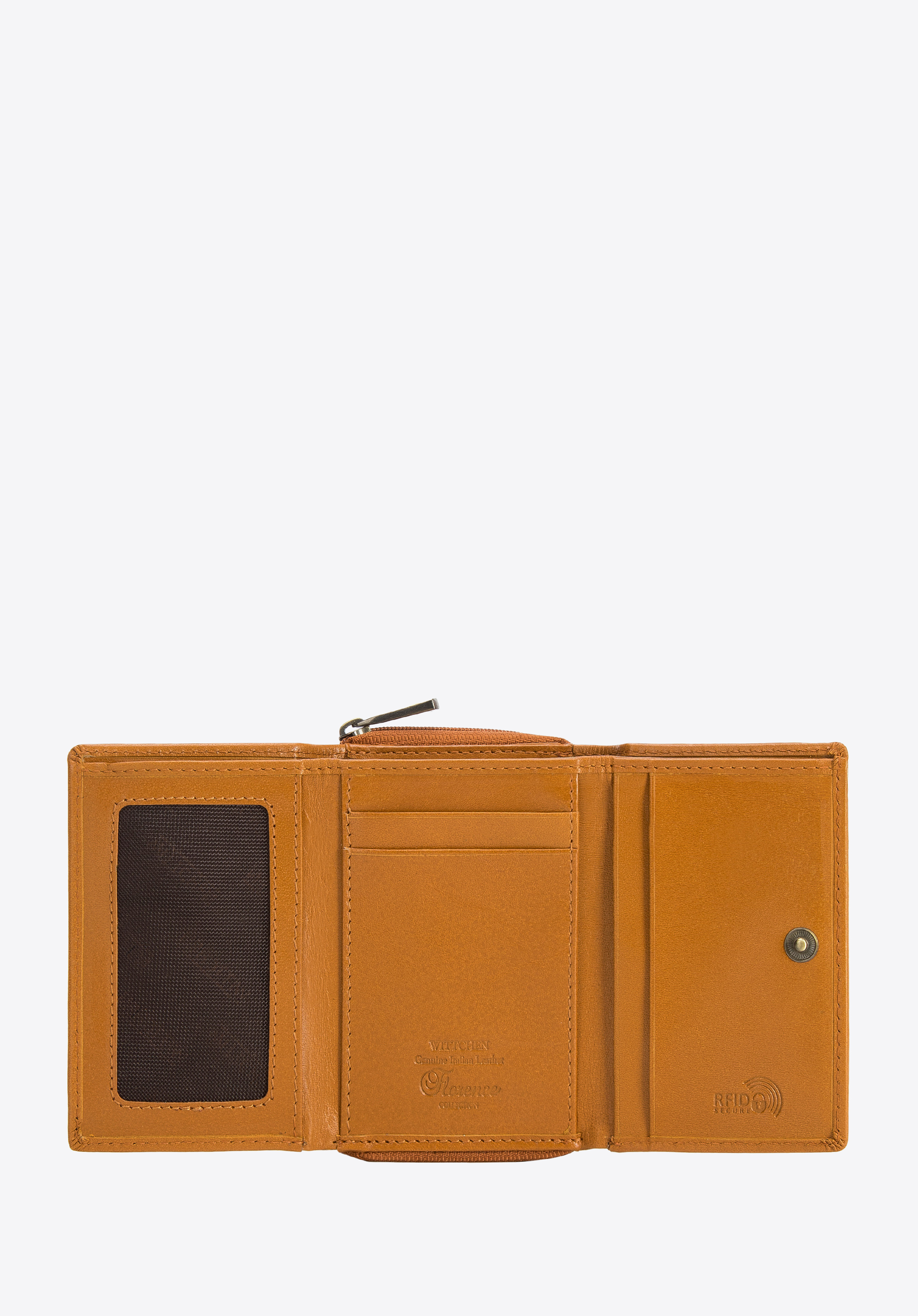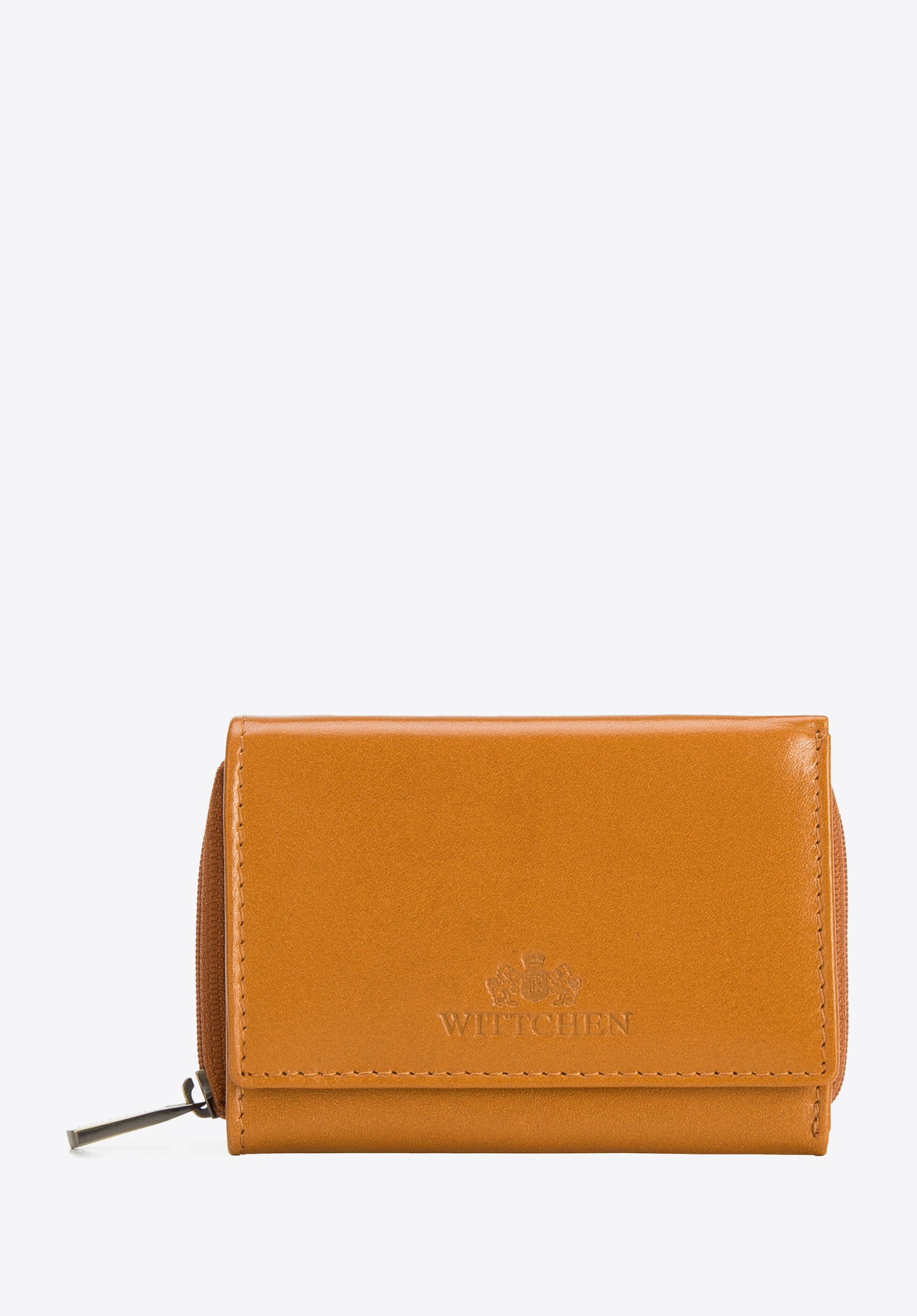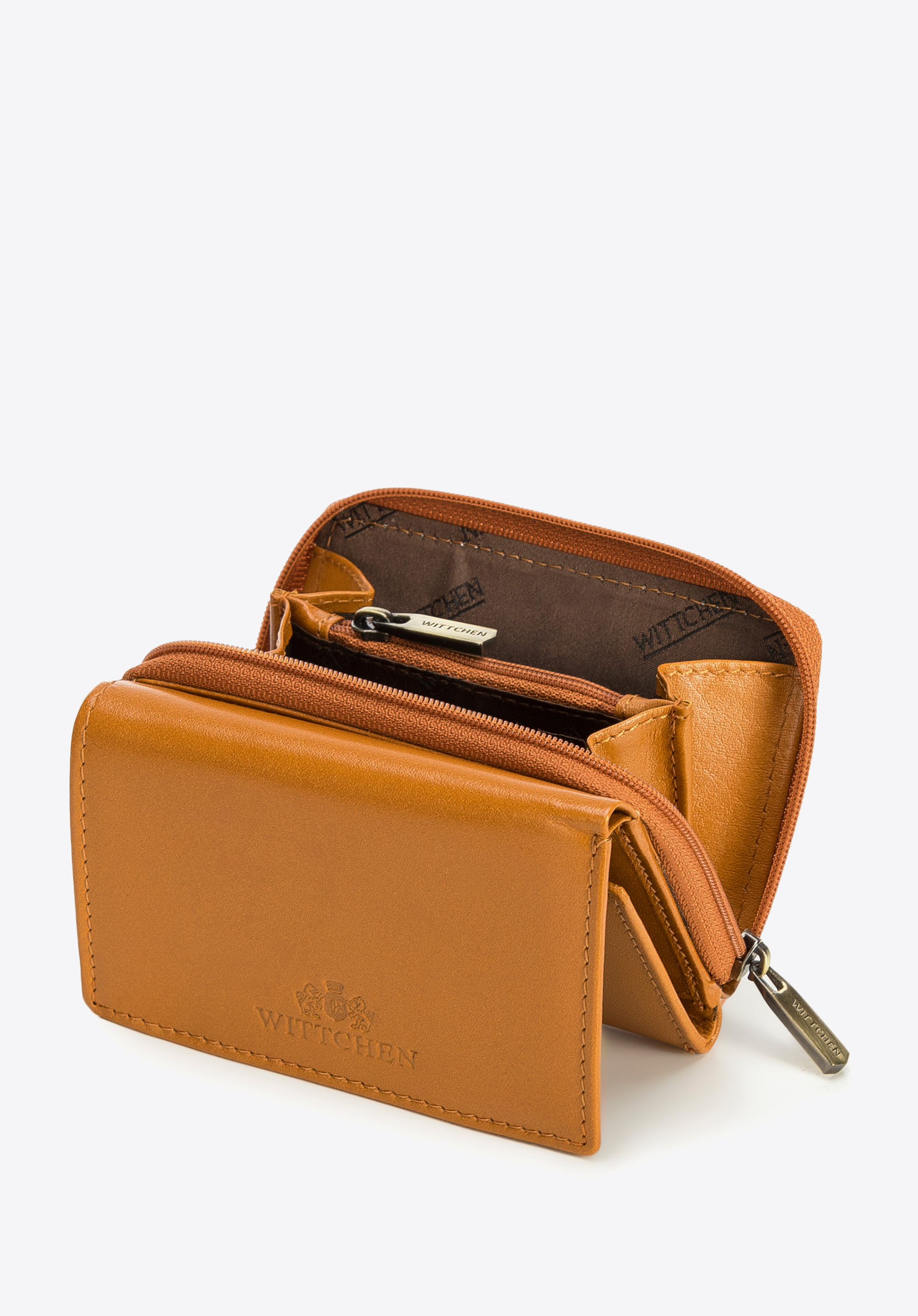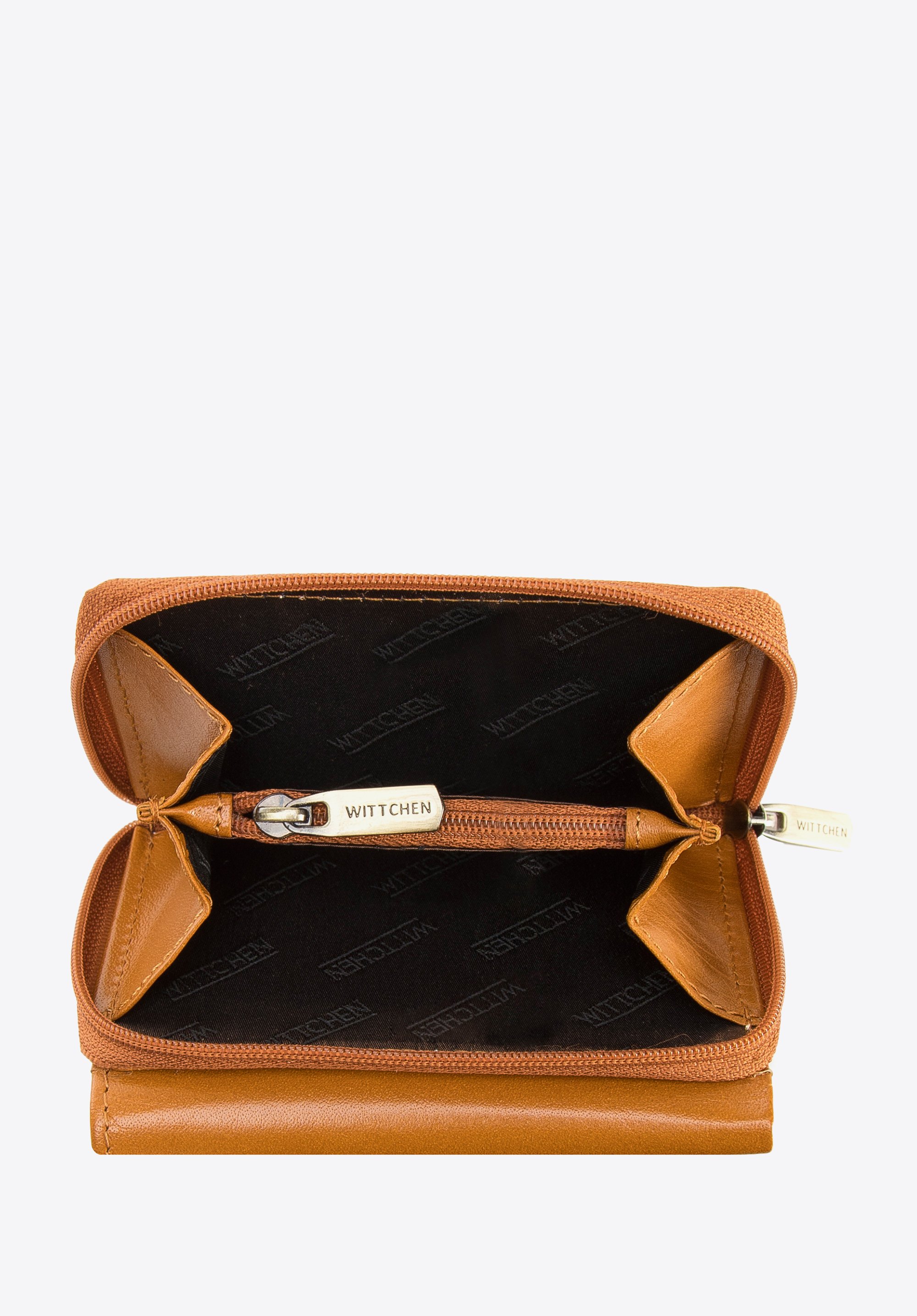 Dieses stilvolle Portemonnaie ist ein einzigartiges Accessoire, das sogar zu einer kleinen Handtasche passt. Es ist aus Naturleder mit geprägtem WITTCHEN-Logo gefertigt. Im Inneren befinden sich mehrere Kartenfächer und eine Netztasche, in der Sie z. B. Ihr Ticket verstecken können. Darüber hinaus schützt das innovative Innenfutter vor das Scannen von Kartendaten (RFID). Das kleine Portemonnaie aus Glattleder für Damen ist eine gute Wahl für Frauen, die praktische Accessoires lieben.