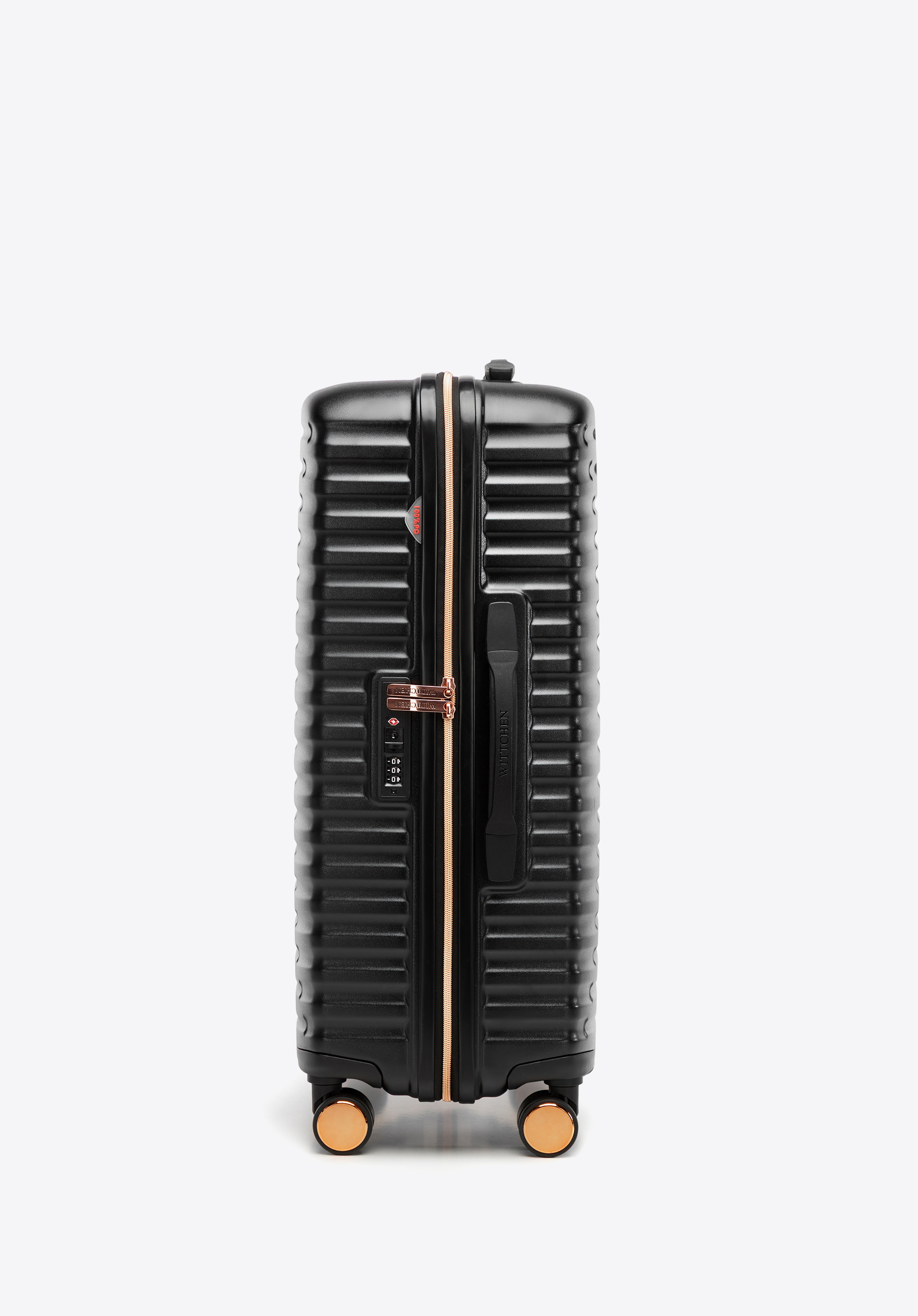 - Design: Die horizontale Rippung bietet sowohl Schutz als auch ein elegantes, modernes Aussehen – für stilvolles Reisen.