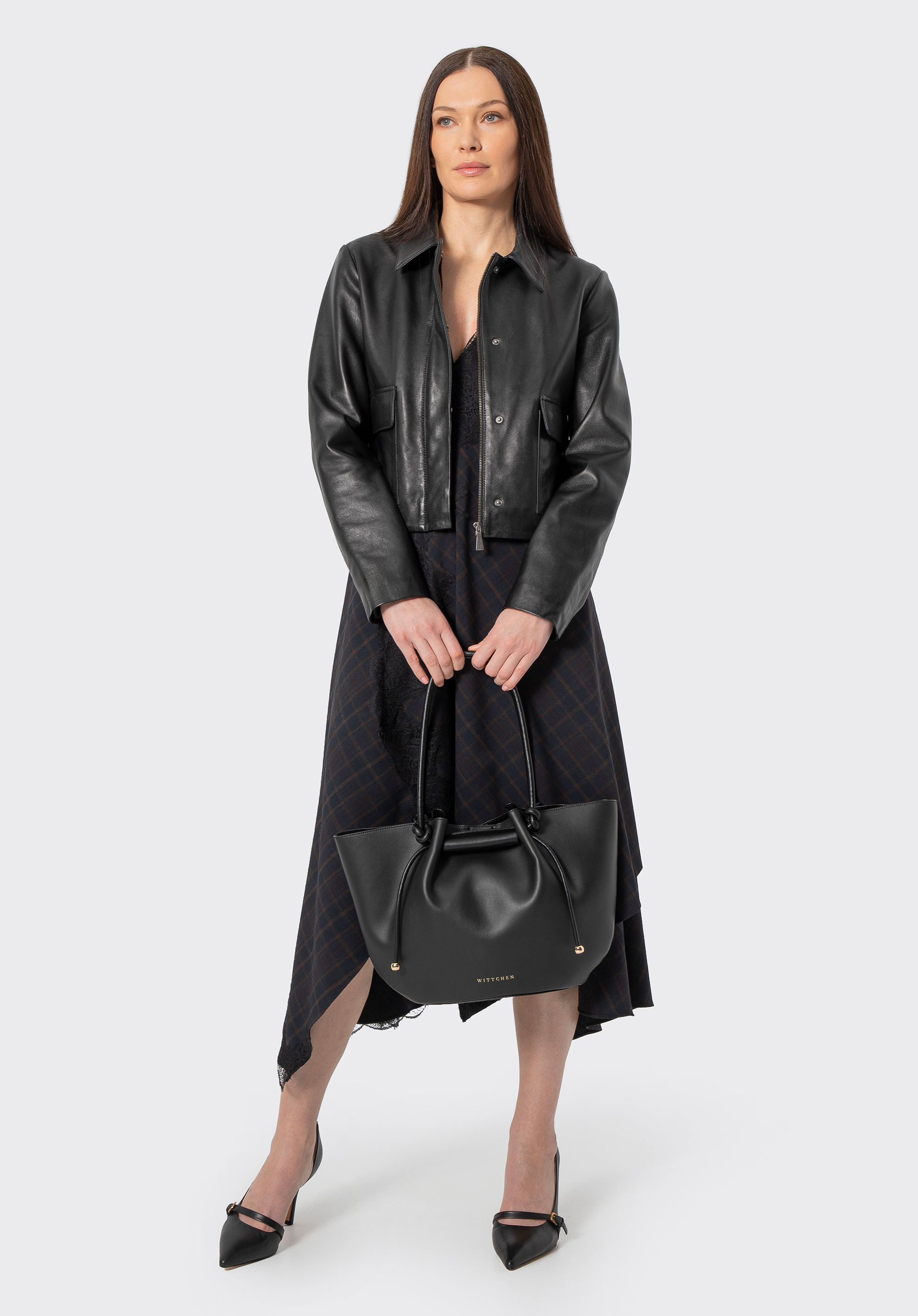 Unser Vorschlag: Tragen Sie es mit einem ausgestellten Midikleid, um einen Kontrast zwischen fließendem Stoff und strukturiertem Leder zu schaffen. Für einen moderneren Look kombinieren Sie es mit einer weit geschnittenen Hose, Loafern und einer Lederhandtasche mit geometrischen Mustern.