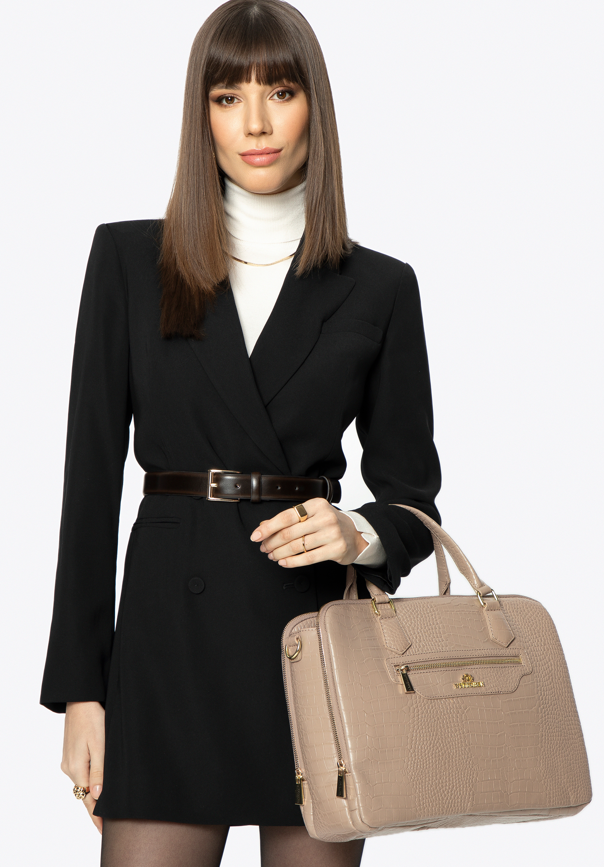 Entdecken Sie die perfekte Kombination aus Eleganz und Funktionalität mit unserer 15,6-Zoll-Laptophandtasche . Diese aus Naturleder höchster Qualität mit stilvoller Krokostruktur gefertigte Handtasche kombiniert ein luxuriöses Erscheinungsbild mit modernem Design und erfüllt damit perfekt die Bedürfnisse der modernen Frau. Dezente Details wie schicke Metallteile verleihen ihr einen einzigartigen Charakter, während ihre unverwechselbare Struktur jedem Outfit eine raffinierte Note verleiht.