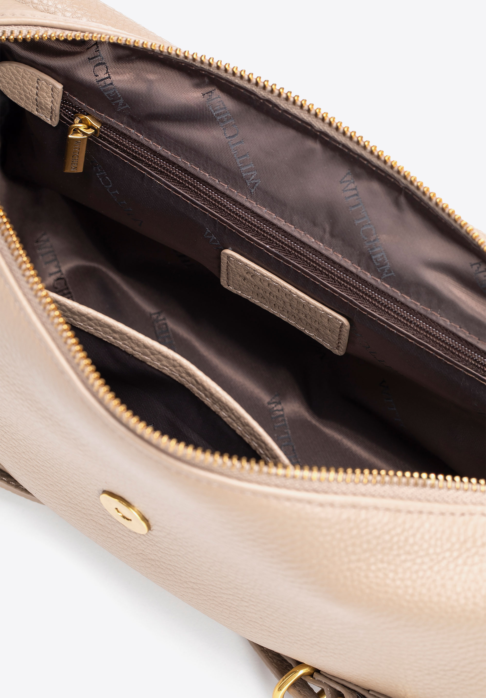 Diese Baguette -Tasche für Damen vereint Eleganz und Komfort. Gefertigt aus Leder, garantiert sie Langlebigkeit und zeitlose Schönheit. Die Details unter der Klappe, die Innenausstattung und der Schulterriemen aus weicher Mikrofaser sorgen für angenehmen Tragekomfort und eine edle Note. Ein Magnetverschluss und ein zusätzlicher Reißverschluss schützen Ihre wichtigsten Dinge. Die abnehmbare Quaste setzt einen schicken Akzent und kann bei Bedarf entfernt werden. Zwei Innentaschen, eine davon mit Reißverschluss, helfen Ihnen, Ordnung zu halten und Ihre Alltagsgegenstände stets griffbereit zu haben.