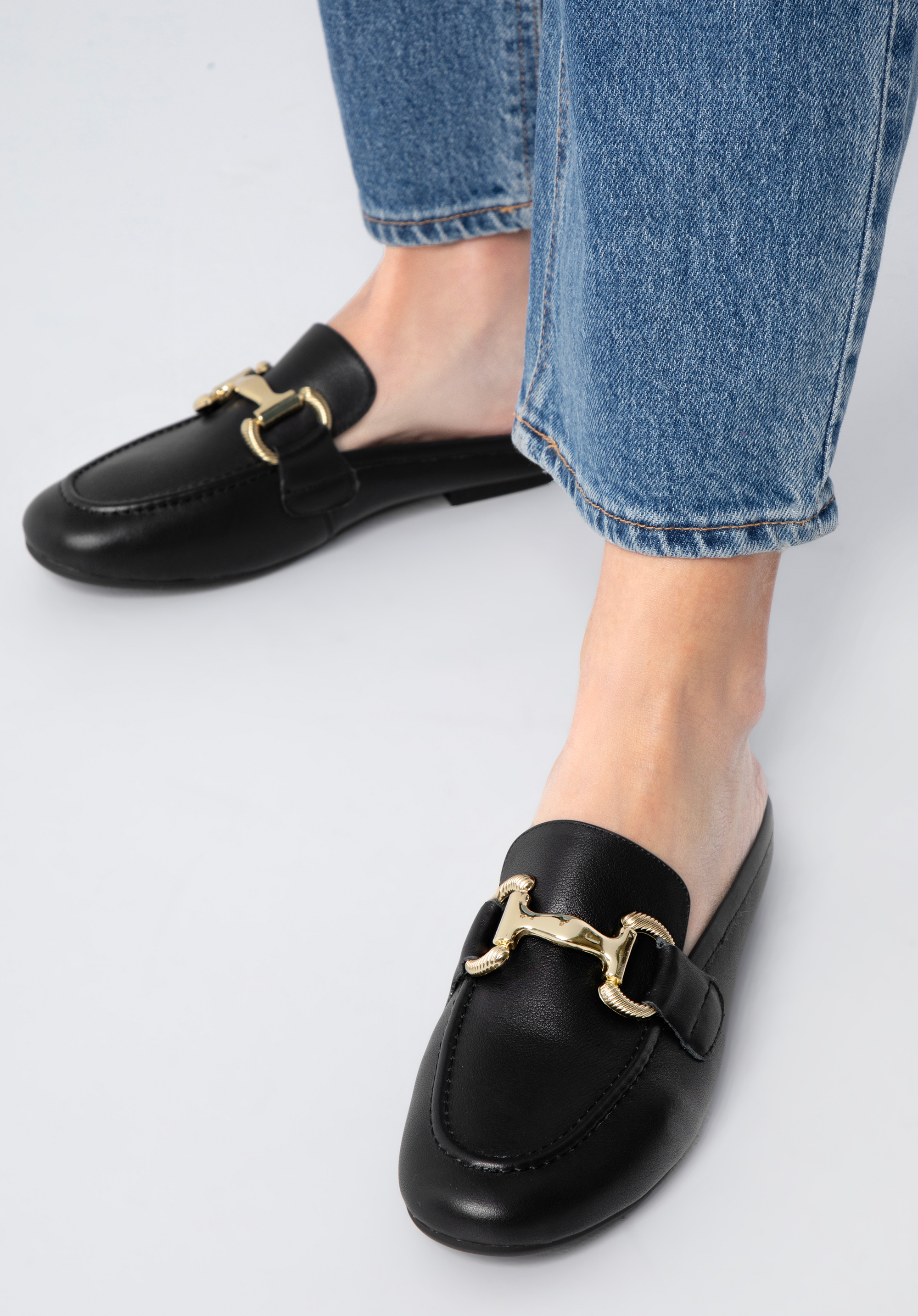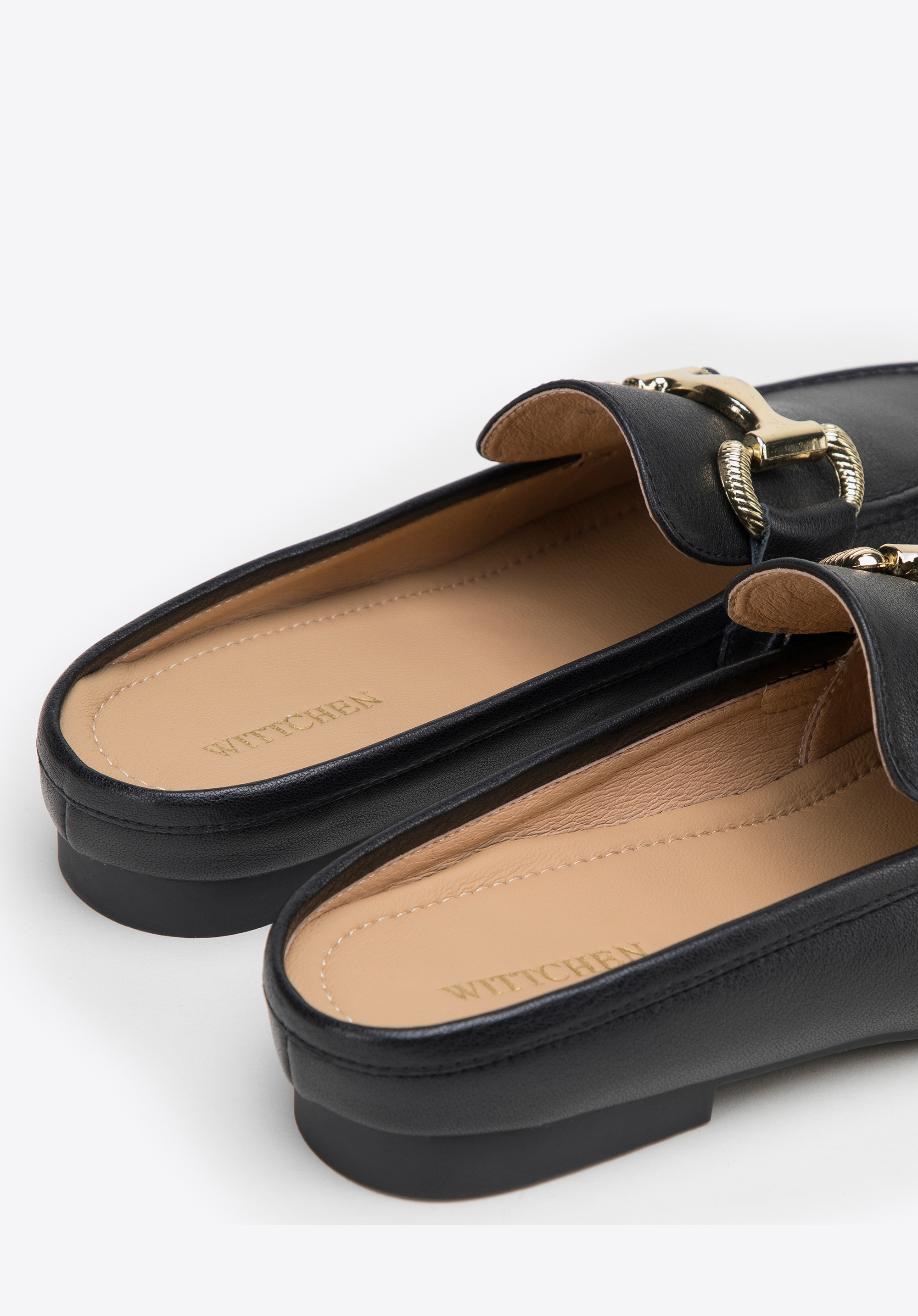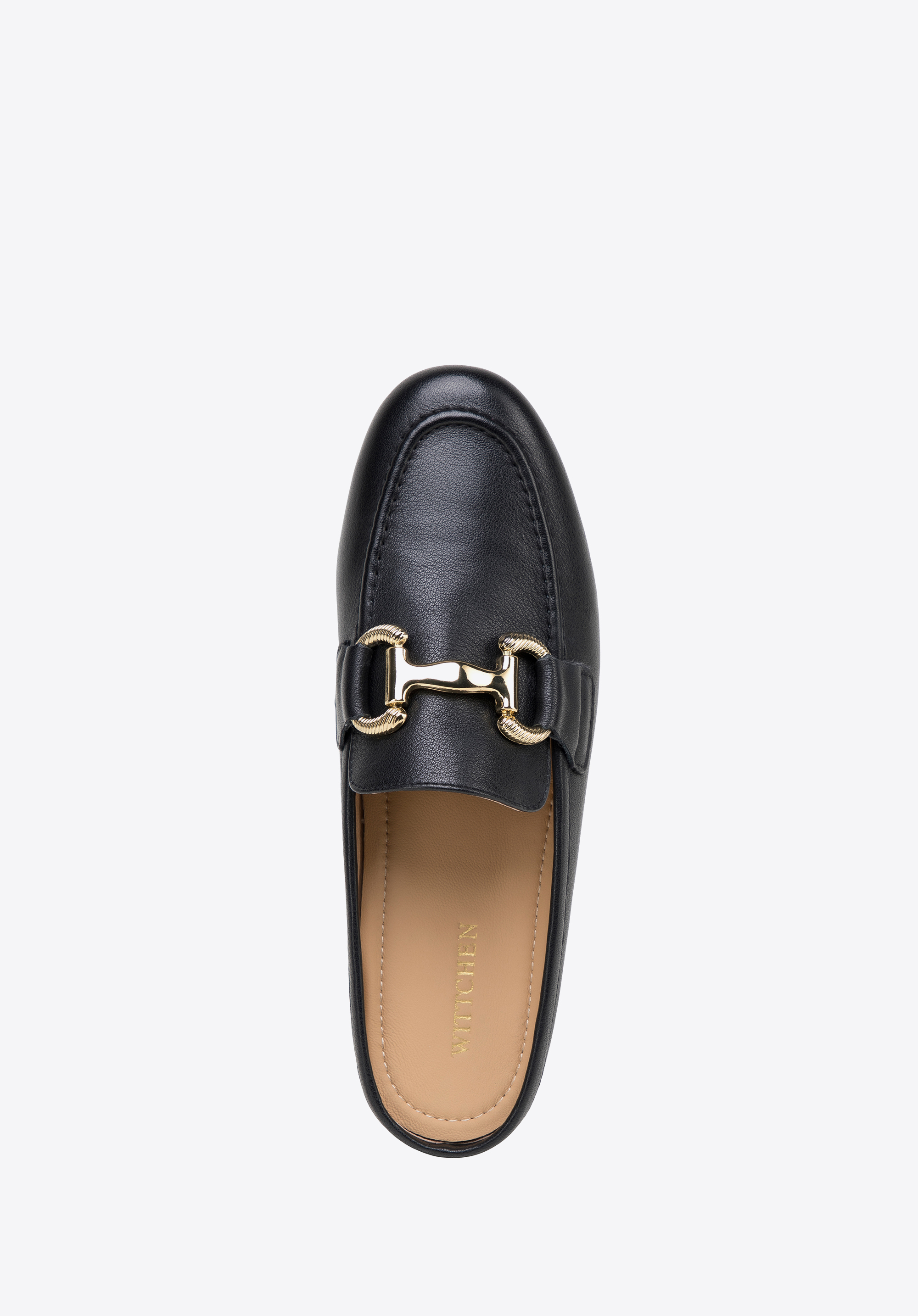 In diesen stilvollen Pantoletten werden Sie jeden Tag etwas Besonderes aussehen. Dieser elegante Gebiss-Slipper aus hochwertigem Naturleder verfügt über ein goldfarbenes Metallband (in Form eines Pferdegebisses) über dem Spann. Eine schmeichelnde runde Spitze verlängert Ihren Fuß und dank der Innensohle aus natürlichem Ziegenleder können Sie diese Pantoletten oft tragen. Damen -Slipper-Sandalen aus Leder zeichnen sich durch ein einzigartiges Design aus, das ein echter Hingucker ist. Kombinieren Sie diese Schuhe mit weiten Jeans oder einem Minikleid für zusätzlichen Reiz. In Kombination mit einem Paar dieser Slipper lässt sich ein raffinierter, eleganter Stil in jedes Outfit integrieren.