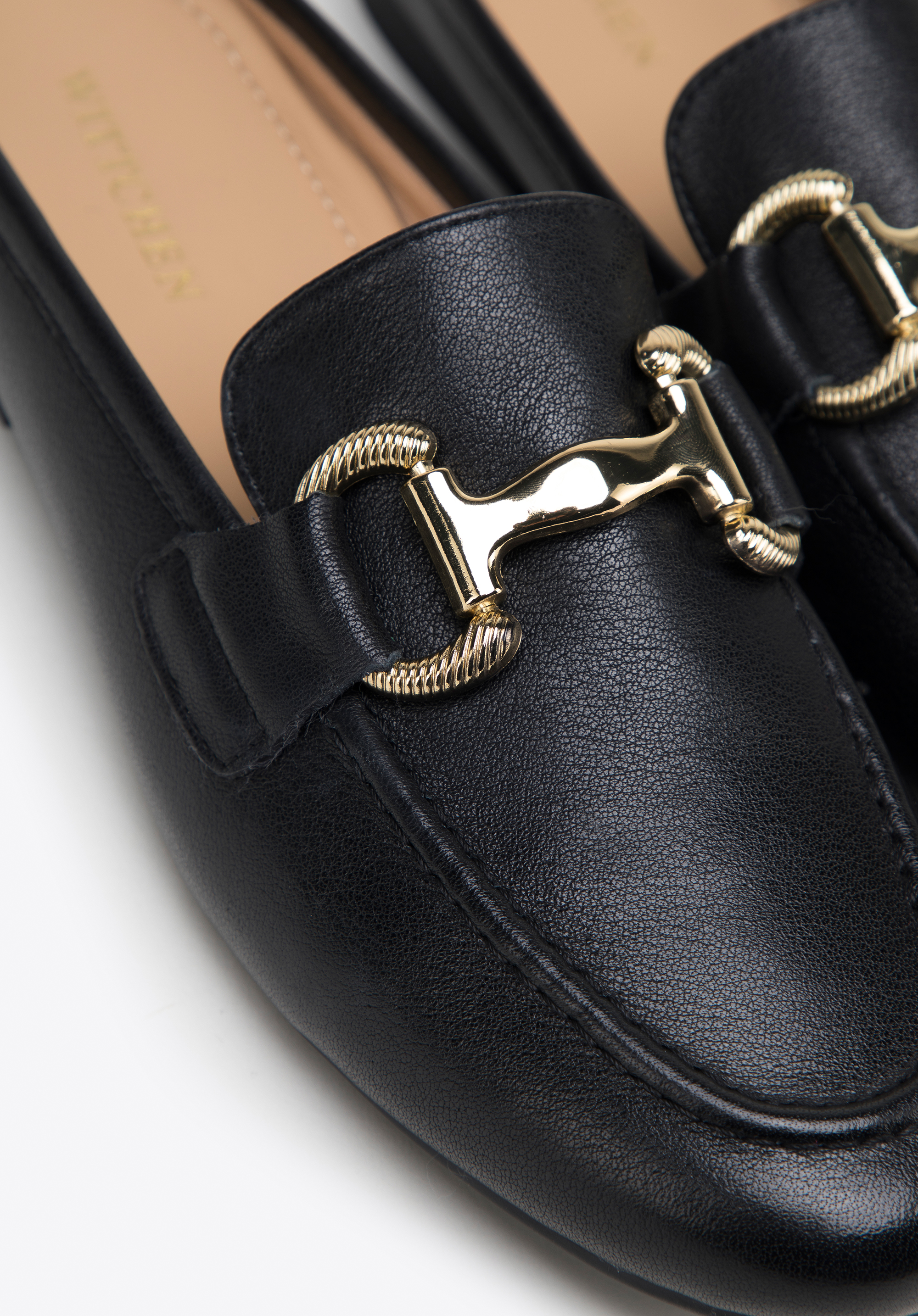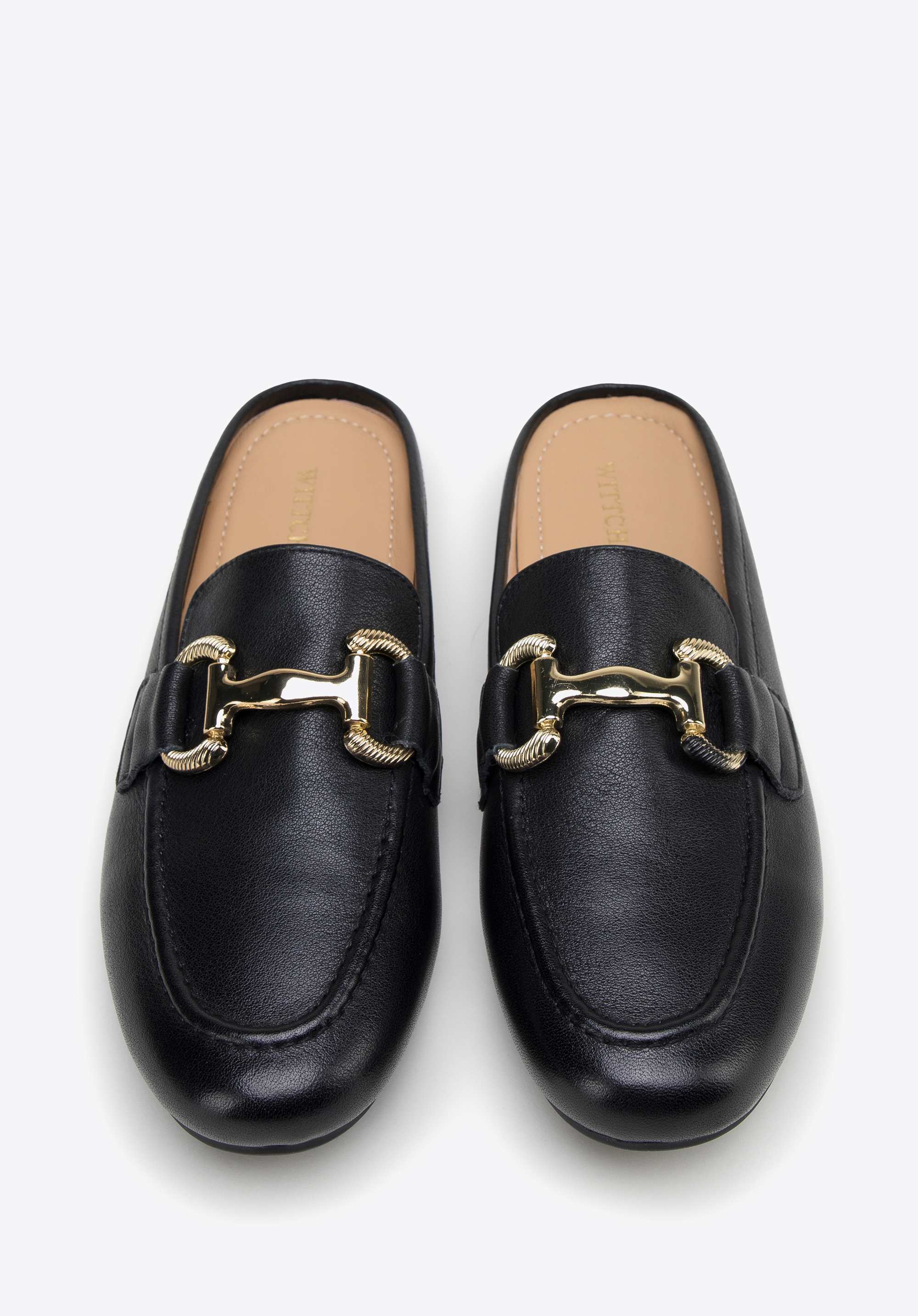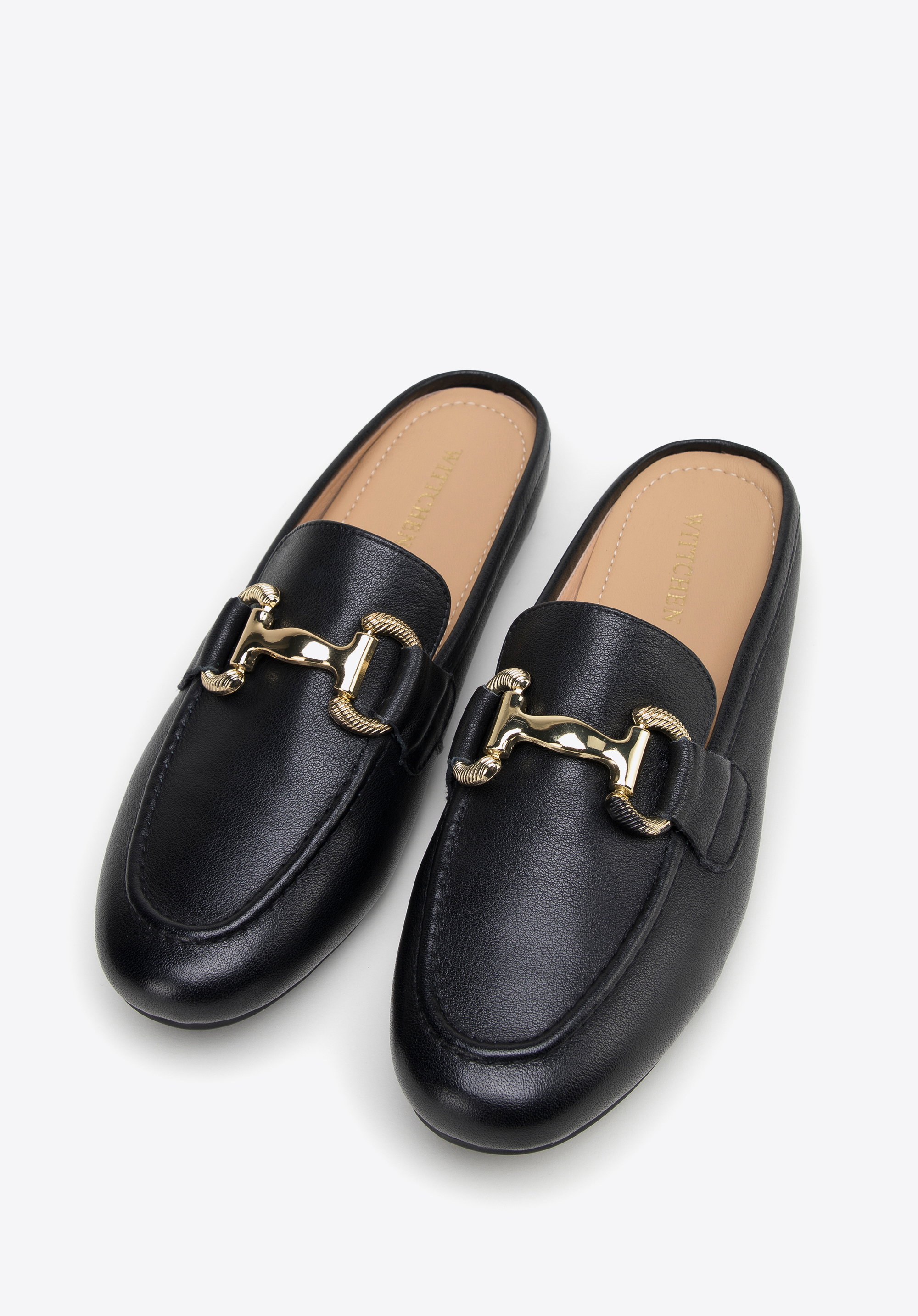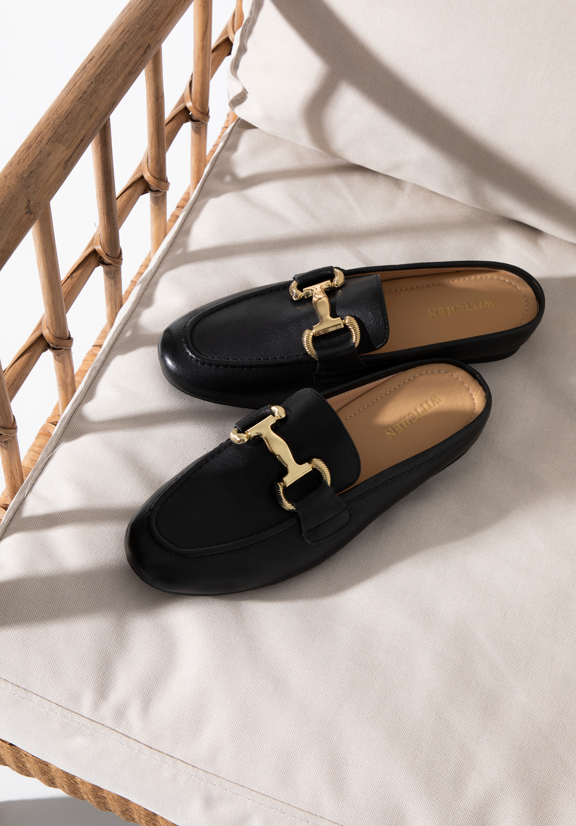 In diesen stilvollen Pantoletten werden Sie jeden Tag etwas Besonderes aussehen. Dieser elegante Gebiss-Slipper aus hochwertigem Naturleder verfügt über ein goldfarbenes Metallband (in Form eines Pferdegebisses) über dem Spann. Eine schmeichelnde runde Spitze verlängert Ihren Fuß und dank der Innensohle aus natürlichem Ziegenleder können Sie diese Pantoletten oft tragen. Damen -Slipper-Sandalen aus Leder zeichnen sich durch ein einzigartiges Design aus, das ein echter Hingucker ist. Kombinieren Sie diese Schuhe mit weiten Jeans oder einem Minikleid für zusätzlichen Reiz. In Kombination mit einem Paar dieser Slipper lässt sich ein raffinierter, eleganter Stil in jedes Outfit integrieren.