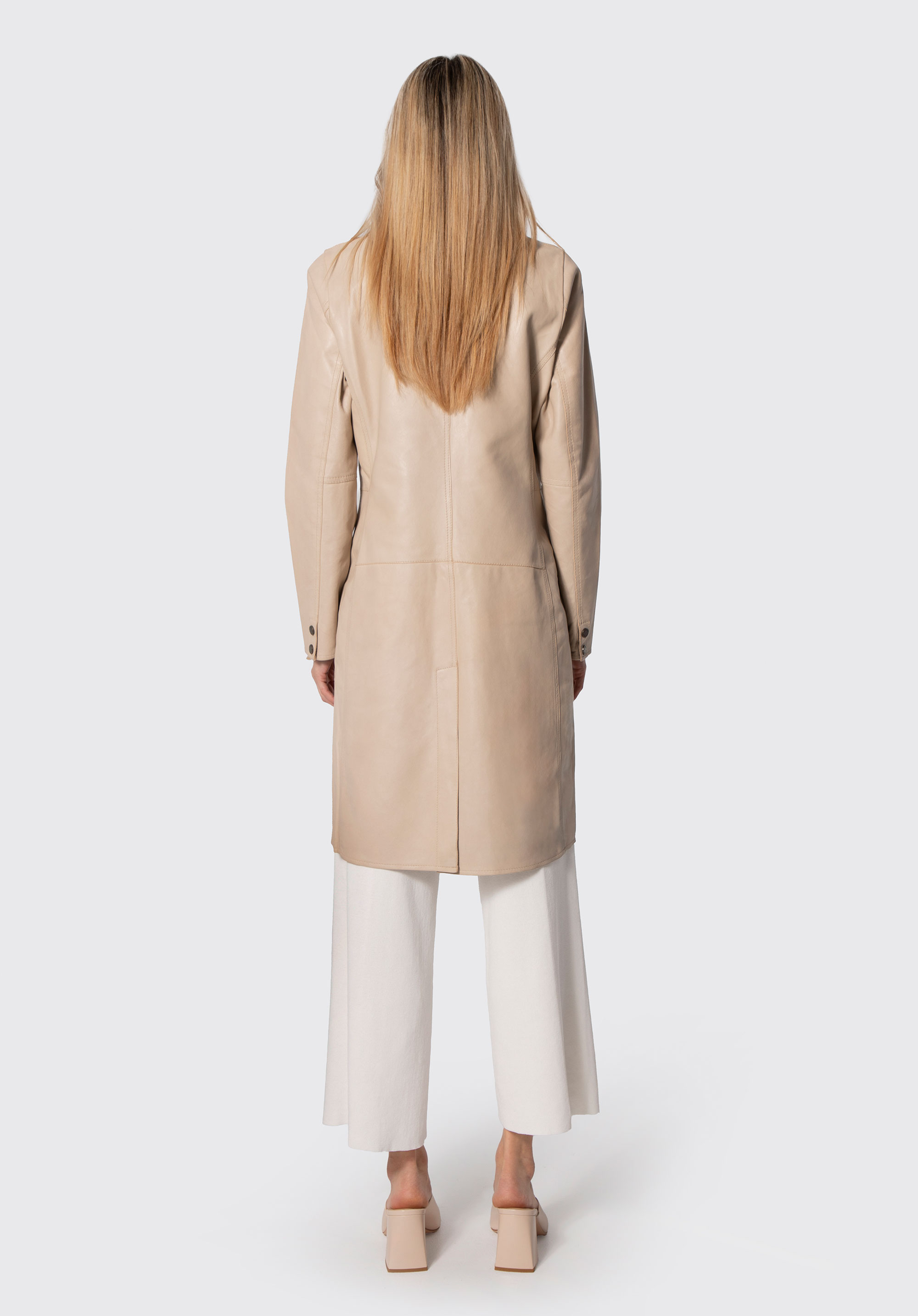Dieser Mantel ist mehr als nur ein unverzichtbares Kleidungsstück – er ist eine bewusste Entscheidung für Stil, Qualität und Komfort. Gefertigt aus natürlichem Lammleder , ist er wunderbar weich, elegant und makellos verarbeitet. Er umspielt Ihre Figur mit einer raffinierten Note und verleiht Ihnen Selbstbewusstsein, während er gleichzeitig ganztägigen Tragekomfort bietet. Druckknopfverschluss und Rückenschlitz garantieren optimale Bewegungsfreiheit – so fühlen Sie sich wohl, ohne auf Stil verzichten zu müssen. Das ungefütterte Naturleder-Innenfutter unterstreicht die luxuriöse Qualität und sorgt für ein angenehmes Tragegefühl. Eine Investition in einen Mantel, der Sie viele Saisons lang begleiten wird und dabei stets stilvoll und modern aussieht.
