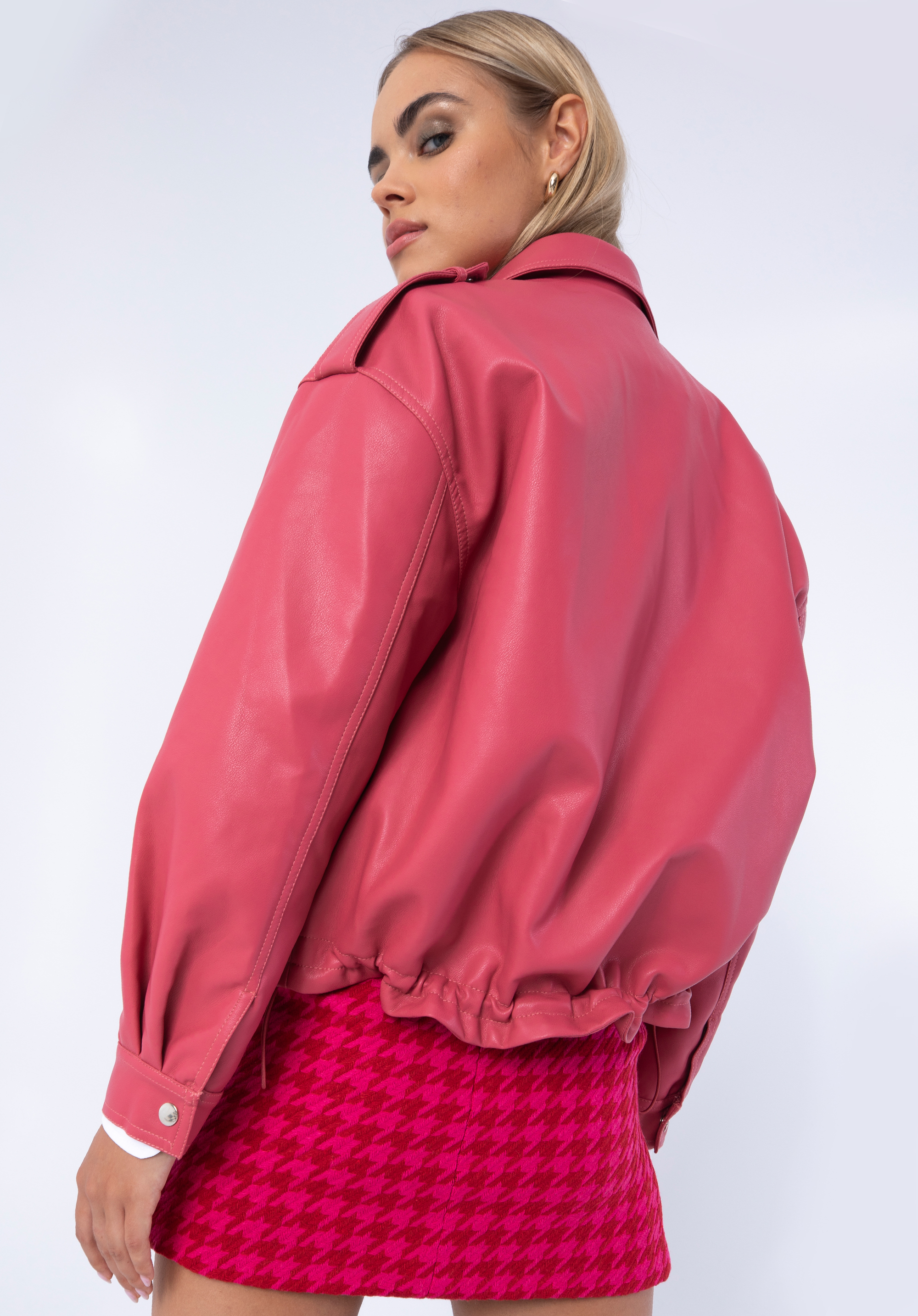 Mit dieser modischen Jacke werden Sie mehr als nur einen Blick auf sich ziehen. Der Oversized-Schnitt mit Ballon-Knopfärmeln bringt Abwechslung in jedes Ihrer Outfits. Sie ist eine tolle Ergänzung zu Ihrer Lieblingsjeans und Ihren Sneakers und verleiht Ihrem Lieblingsminikleid einen neuen Charakter. Dieses Modell wurde aus hochwertigem Bio-Leder gefertigt. Der Reißverschluss ist unter einer breiten Knopfleiste versteckt, und das Ganze wird durch einen klassischen Kragen vervollständigt. In den großen Taschen auf der Vorderseite können Sie Ihre Hände und ein paar Kleinigkeiten verstauen. Die Oversize-Öko-Lederjacke für Damen mit großen Taschen ist ein Muss für Liebhaber moderner Accessoires mit Charakter.