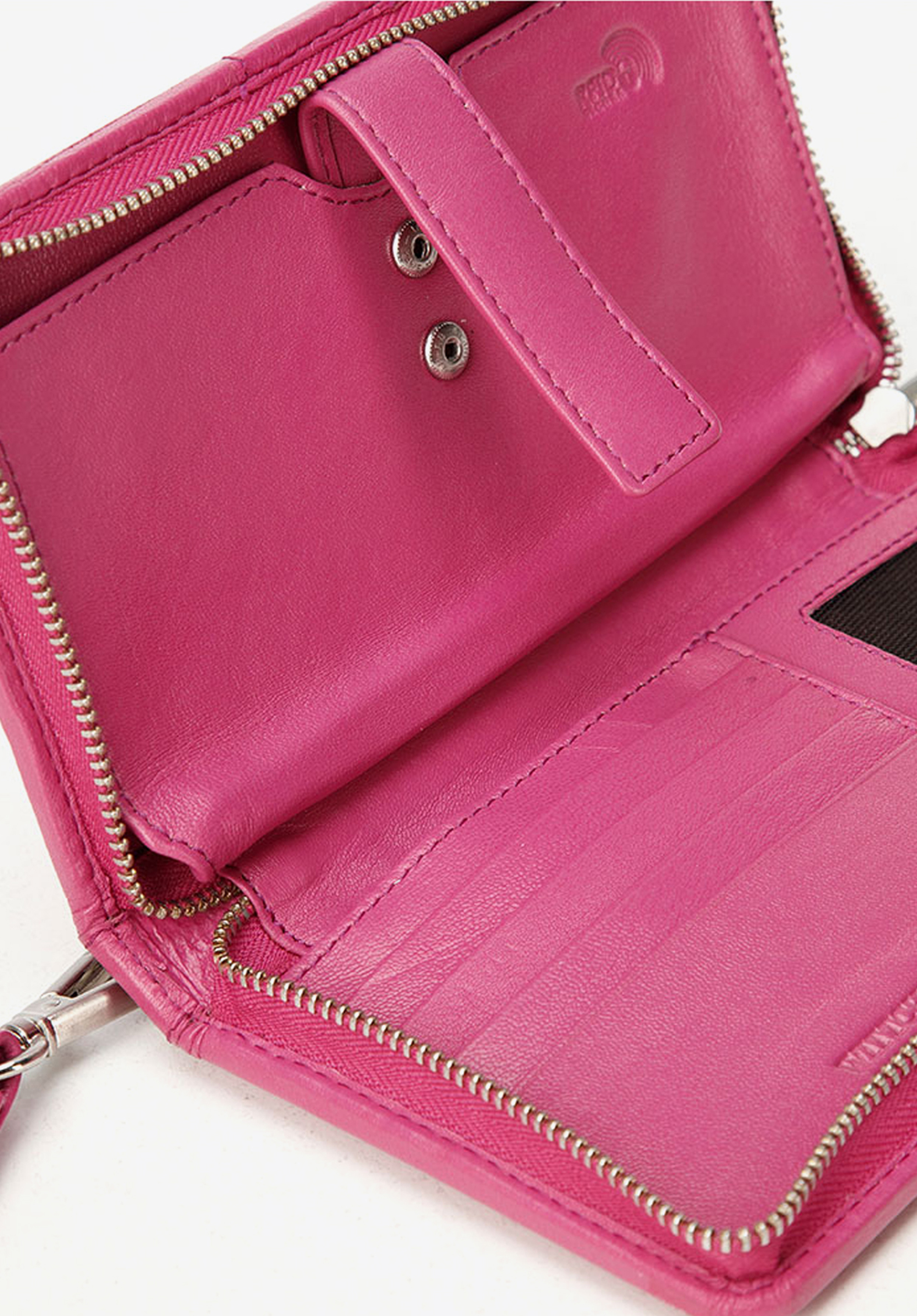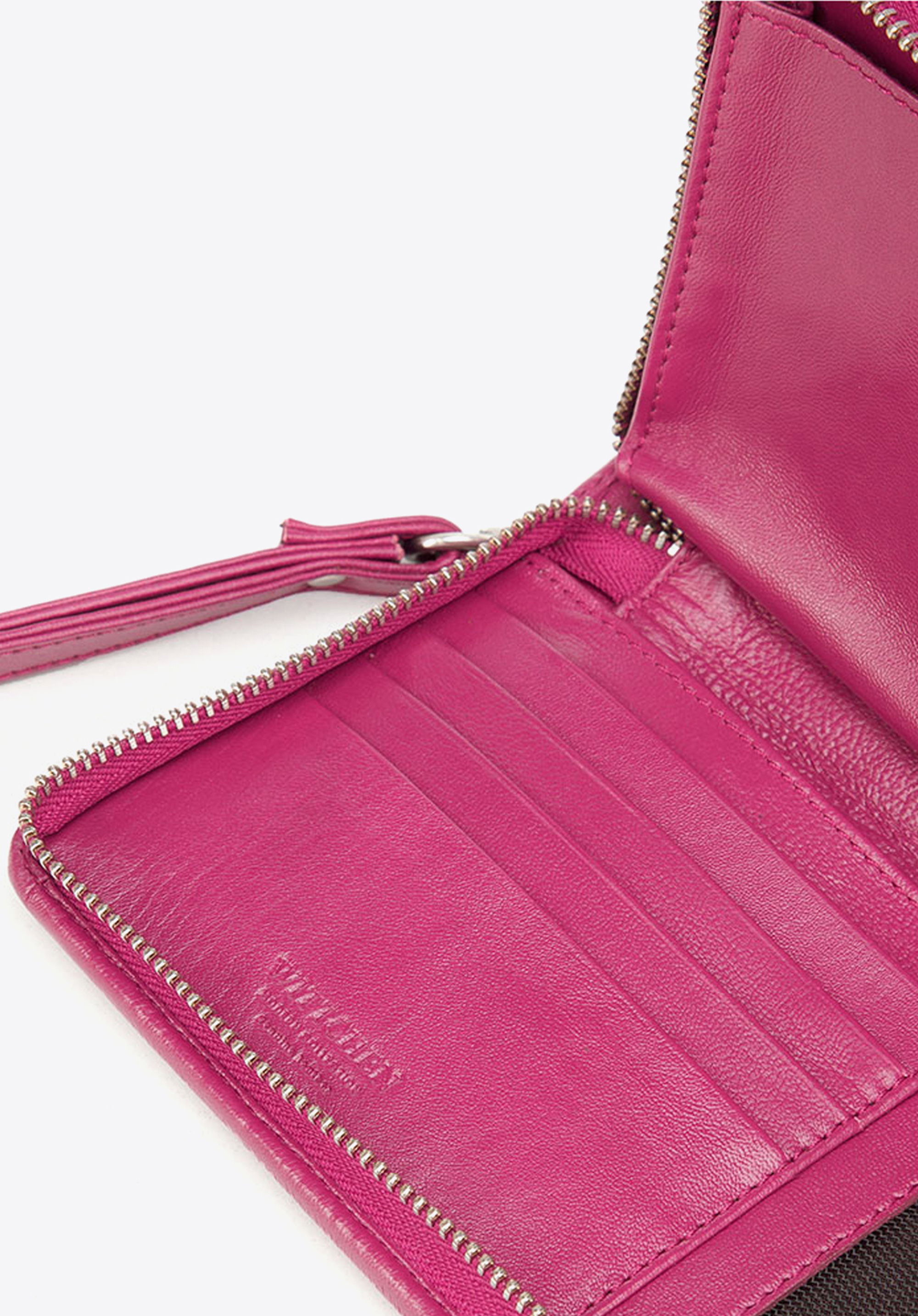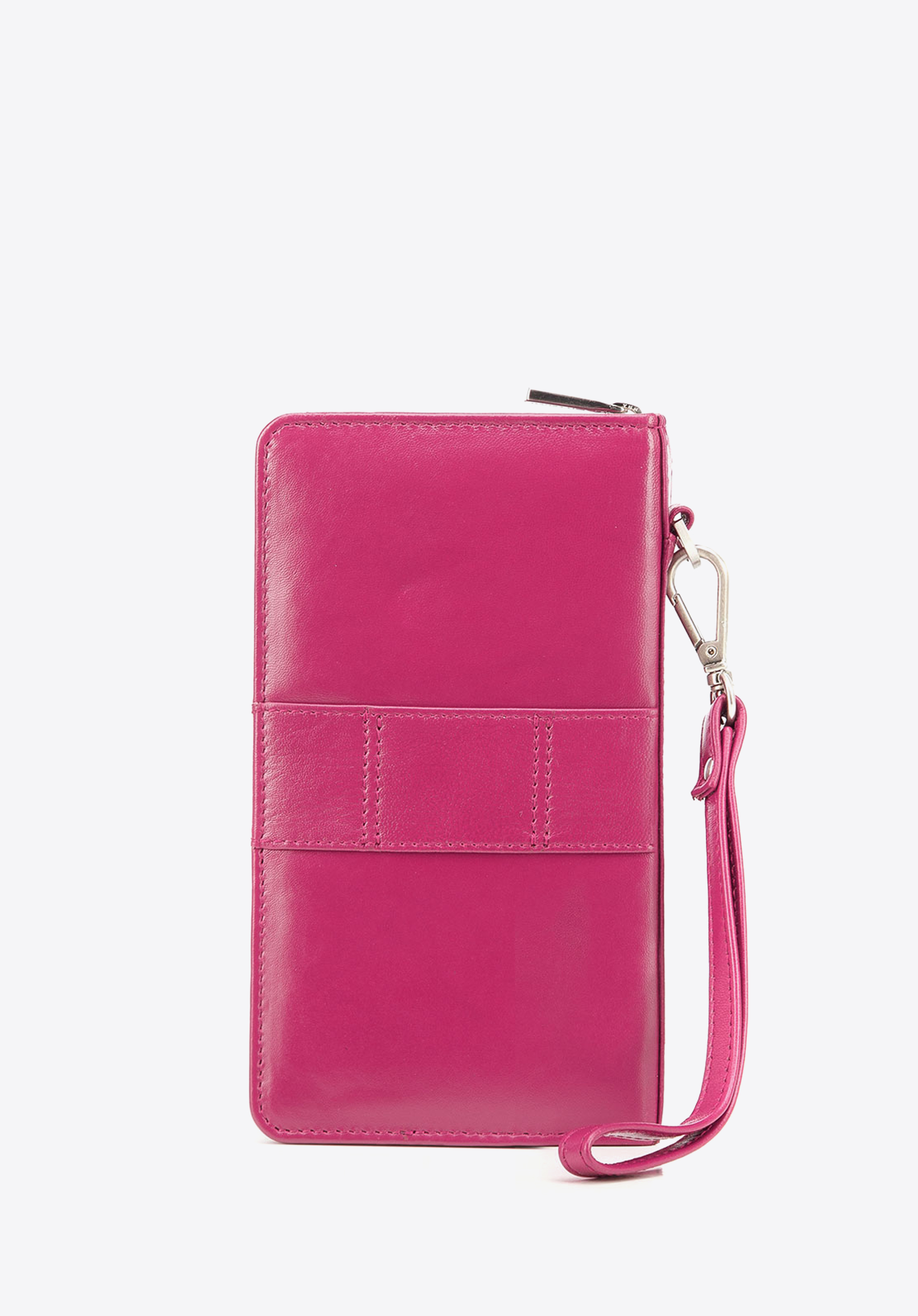 Diese Geldbörse für Damen wird aus echtem Leder von höchster Qualität genäht. Das Modell im modernen Design ist mit praktischer Handschlaufe versehen, deswegen können Sie das Accessoire mit einem Riemchen am Handgelenk als modische Clutch tragen. Neben den praktischen Schein- und Kartenfächern verfügt dieses Modell über ein mittiges Handyfach und eine Schlaufe, mit der Sie den Geldbeutel an Ihrem Gürtel problemlos befestigen. Außerdem ist es mit einem RFID-blockierenden Innenfutter ausgestattet, das für Daten-Sicherheit sorgt.
