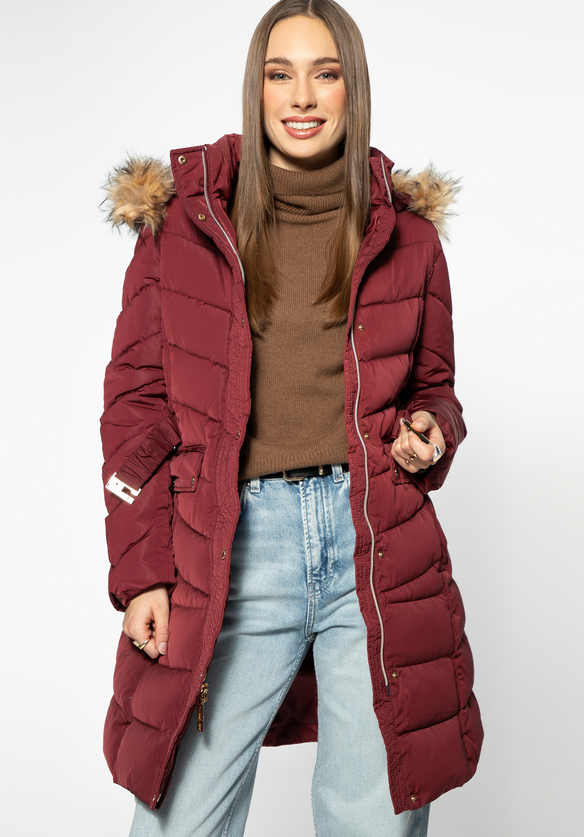 Dieser stilvolle Damenmantel ist eine gute Wahl für Herbst und Winter. Er hat einen leicht verlängerten Schnitt und eine diagonale Steppung, die seinen Charakter unterstreicht. Der zerknitterte Taillengürtel wird mit einer Schnalle geschlossen und betont jeden Tag aufs Neue Ihre Silhouette. Die Kapuze ist mit einem Kunstfellbesatz versehen, den Sie auch abnehmen und nach Belieben tragen können. In den seitlichen Eingrifftaschen können Sie Ihre Hände bequem verstecken und sie vor Kälte schützen. Der Steppmantel für Damen mit Gürtel ist ein zeitloses Accessoire, das sowohl zu Stiefeln mit Absatz als auch zu Plateau-Trappern gut aussieht.