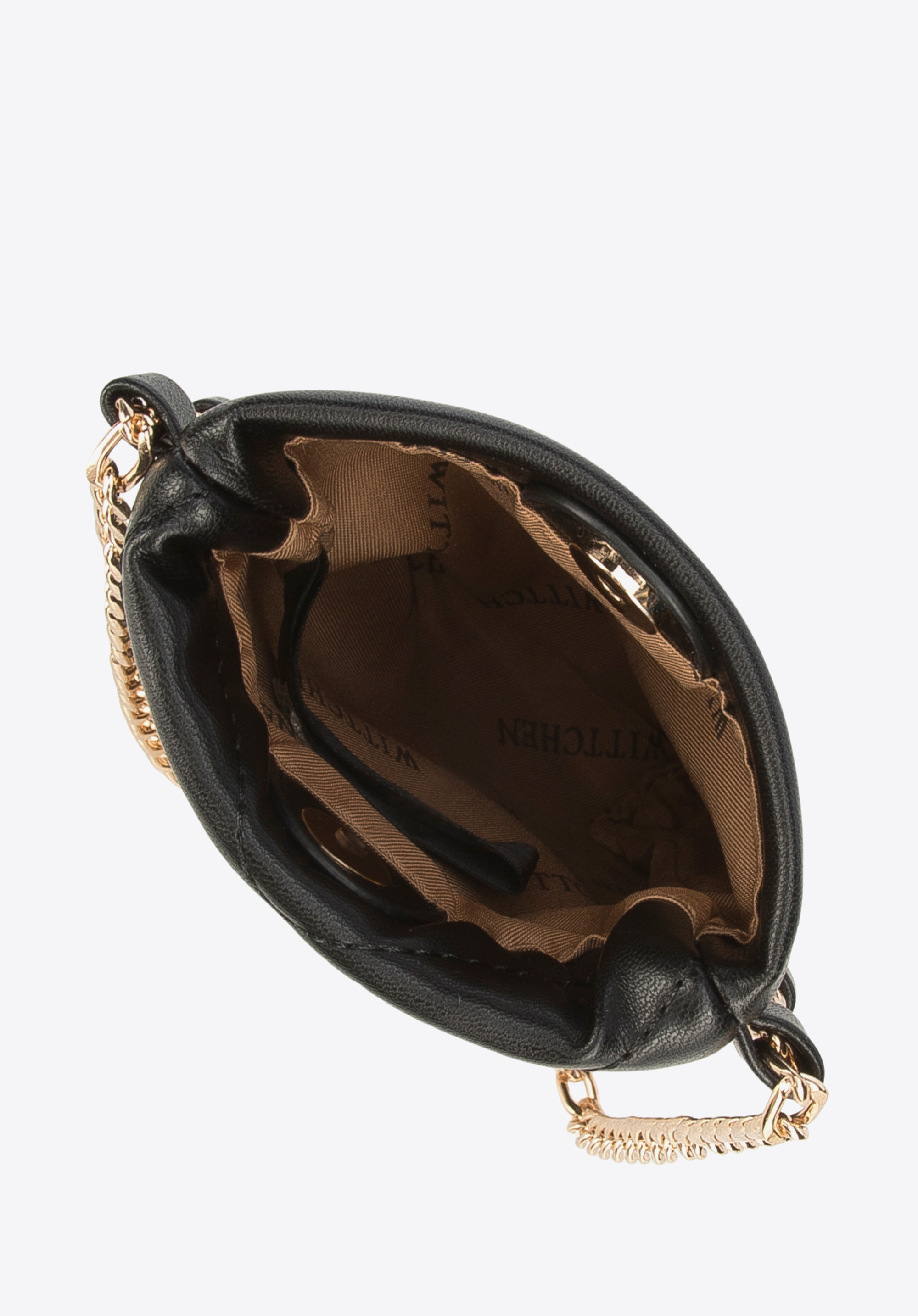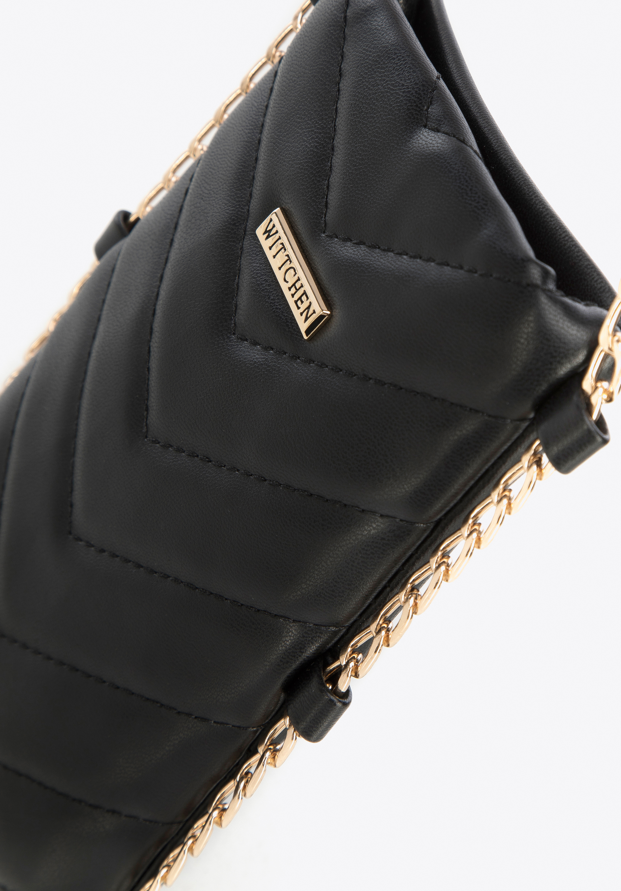 Diese stilvolle Minitasche zieht alle Blicke auf sich. Sie ist aus angenehmem Öko-Leder gefertigt und V-förmig gesteppt. Sie ist weich und ihre Form wird durch die glänzende Kette an den Seiten betont. Darin können Sie Ihr Handy, Ihr Kartenetui und Ihren Lieblingslippenstift verstauen. Dieses Modell passt perfekt zur Abendgarderobe, aber Sie können sie auch im Alltag zu Ihrer Lieblingsjeans und Ihrem Lieblingshemd tragen. Die gesteppte Minitasche aus Öko-Leder mit Kette ist ein originelles, universelles Accessoire, das Sie jeden Tag brauchen werden.