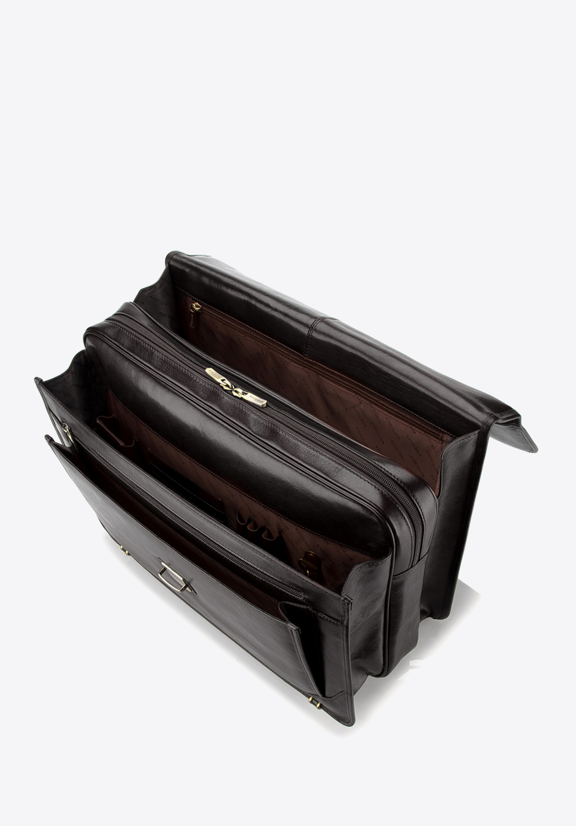 Eine Lederaktentasche für Dokumente, handgefertigt aus feinem, glänzendem Kalbsleder, ist ein Vorschlag für die Person, die hohe Qualität schätzt. Die rationelle Aufteilung in Fächer ermöglicht es, die gewünschte Ordnung zu halten.