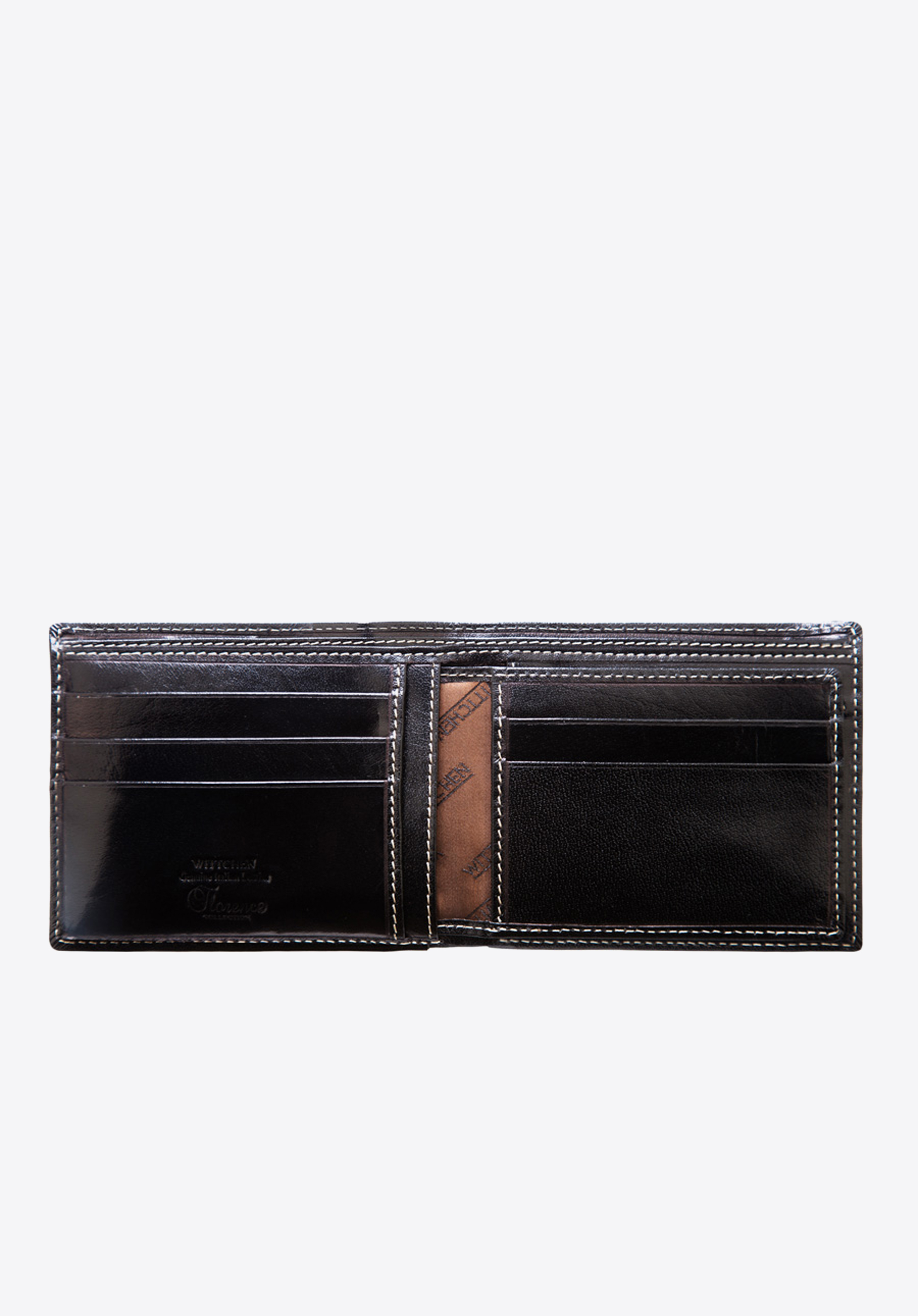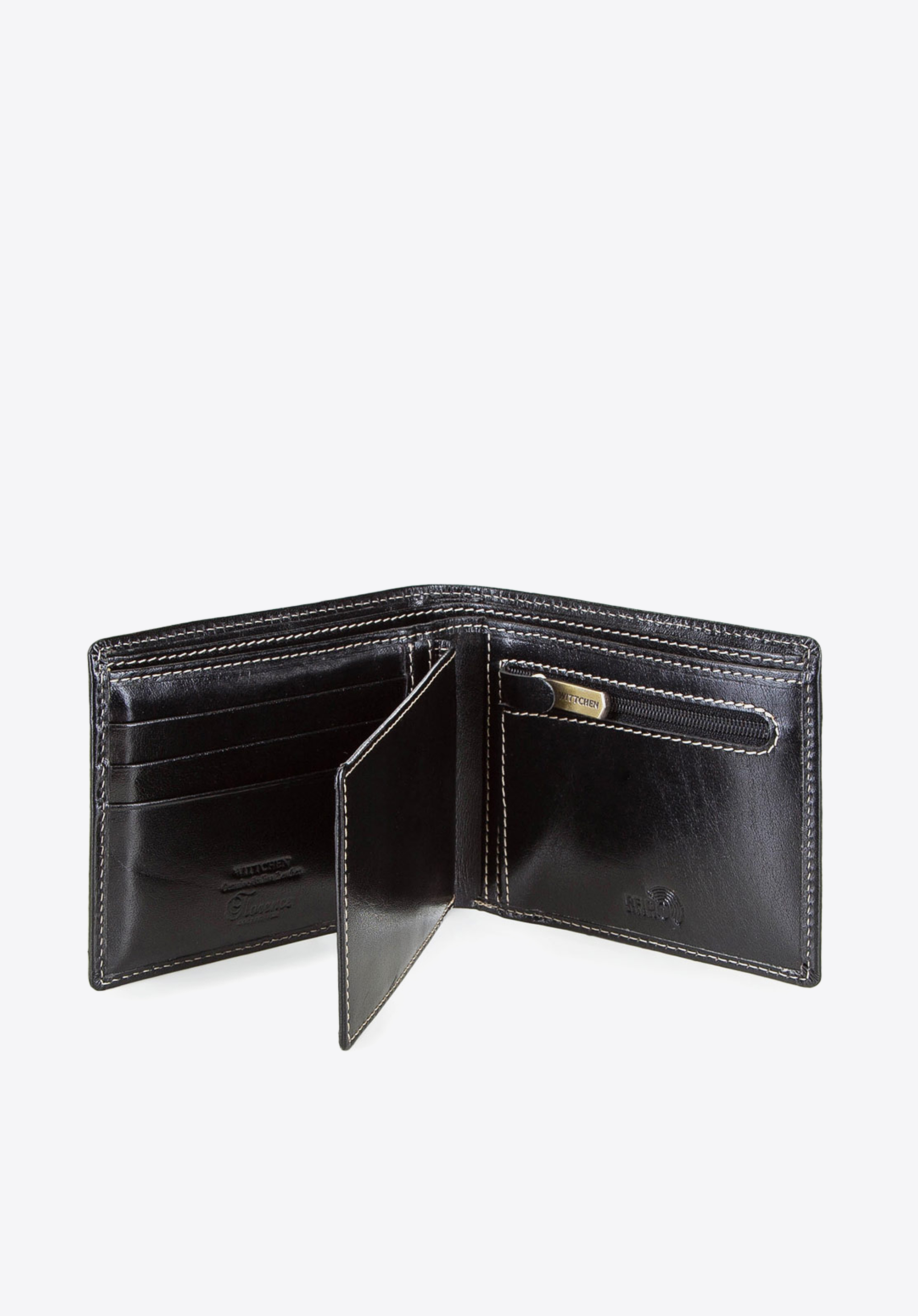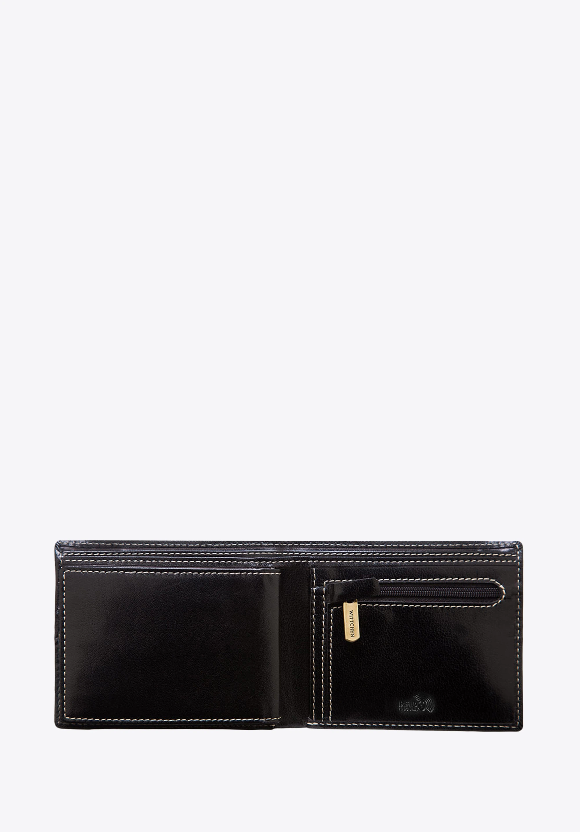 Mit äußerster Präzision aus weichem Kalbsleder gefertigte Geldbörse. Sie verfügt über ein zusätzliches, herausnehmbares Fach für Kreditkarten und Dokumente. Mit innovativem Innenfutter, das das Scannen der Kartendaten verhindert. Sie ist mit einer Verzierung in Form des WITTCHEN-Wappens versehen, das in das Leder geprägt ist.