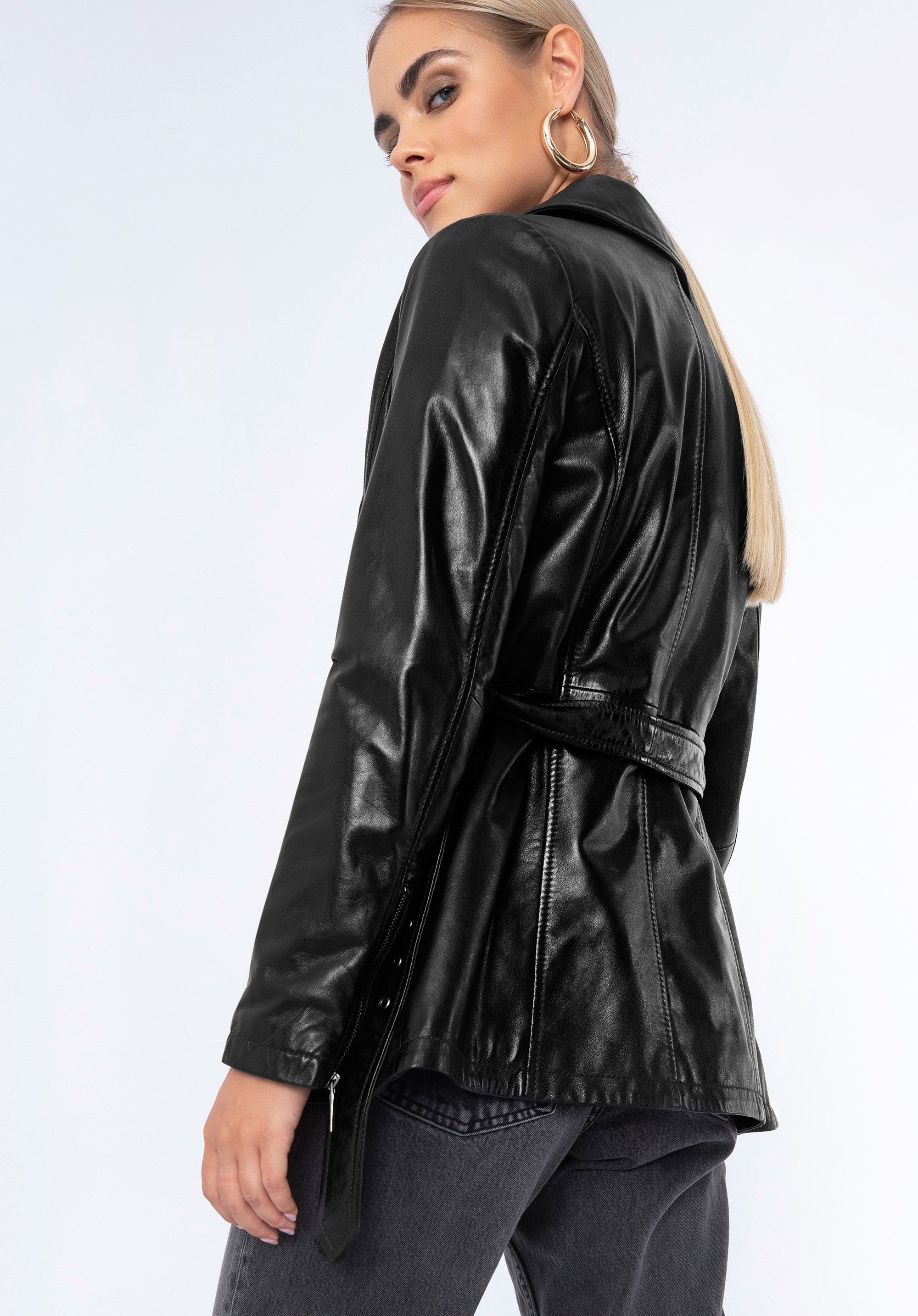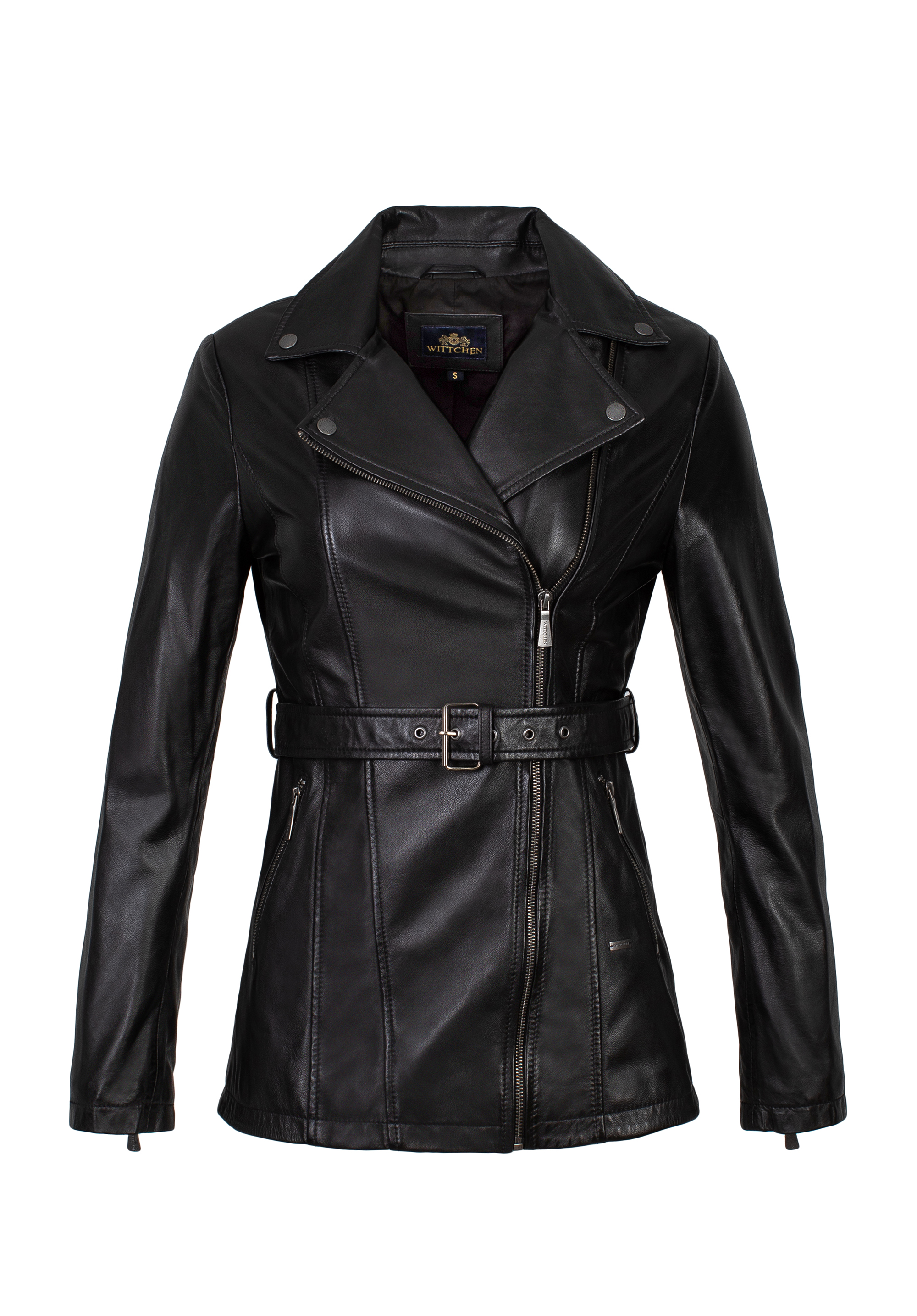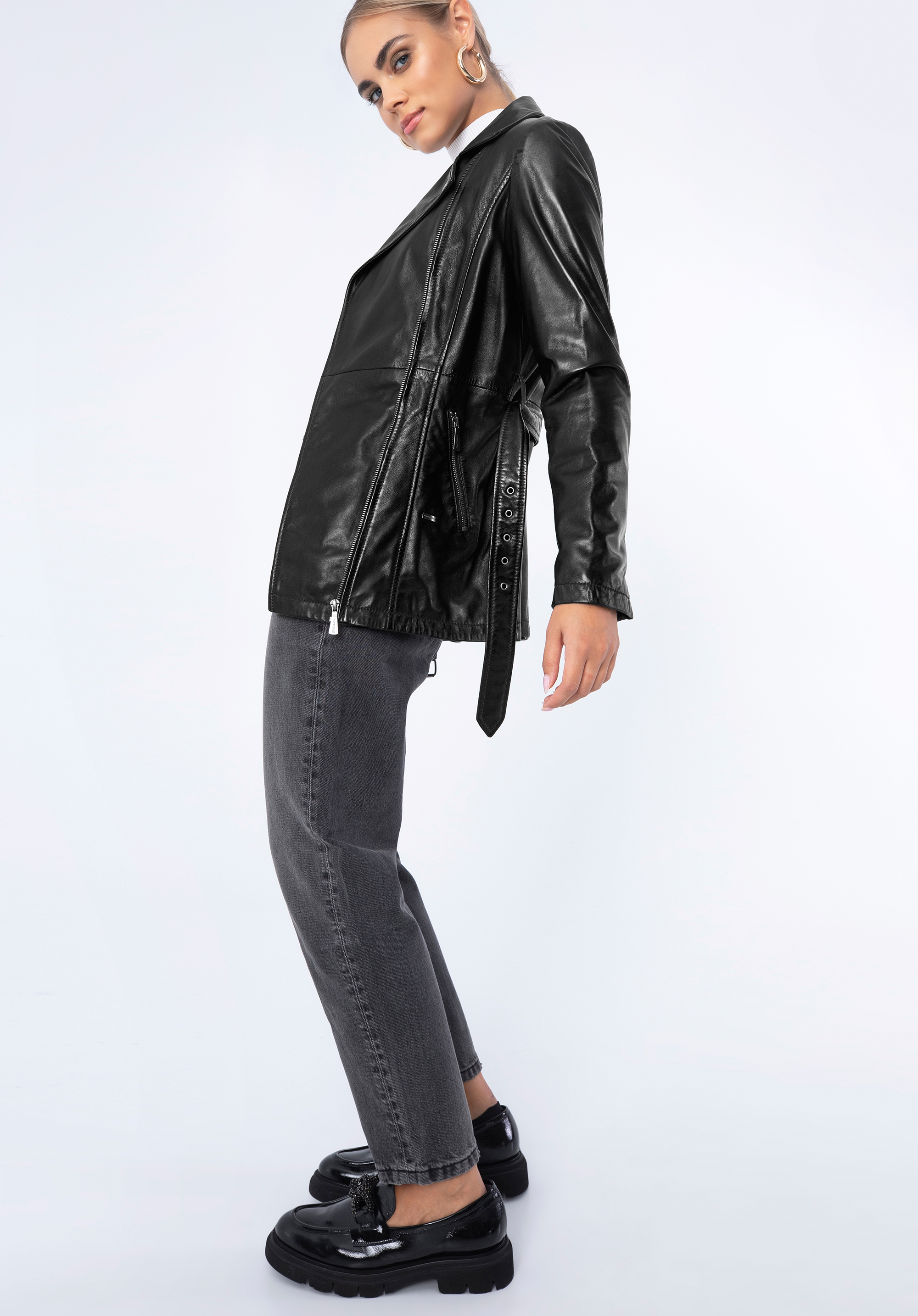 Diese stilvolle Damenjacke wird mehr als nur ein Auge auf sich ziehen. Der asymmetrische Reißverschluss, der abnehmbare Kragen und die glänzenden Druckknöpfe, die für Ramones charakteristisch sind, kommen in einem einzigartigen verlängerten Schnitt, der bis zur Hüfte oder hinter die Hüfte reicht. Die Taille wird durch den Gürtel betont, der abnehmbar ist und somit nach Belieben getragen werden kann. Dieses Modell ist aus hochwertigem Naturleder gefertigt, das sich sehr angenehm anfühlt. Tragen Sie es zu Ihrem Lieblings-Minikleid oder zu einem lässigen Ensemble mit Jeans und Sweatshirt - Sie werden in jeder Situation stilvoll aussehen. Die Damen-Lederjacke mit Gürtel ist ein Accessoire, das Sie im Herbst und Frühjahr jeden Tag brauchen.