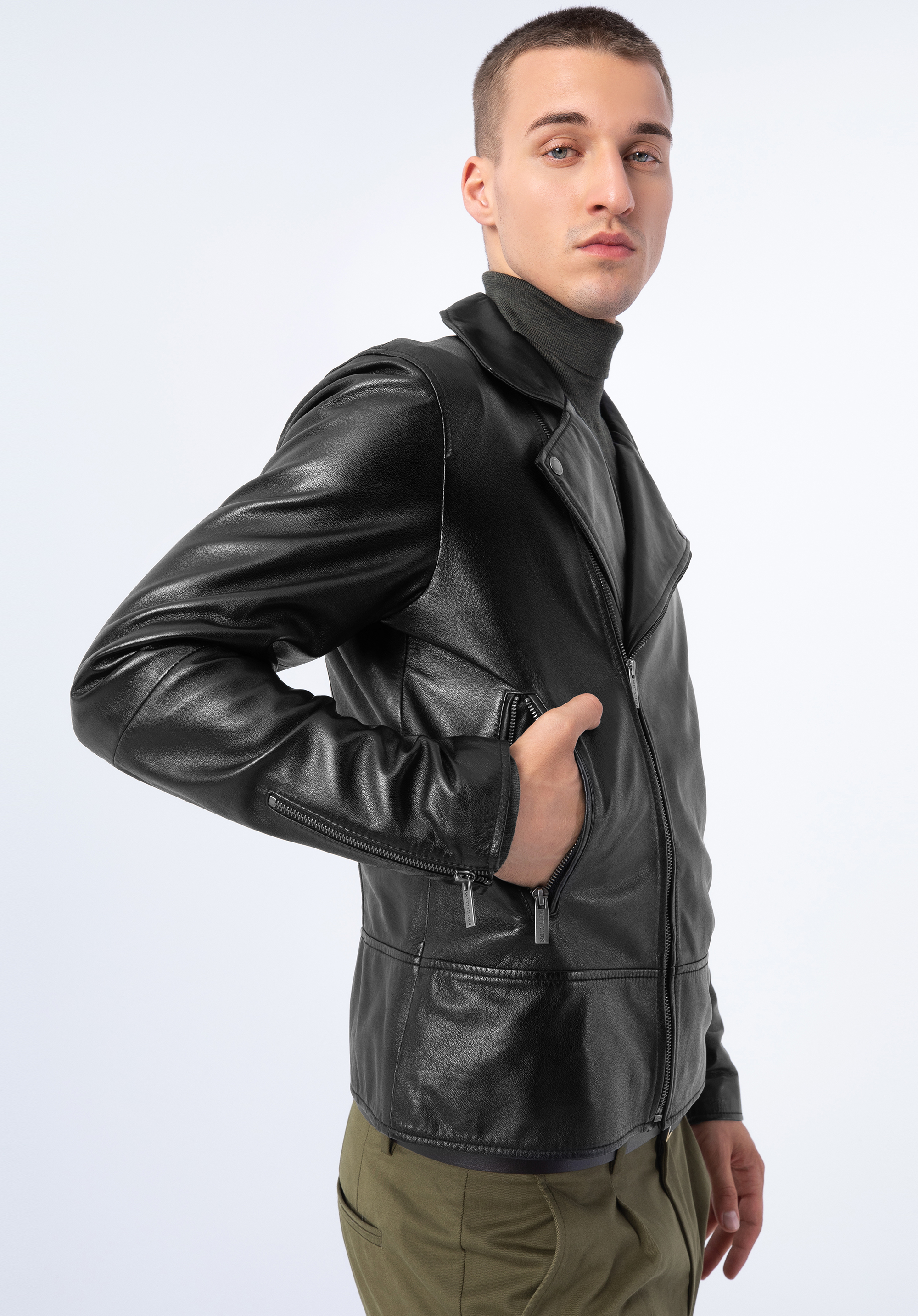 Die Herren-Ramoneska ist eine gute Wahl für einen Mann mit Charakter. Der zeitlose Schnitt mit Umlegekragen, asymmetrischem Reißverschluss und glänzenden Druckknöpfen bringt Abwechslung in fast jedes Outfit. Dieses Modell ist aus angenehm zu tragendem Naturleder gefertigt. Der waagerechte Saum am unteren Ende der Jacke sowie die Schlitze und Reißverschlüsse an den Ärmeln unterstreichen den Stil. Sie können sie zur Arbeit oder mit Freunden tragen - sie verleiht jedem Outfit einen rockigen Touch. Die klassischen Herren-Leder-Ramones sind im Frühling, im Herbst und auch an kühleren Sommerabenden sehr praktisch.
