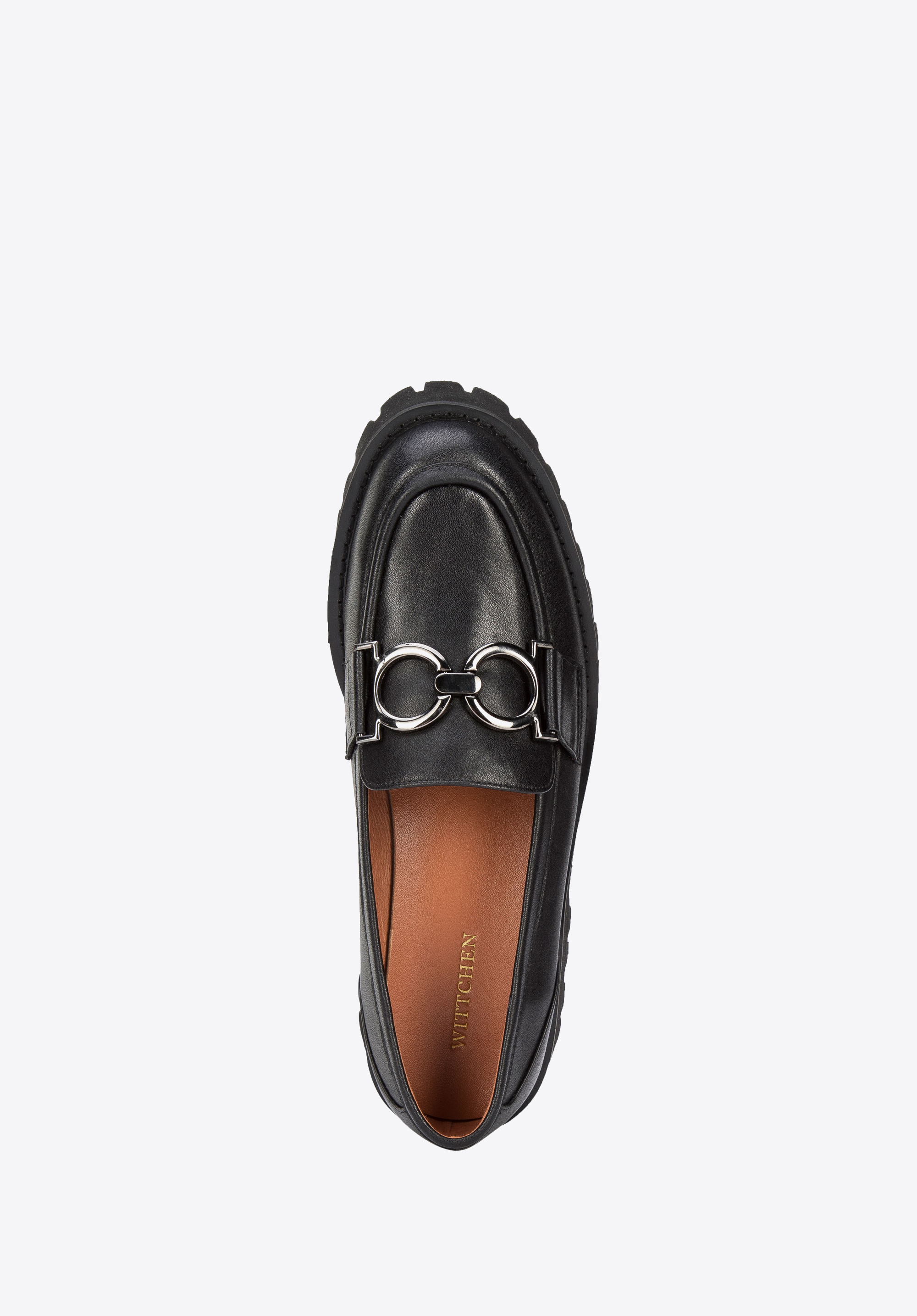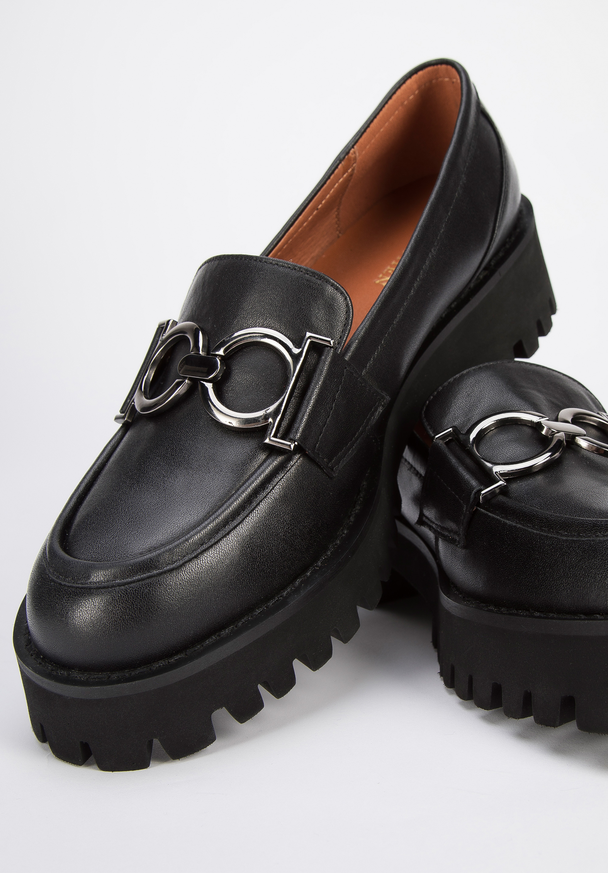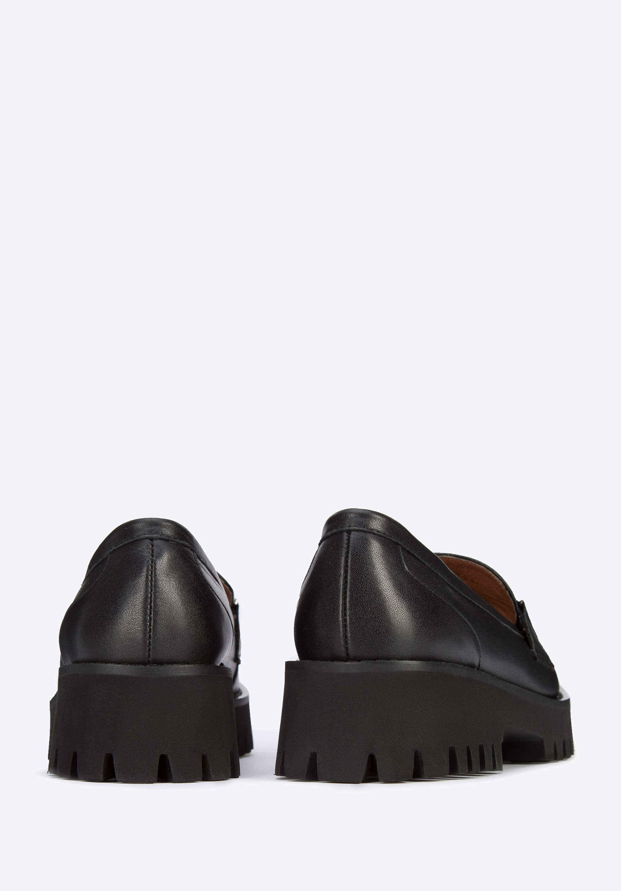 schwarze Mokassins aus Leder mit Schnalle auf dicker Sohle