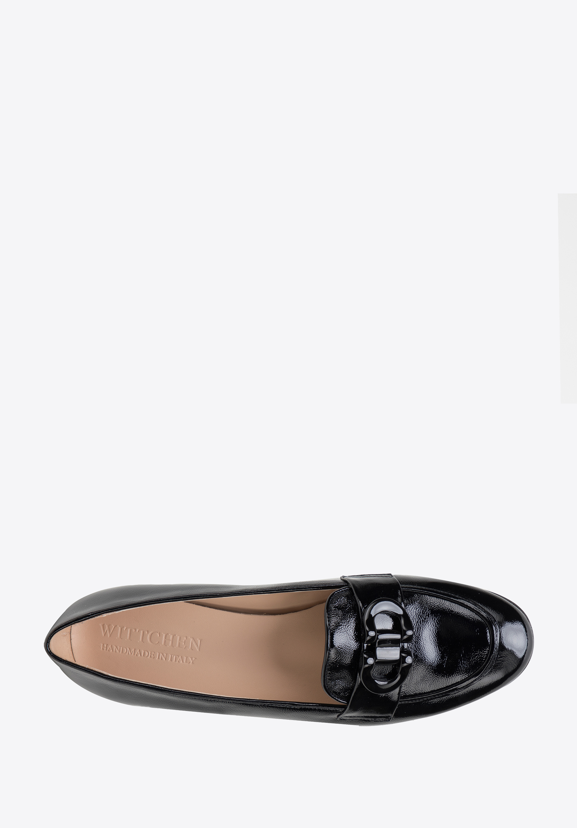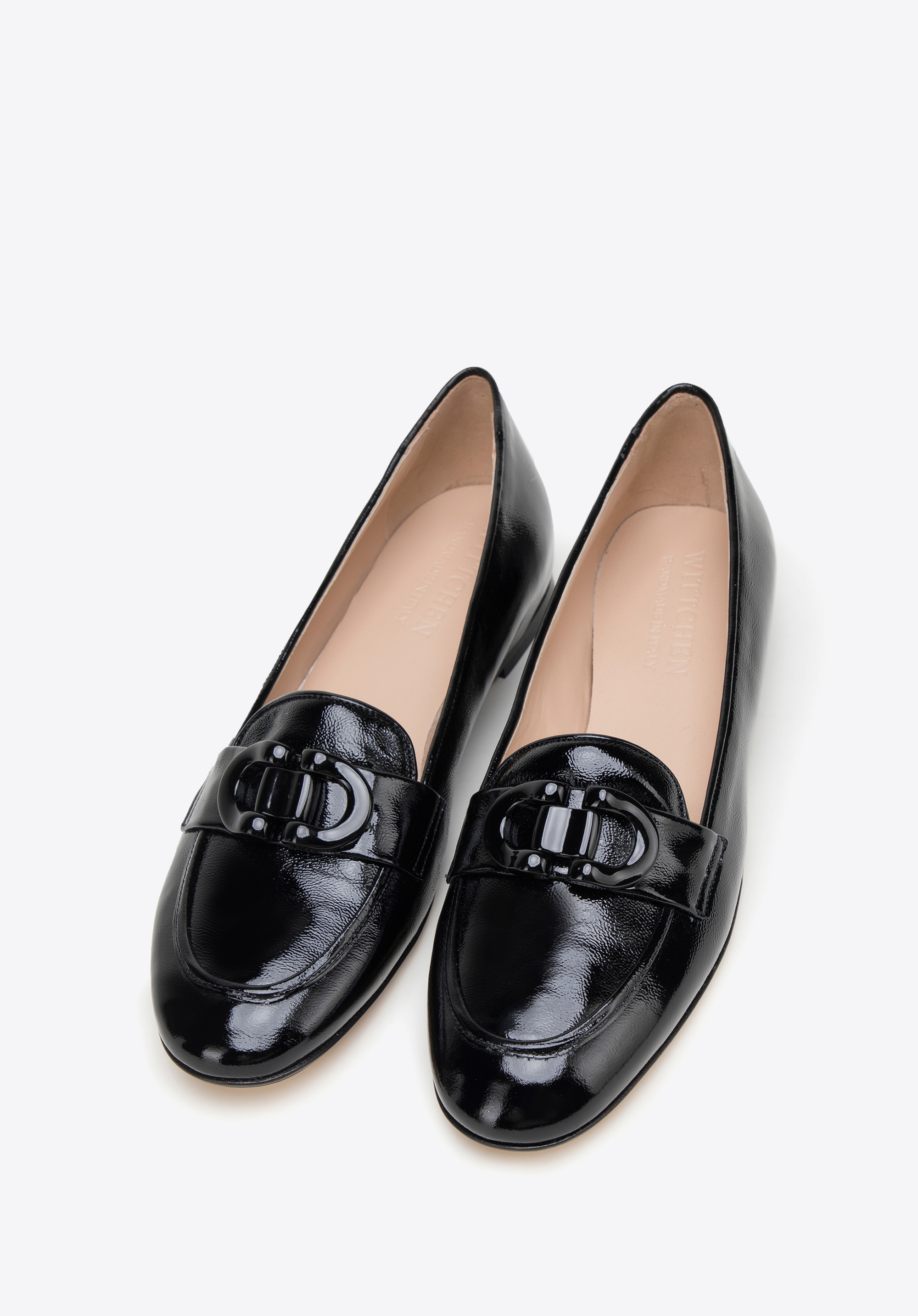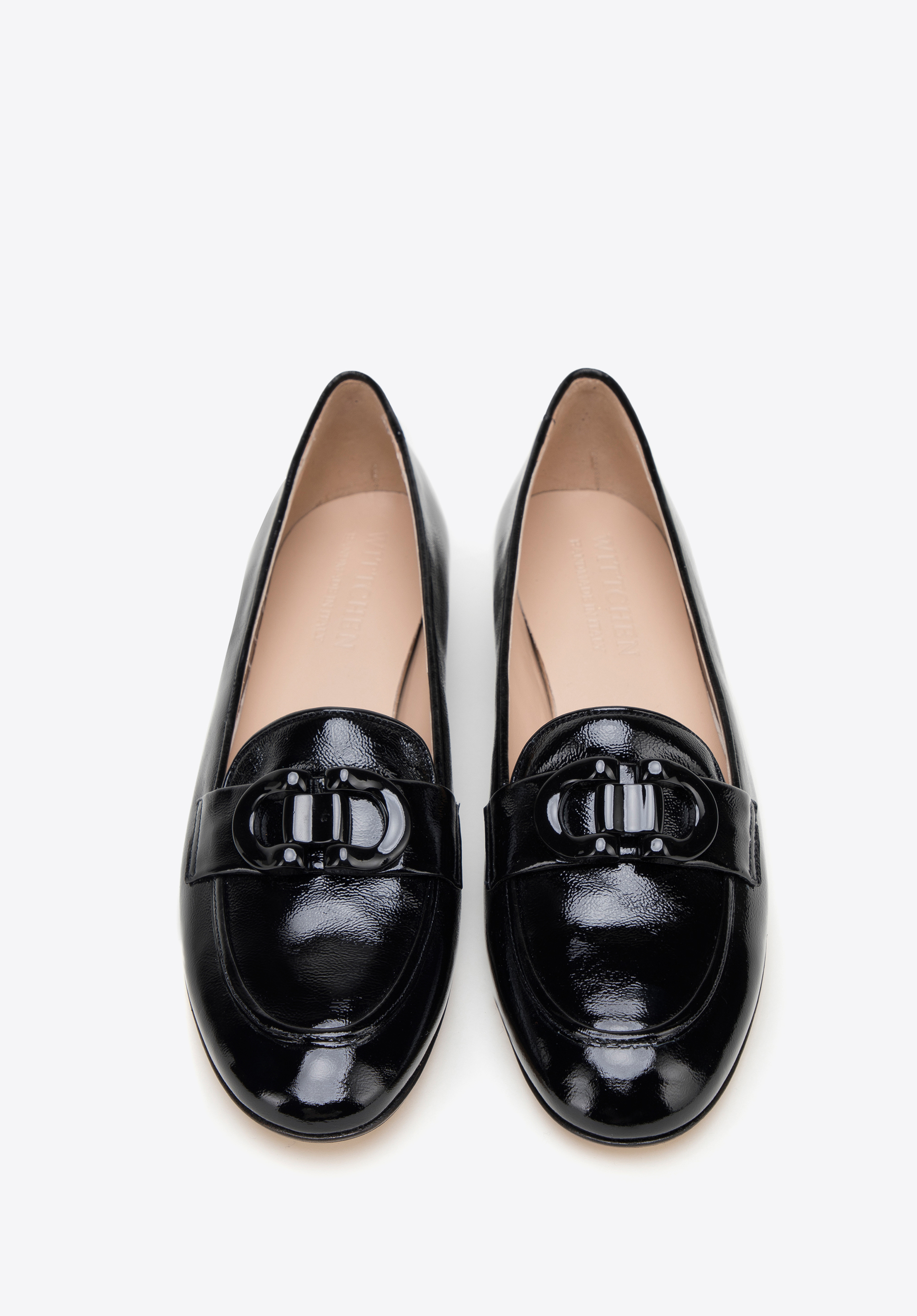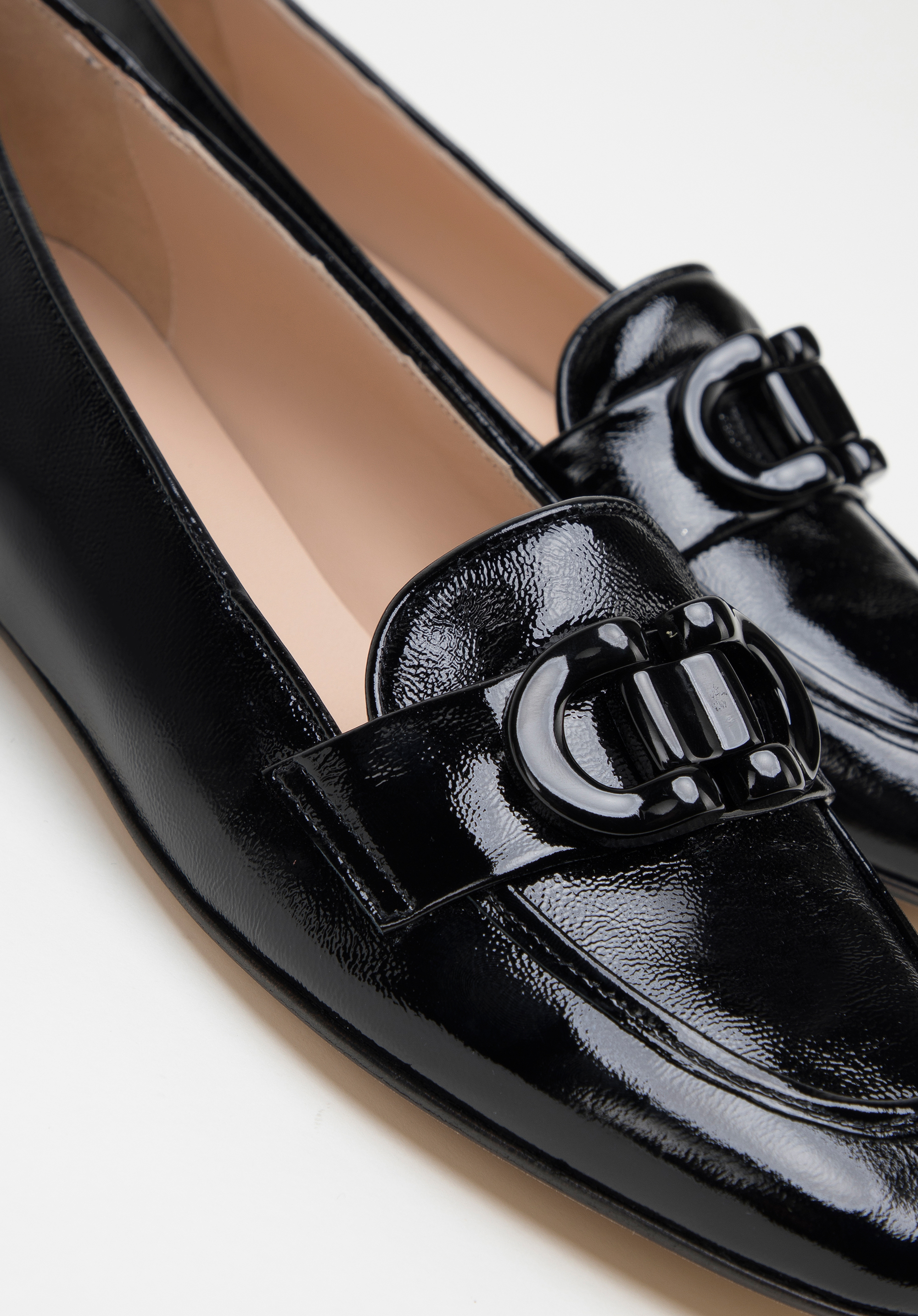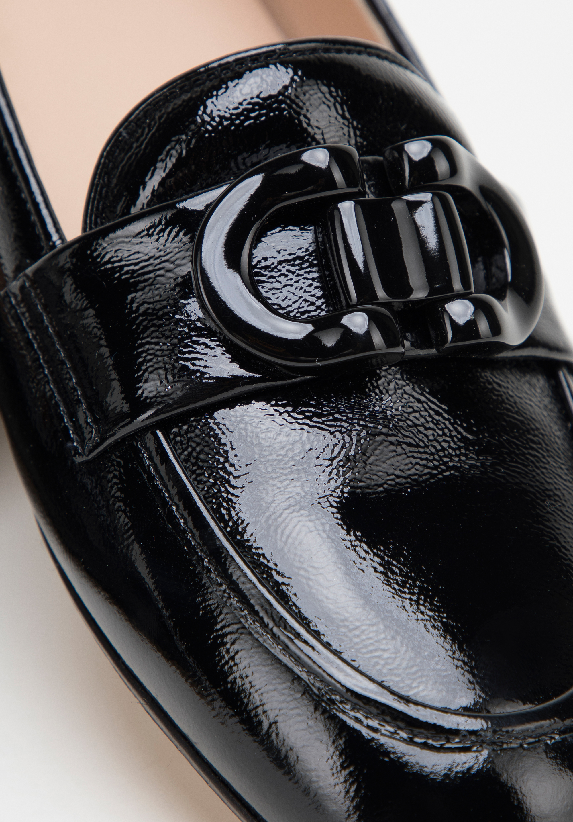 schwarze Mokassins für Damen aus Lackleder mit dekorativer Schnalle