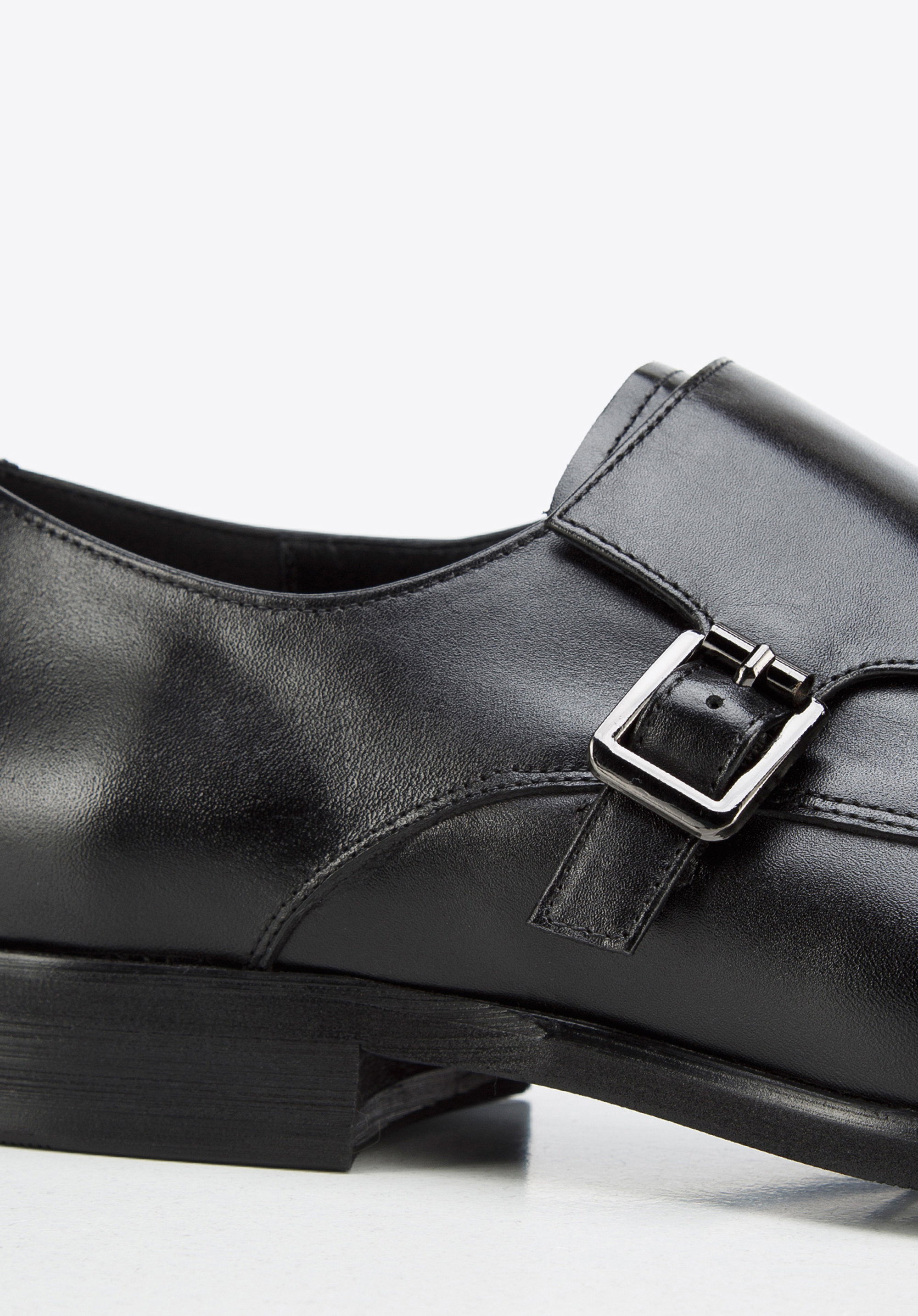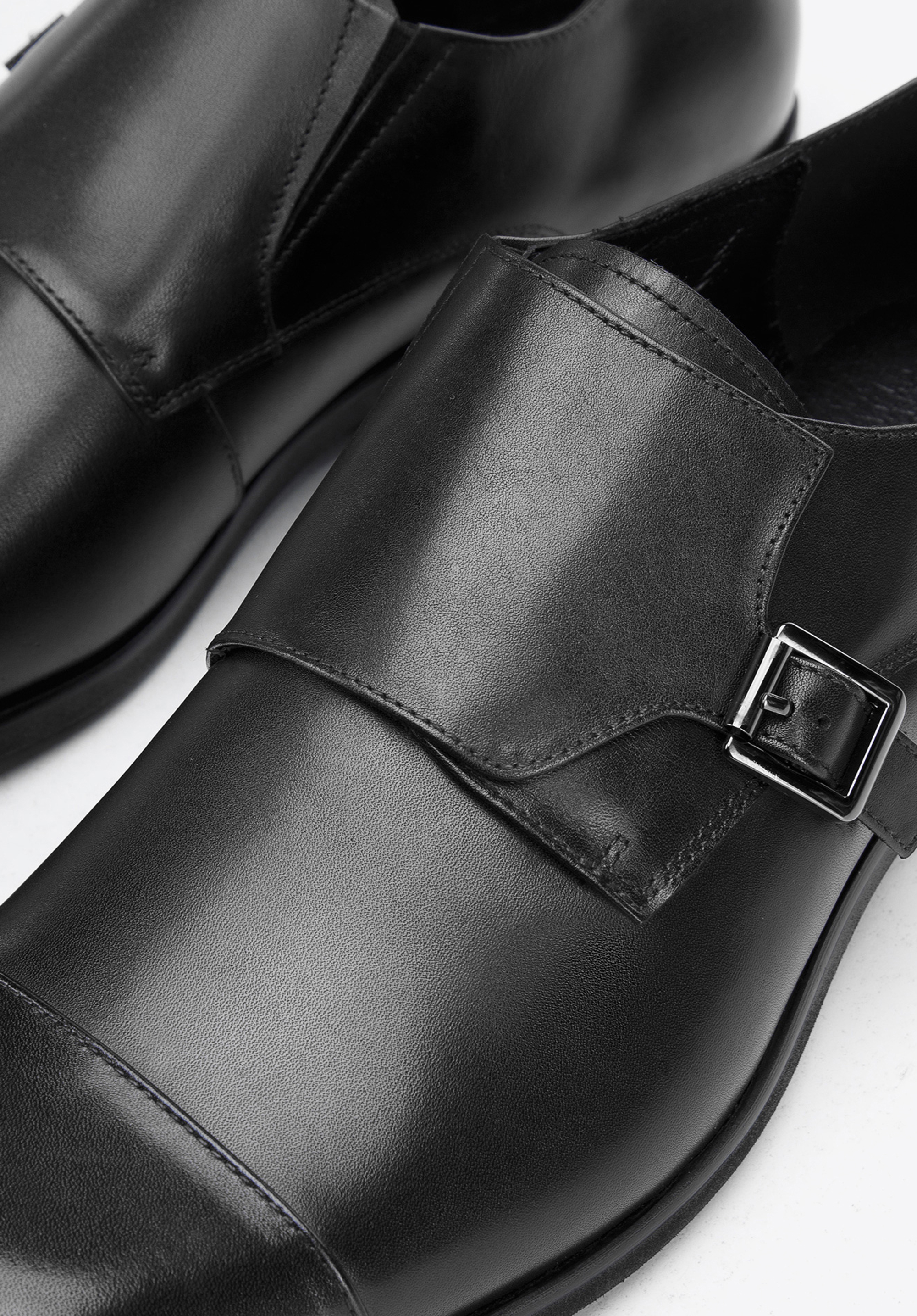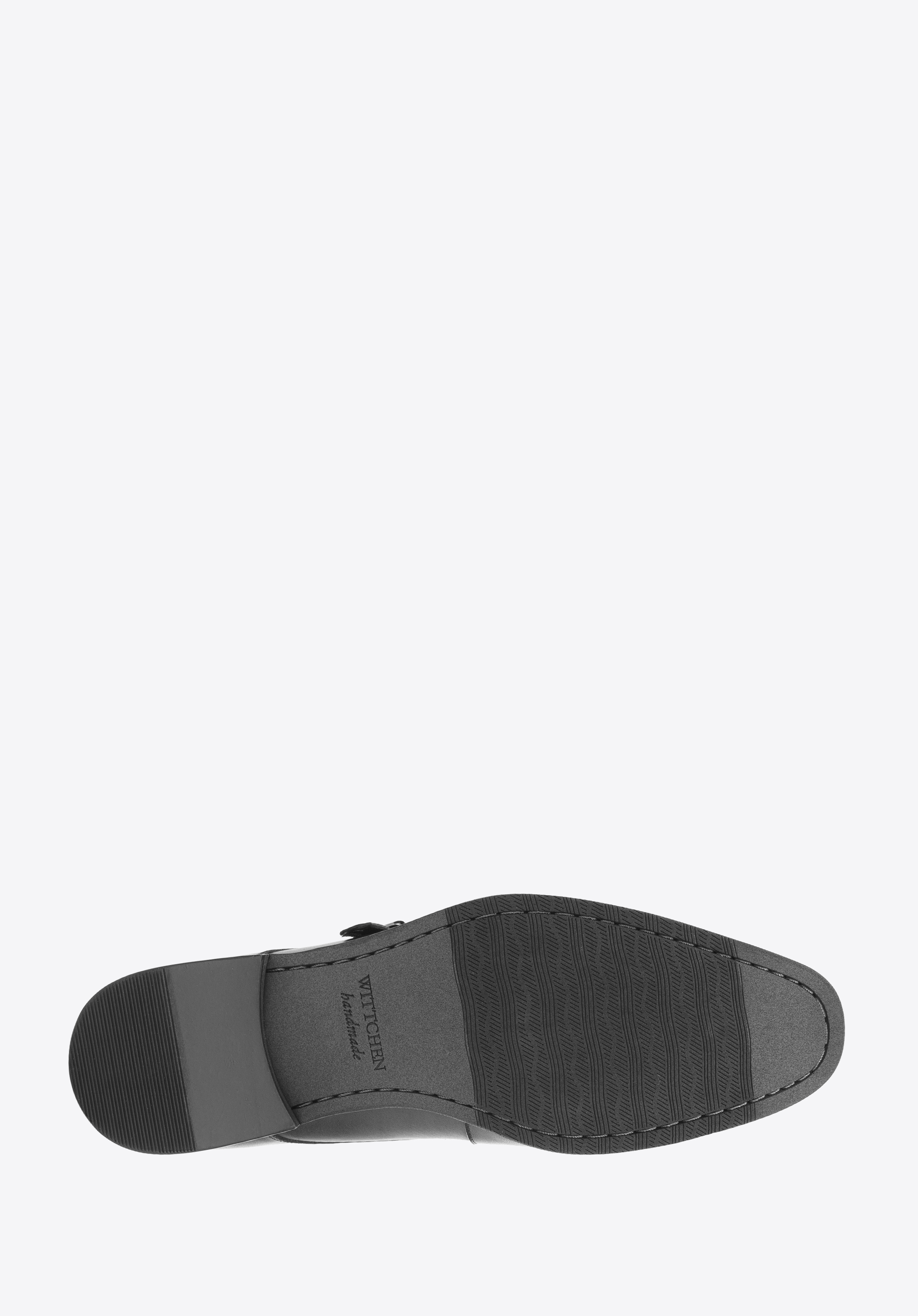 Monkschuhe sind die originelle Schuhe für einen Mann, der stilvoll aussehen will. Sie wurden aus hochwertigem Naturleder hergestellt. Nähte an der Schuhspitze und eine einzelne graphitfarbene Schnalle auf der Vorderseite des Schuhs verleihen ihnen einen besonderen Charakter. Man muss die Schnalle nicht aufmachen, um die Schuhe anzuziehen: Sie haben das versteckte Gummiband, das das Anziehen erleichtert. Der schlanke Schnitt und die mandelförmige Schuhspitze verleihen Ihrem Bein und Ihrer gesamten Silhouette gute Proportionen. Sie können sie jeden Tag tragen, z. B. mit einem Hemd oder mit einem Anzug. Der ungewöhnliche, ausgefallene Schnitt dieser Monkschuhe unterscheidet sie von anderen Herrenschuhen.