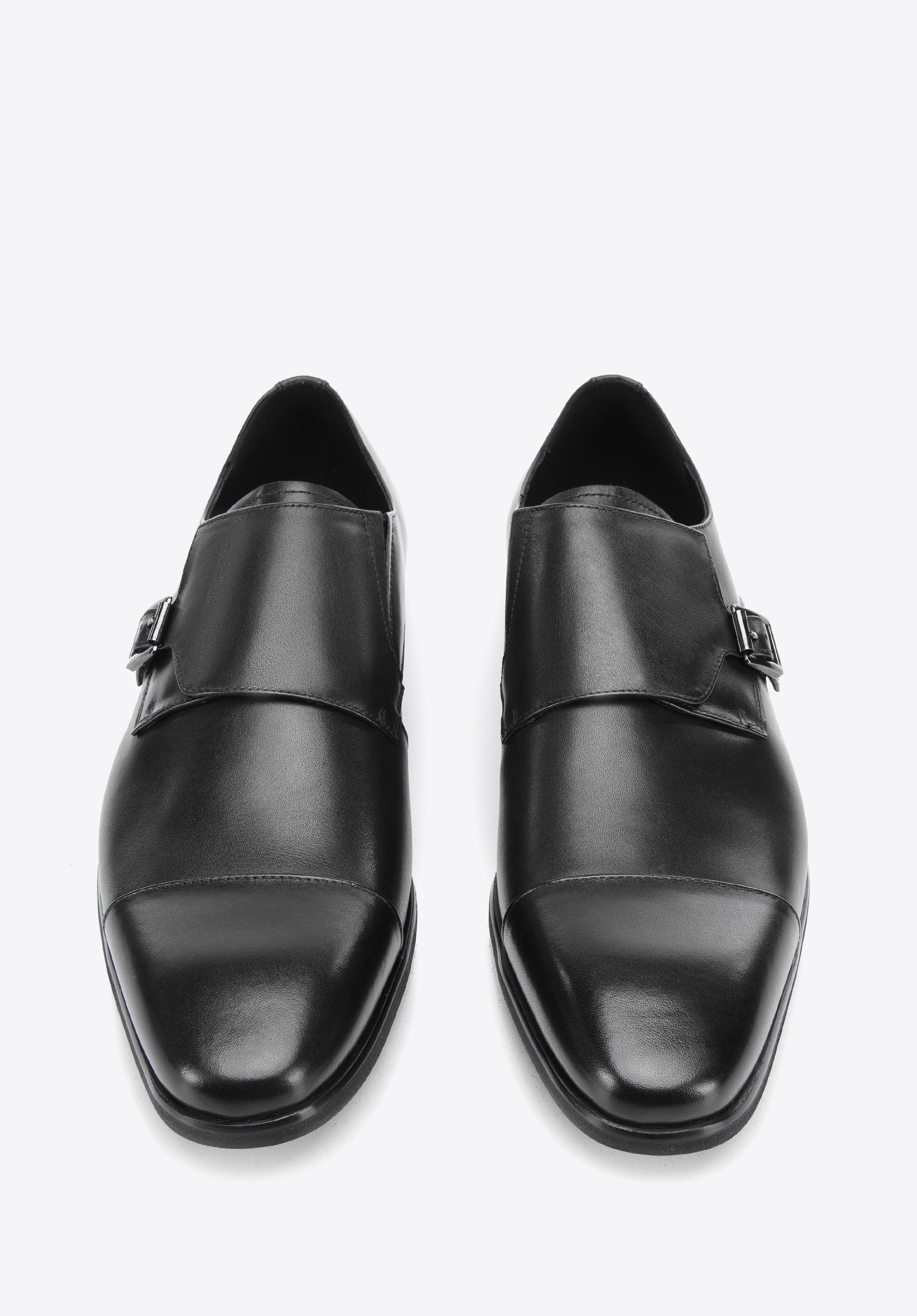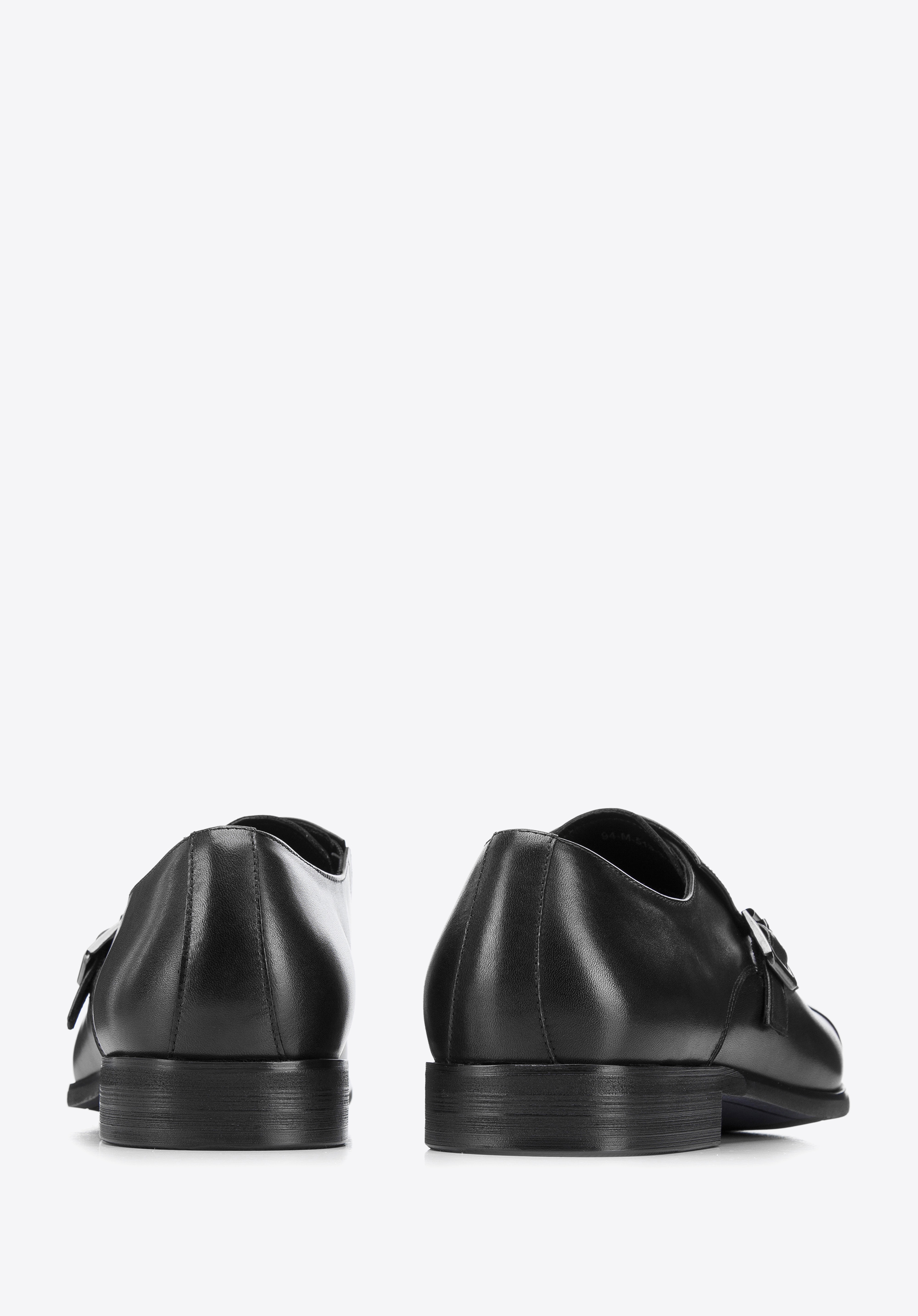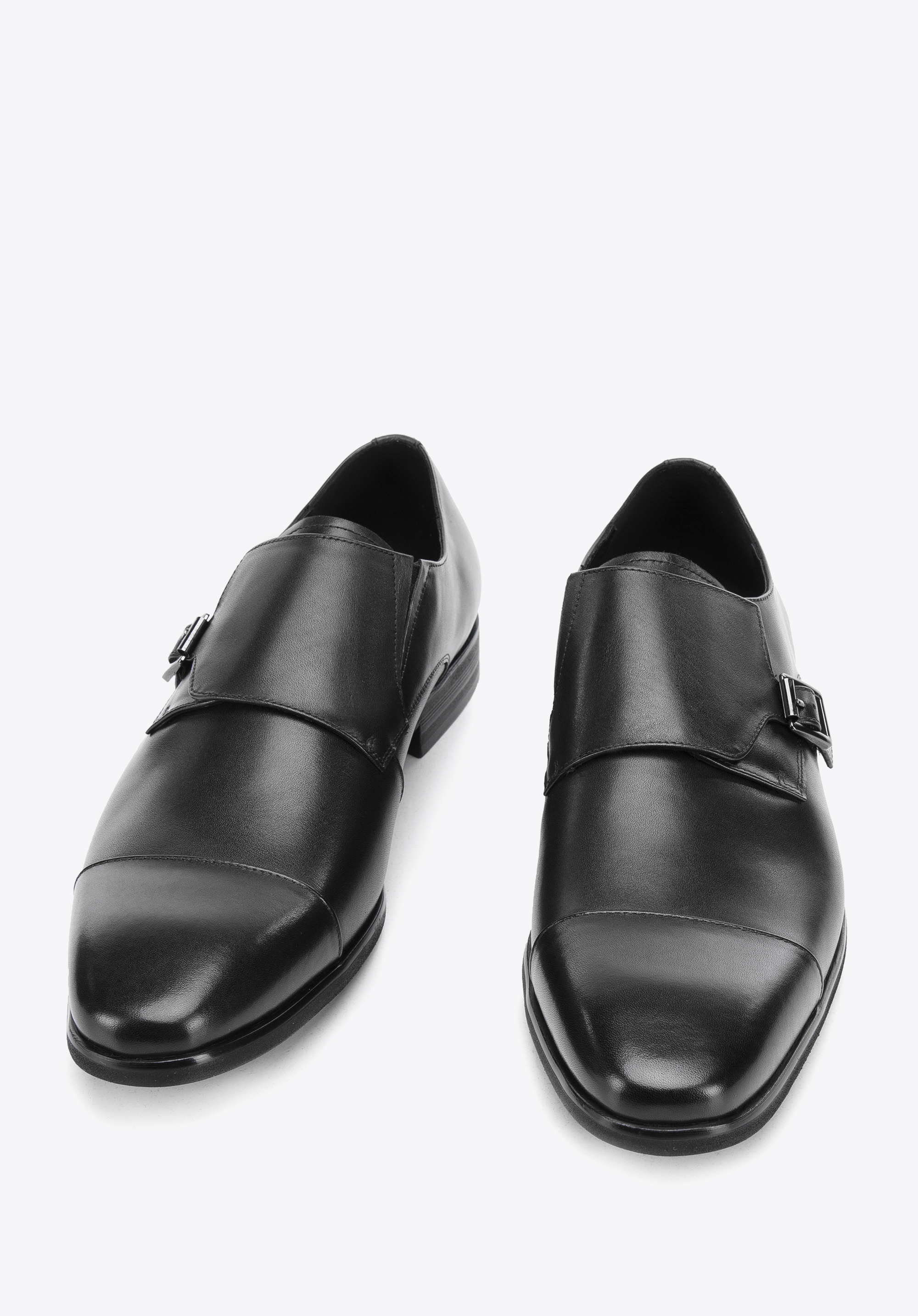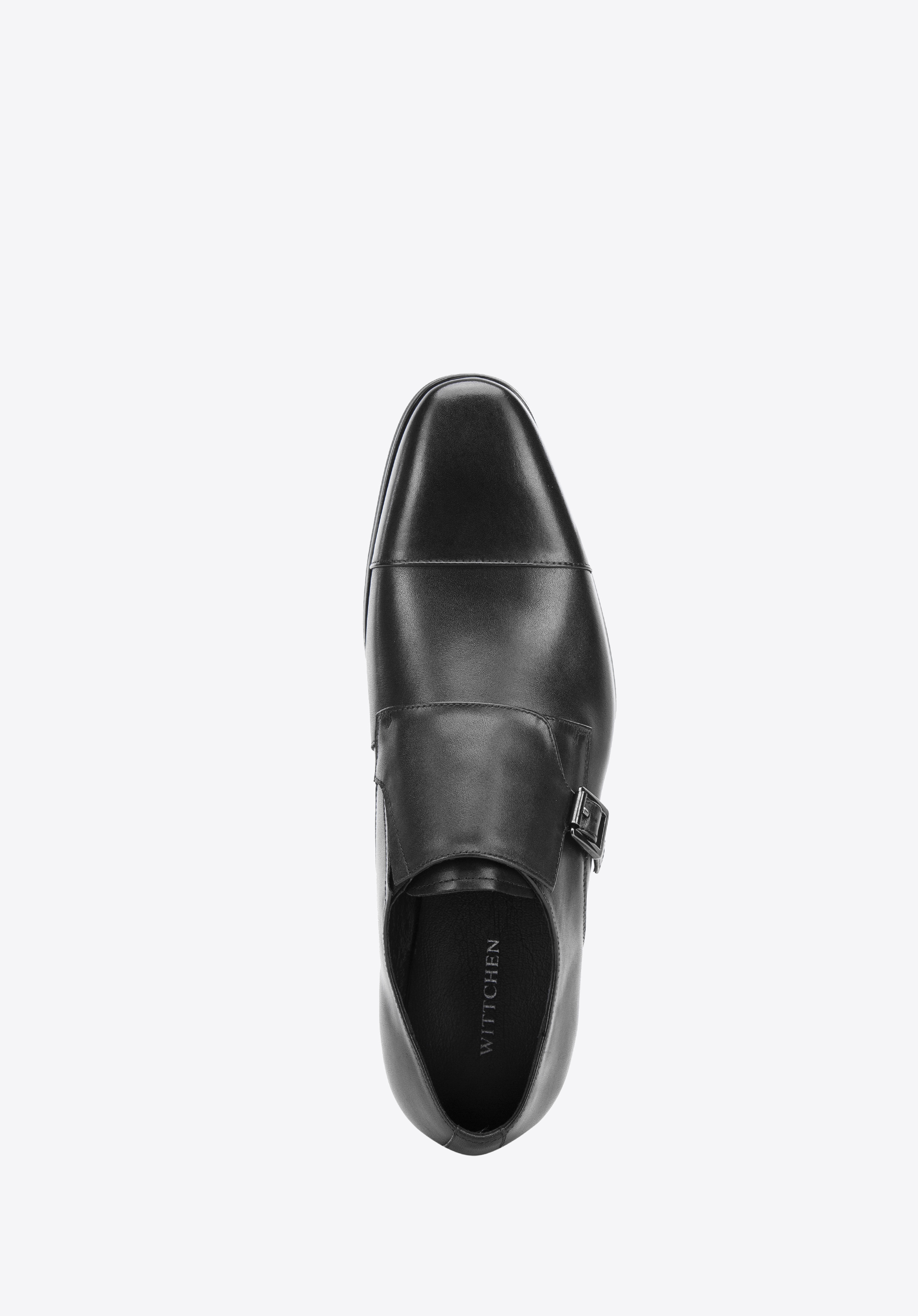 Monkschuhe sind die originelle Schuhe für einen Mann, der stilvoll aussehen will. Sie wurden aus hochwertigem Naturleder hergestellt. Nähte an der Schuhspitze und eine einzelne graphitfarbene Schnalle auf der Vorderseite des Schuhs verleihen ihnen einen besonderen Charakter. Man muss die Schnalle nicht aufmachen, um die Schuhe anzuziehen: Sie haben das versteckte Gummiband, das das Anziehen erleichtert. Der schlanke Schnitt und die mandelförmige Schuhspitze verleihen Ihrem Bein und Ihrer gesamten Silhouette gute Proportionen. Sie können sie jeden Tag tragen, z. B. mit einem Hemd oder mit einem Anzug. Der ungewöhnliche, ausgefallene Schnitt dieser Monkschuhe unterscheidet sie von anderen Herrenschuhen.