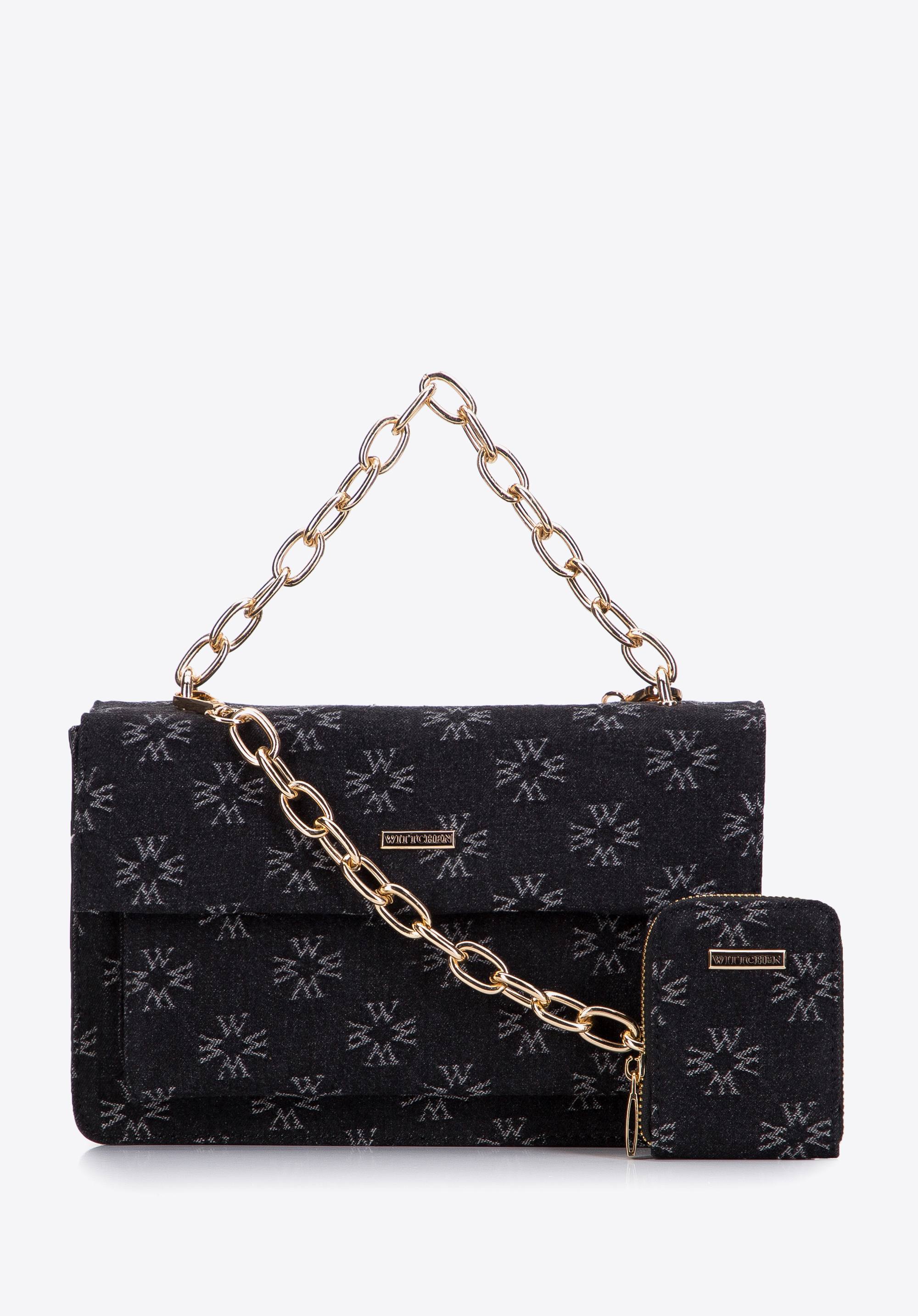 Diese originelle Umhängetasche mit Monogramm unterstreicht Ihren Stil. Ein Denim-Finish mit dem WITTCHEN-Monogramm bedeckt die Vorderseite und den Überschlag der Tasche. Die Seiten sind aus hochwertigem Öko-Leder gefertigt. Im Inneren befinden sich zwei Fächer, in denen Sie alles gut unterbringen können: Geldbörse, Handy, Taschentücher, Handcreme, einen kleinen Kalender und ein paar Kleinigkeiten. Sie können ihn nach Belieben tragen: über der Schulter oder in der Hand, nachdem Sie die lange Kette abgenommen haben. Dieses Modell bringt Abwechslung in fast jedes schlichte Kleid Die Tasche aus Denim mit Monogramm für Damen ist ein modisches Accessoire, das Sie in Ihrer Garderobe unbedingt haben sollten.