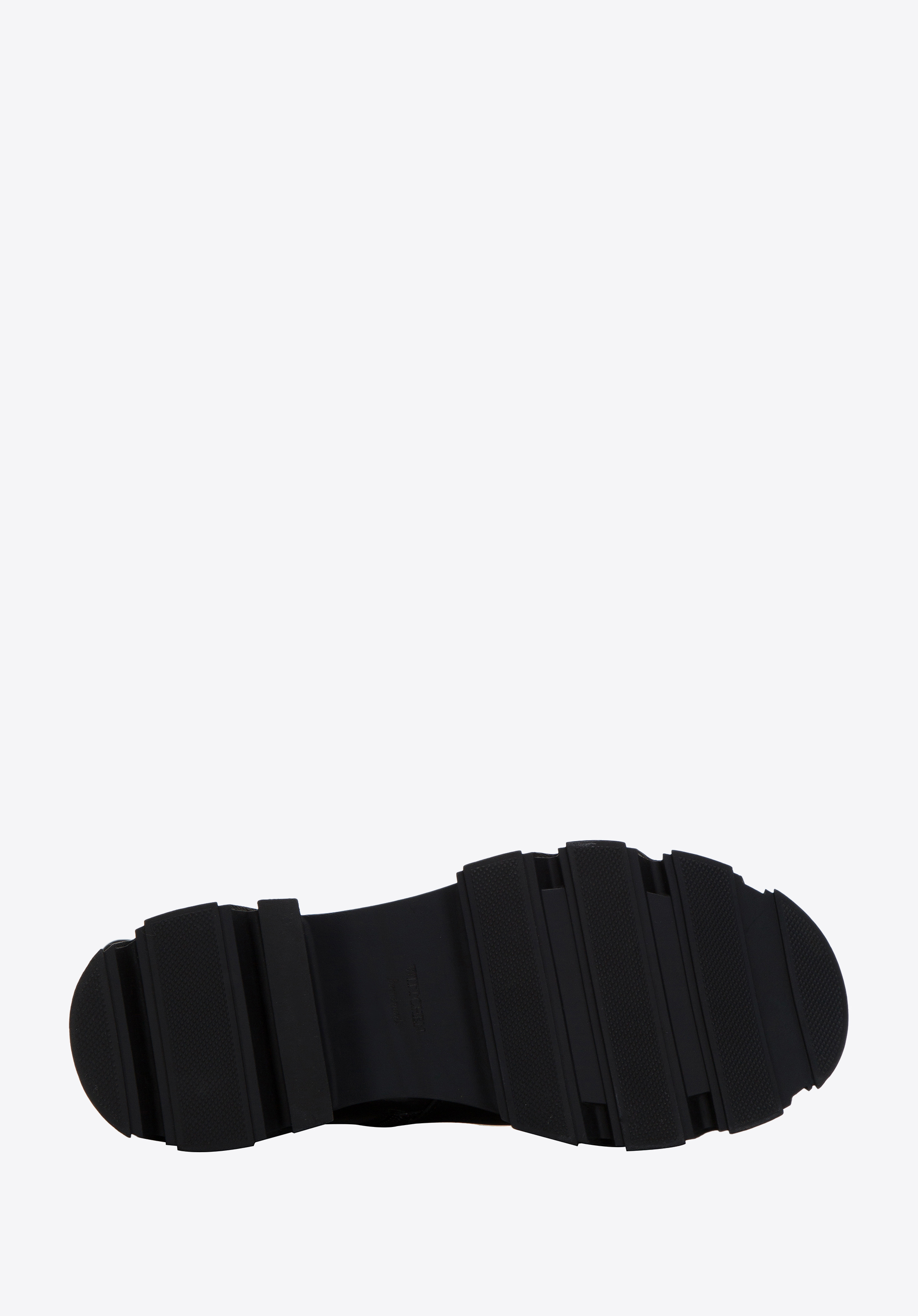 Diese Damenschuhe peppen jedes Outfit auf. Die Vorderseite ist aus hochwertigem Lackleder gefertigt.Die dekorative abnehmbare Kette verleiht ihnen einen einzigartigen Charakter. Der hohe Schaft aus elastischem Öko-Wildleder passt sich perfekt an Ihre Wande an und sorgt dank des innenliegenden Reißverschlusses für ein bequemes Anziehen. Die dicke Plateau-Sohle aus Gummi sorgt für guten Halt bei fast allen Bedingungen und verleiht Ihnen ein paar Zentimeter mehr Höhe. Tragen Sie sie zu Ihrer Ramones-Jacke oder einem schicken Mantel - sie sind vielseitig und doch unverwechselbar. Die Stiefel aus Lackleder mit Kette sind eine gute Wahl für jede moderne Frau.