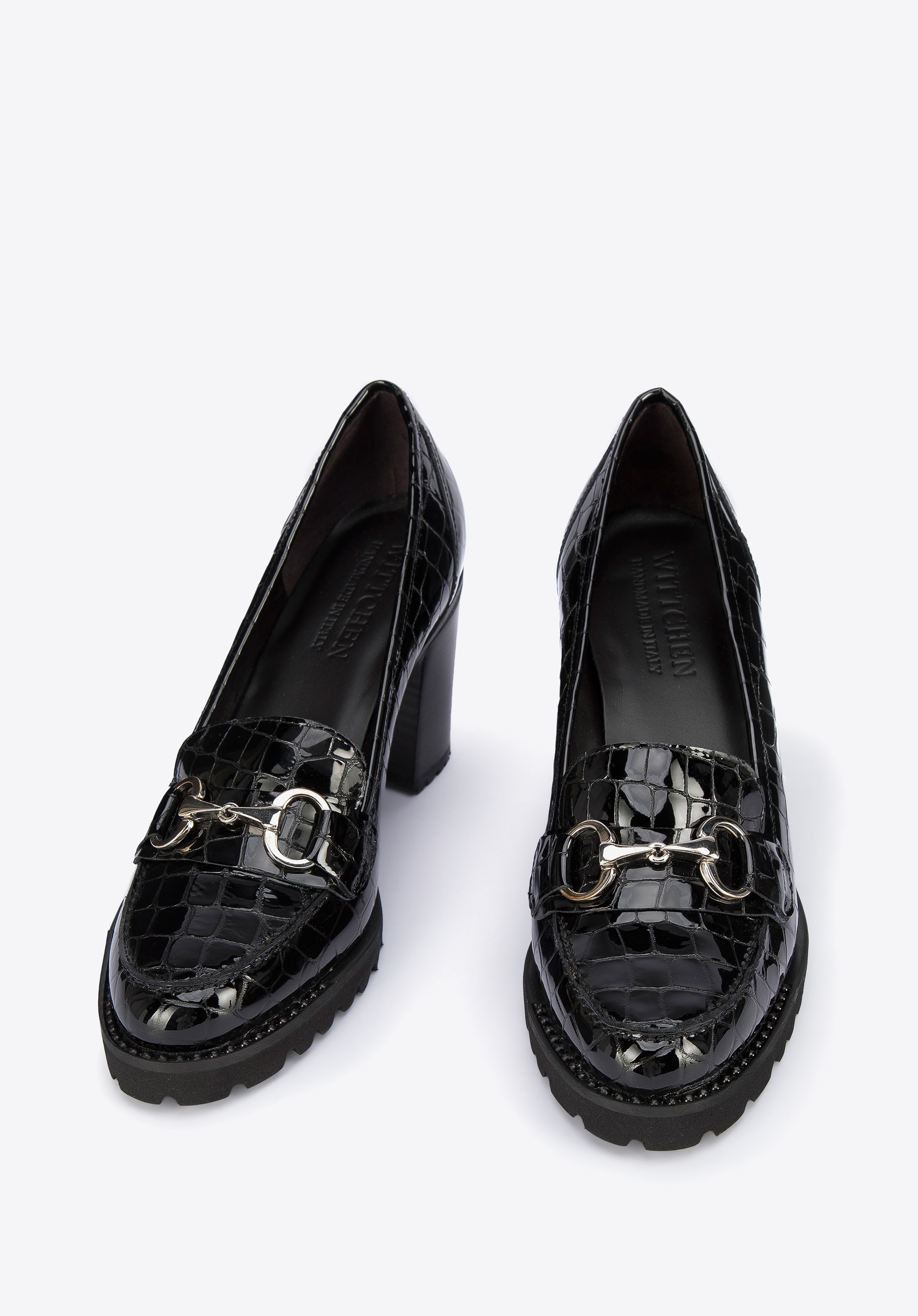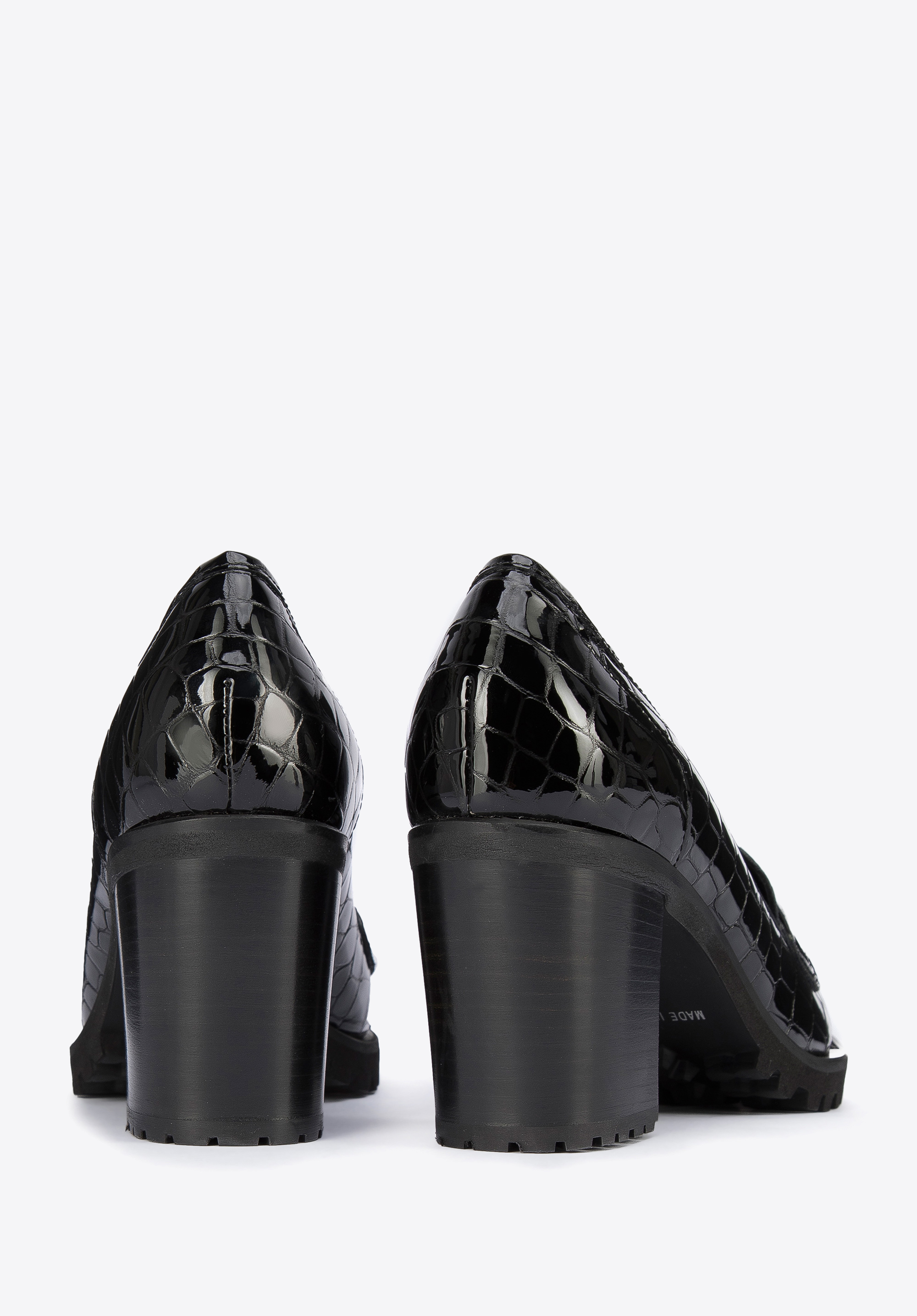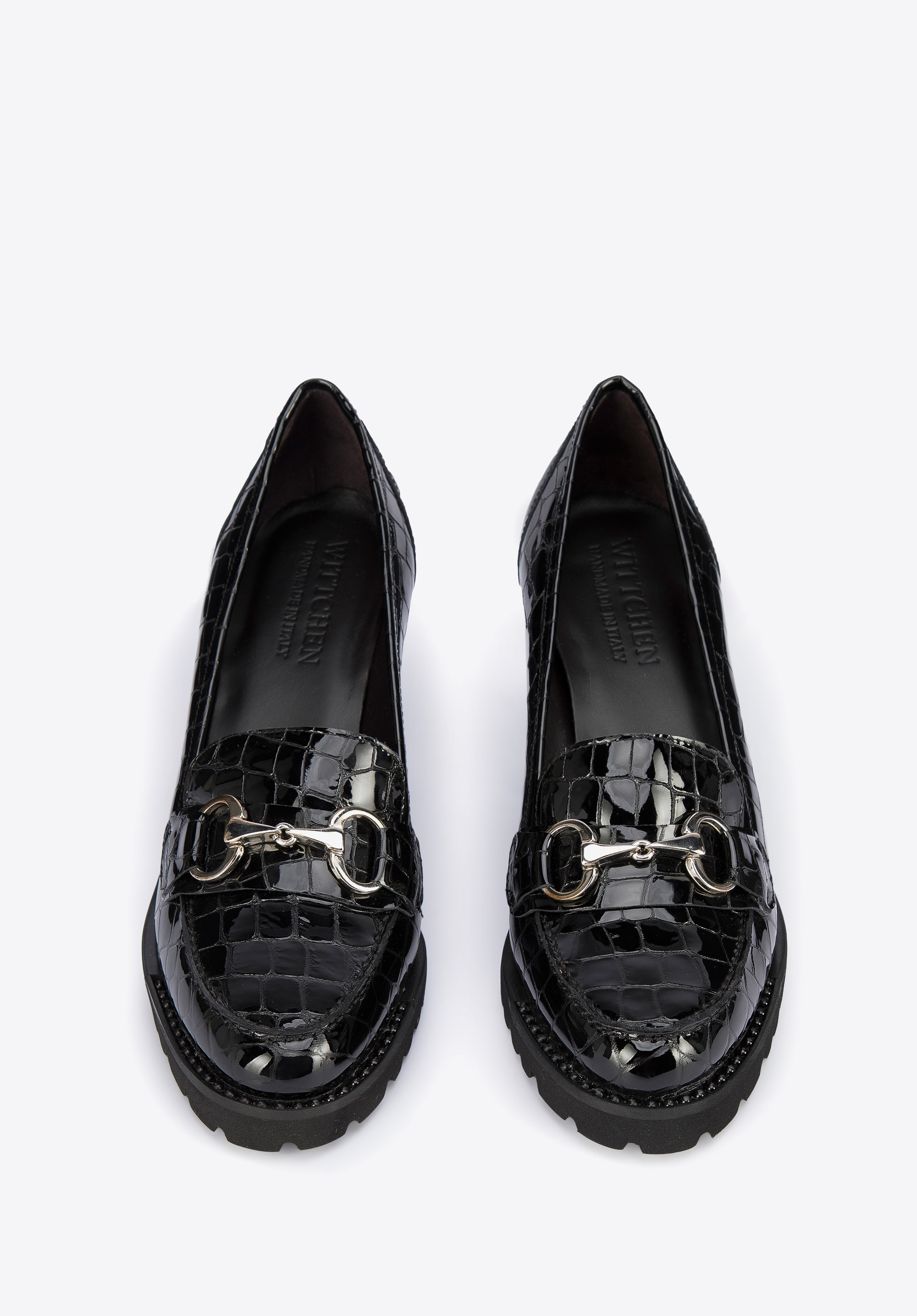 Diese stilvollen Schuhe sind eine gute Wahl für Liebhaber von Klassikern mit einem modernen Twist. Sie haben einen hohen, aber stabilen Absatz, so dass sie Ihnen ein paar Zentimeter an Höhe hinzufügen werden. Die Gummisohle sorgt für stundenlanges bequemes Gehen. Die Pumps wurden in Italien aus hochwertigem Lackleder gefertigt. Sie sind mit dem charakteristischen Mokassin-Besatz und einer eleganten Metallschnalle verziert. Die Plateau-Pumps aus Lackleder mit Profil sind ein modisches Accessoire, das Sie sowohl zur Arbeit als auch nach der Arbeit tragen können.