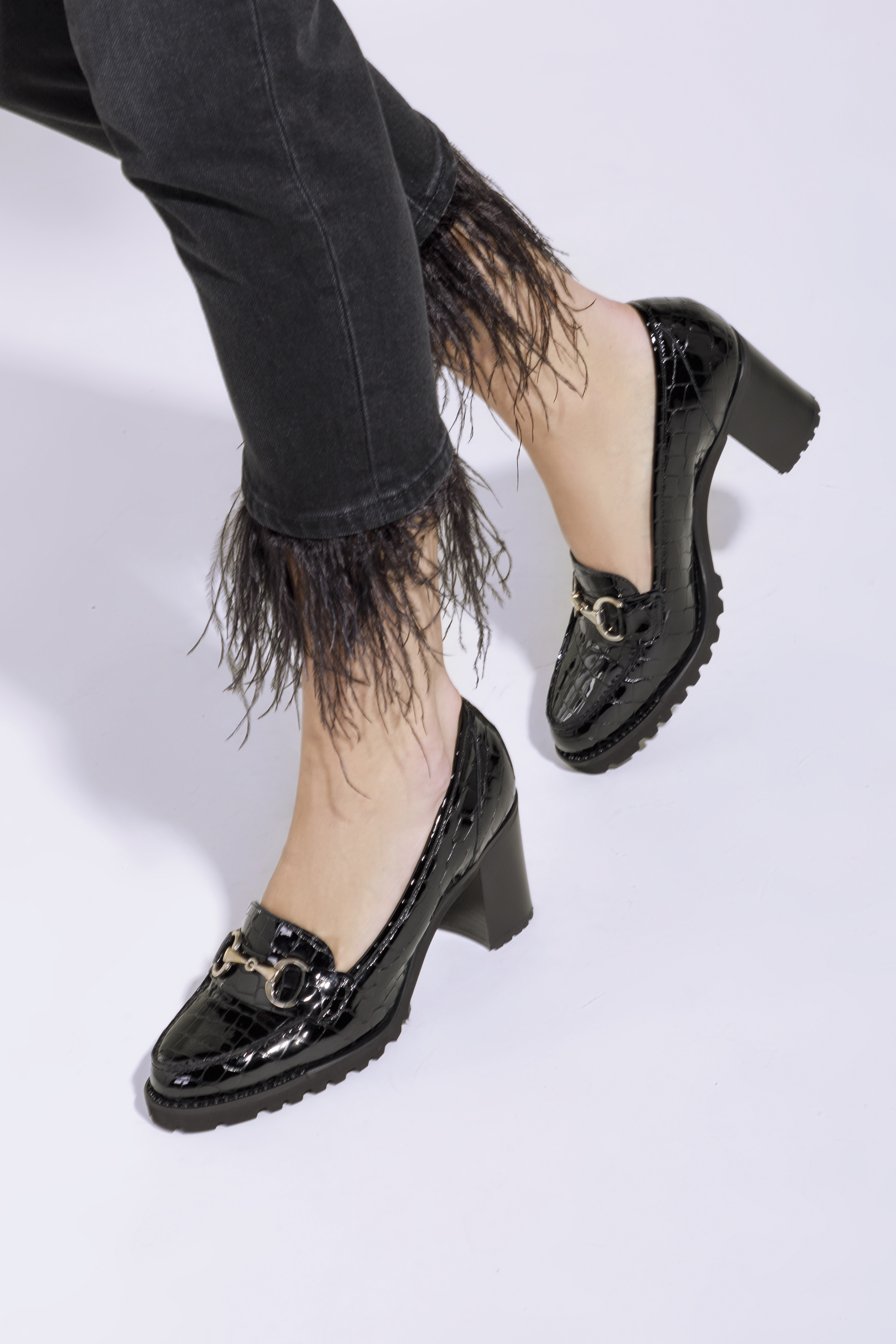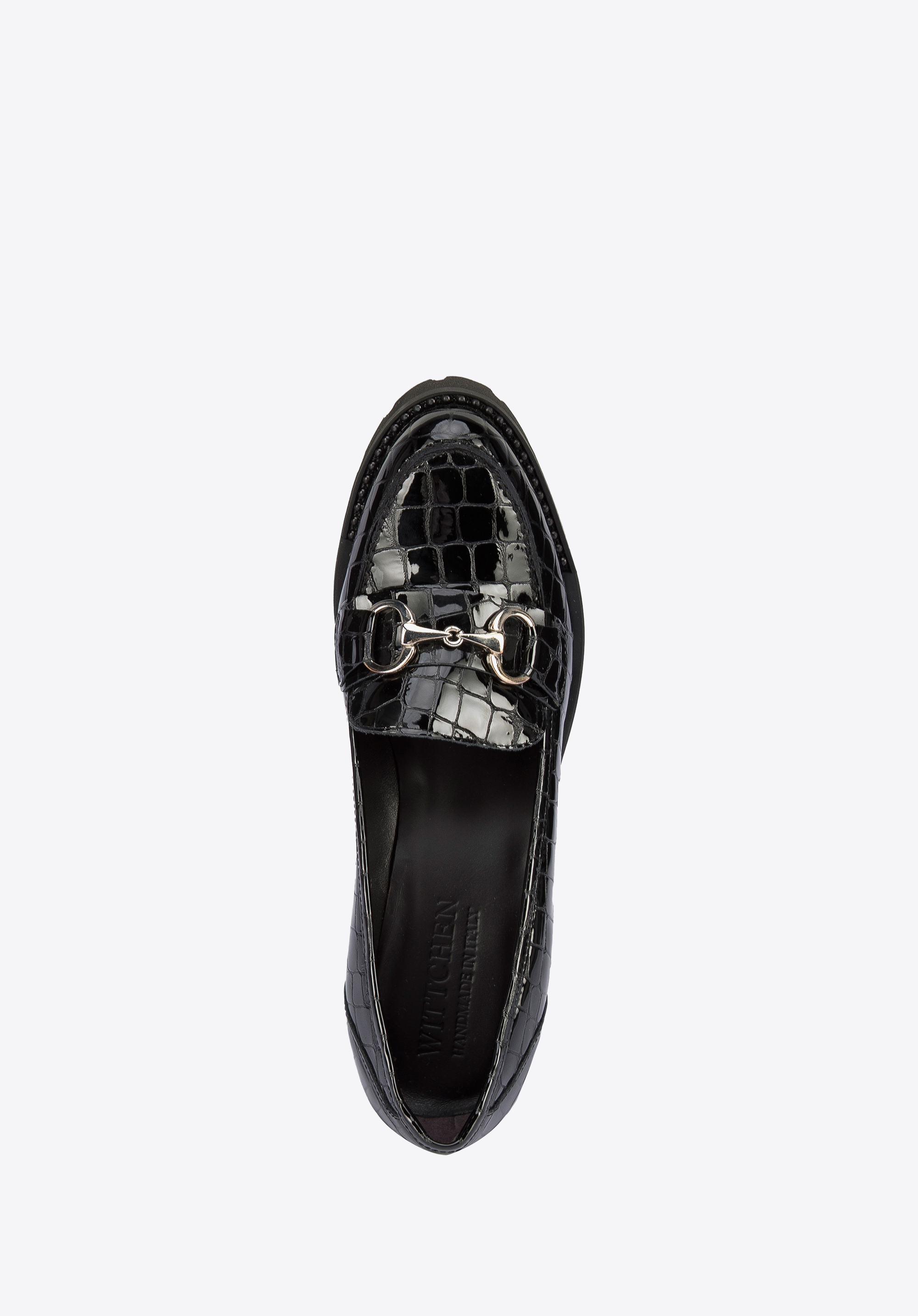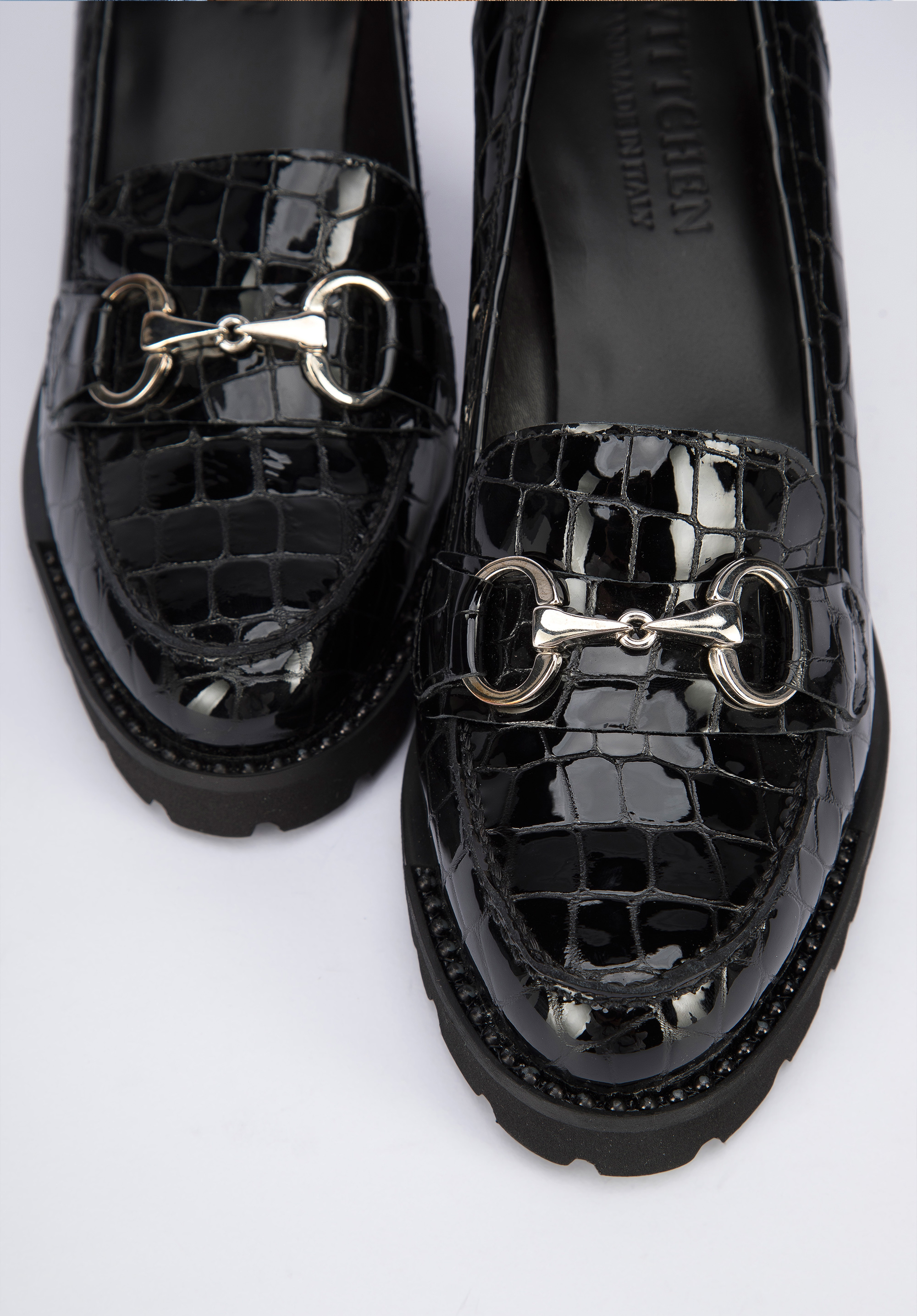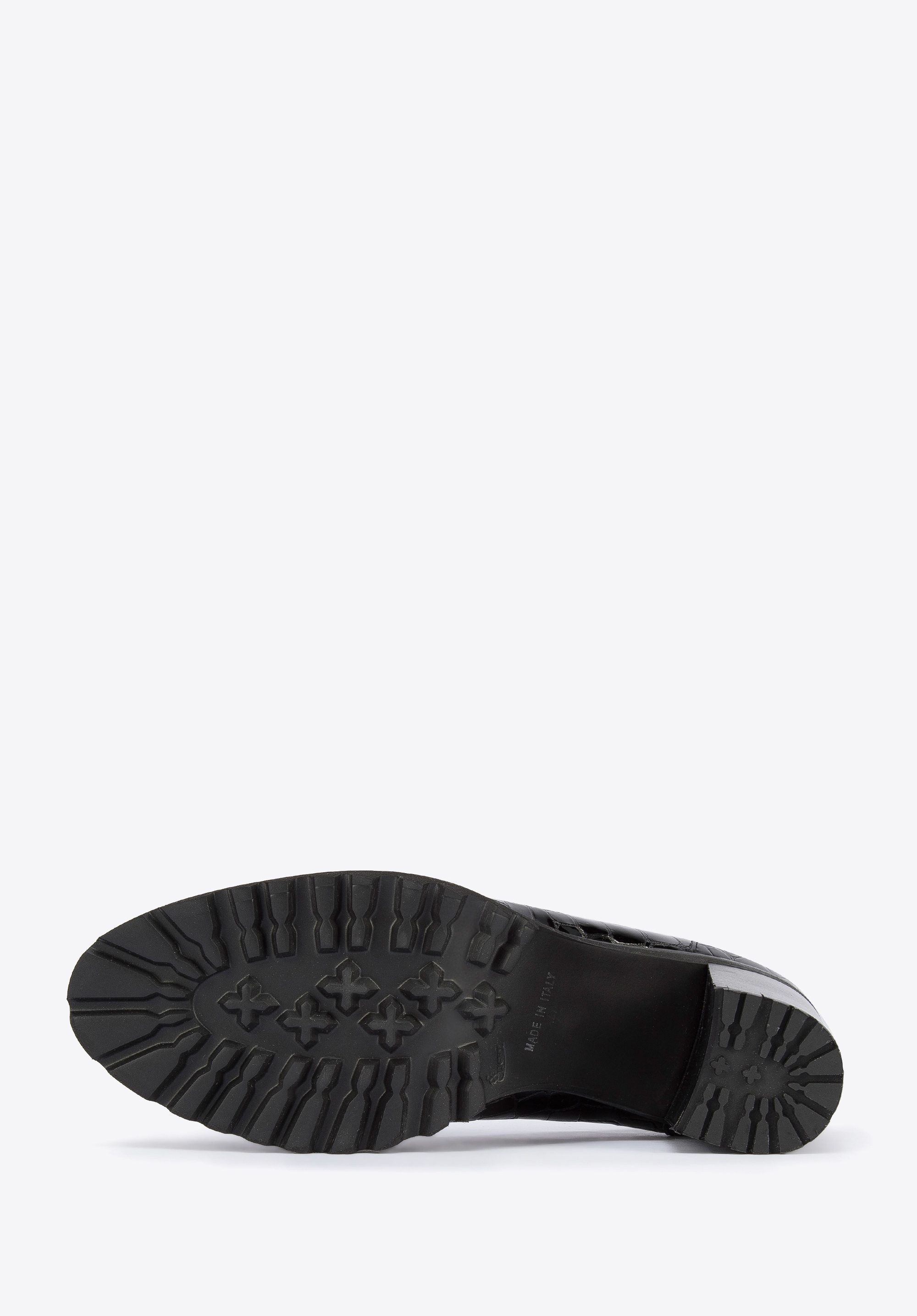 Diese stilvollen Schuhe sind eine gute Wahl für Liebhaber von Klassikern mit einem modernen Twist. Sie haben einen hohen, aber stabilen Absatz, so dass sie Ihnen ein paar Zentimeter an Höhe hinzufügen werden. Die Gummisohle sorgt für stundenlanges bequemes Gehen. Die Pumps wurden in Italien aus hochwertigem Lackleder gefertigt. Sie sind mit dem charakteristischen Mokassin-Besatz und einer eleganten Metallschnalle verziert. Die Plateau-Pumps aus Lackleder mit Profil sind ein modisches Accessoire, das Sie sowohl zur Arbeit als auch nach der Arbeit tragen können.