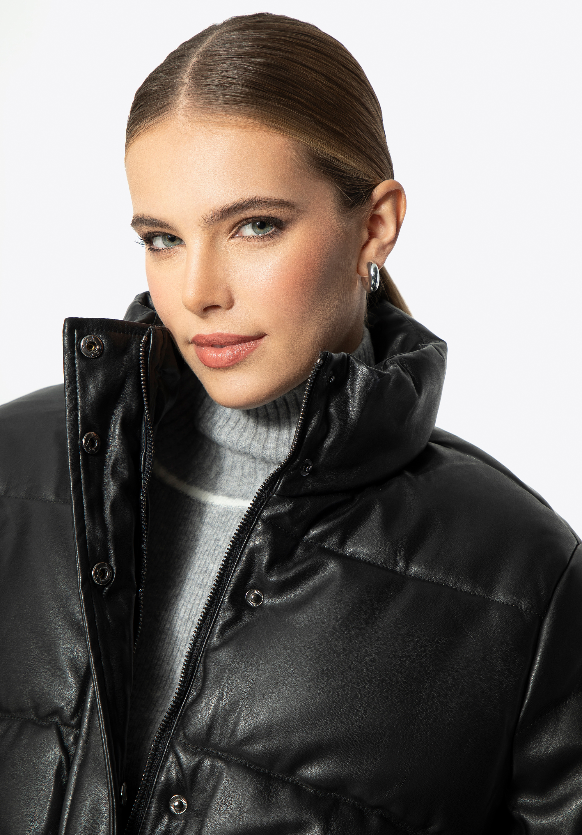Diese stilvolle Damenjacke verleiht jedem Outfit einen besonderen Charakter. Sie ist aber aus einem ungewöhnlichen Material gefertigt: aus hochwertigem Öko-Leder. Dank ihrer weichen Füllung wickelt sie Sie in den kälteren Monaten ein. Die Pufferjacke hat offene Taschen an den Seiten, in die man seine Hände stecken kann. Der Schnitt- Oversize passt sowohl zu sportlichen Outfits als auch zu taillierten Kleidern und hohen Stiefeletten. Die Pufferjacke für Damen aus Öko-Leder ist eine gute Wahl für Damen, die modische Accessoires lieben.