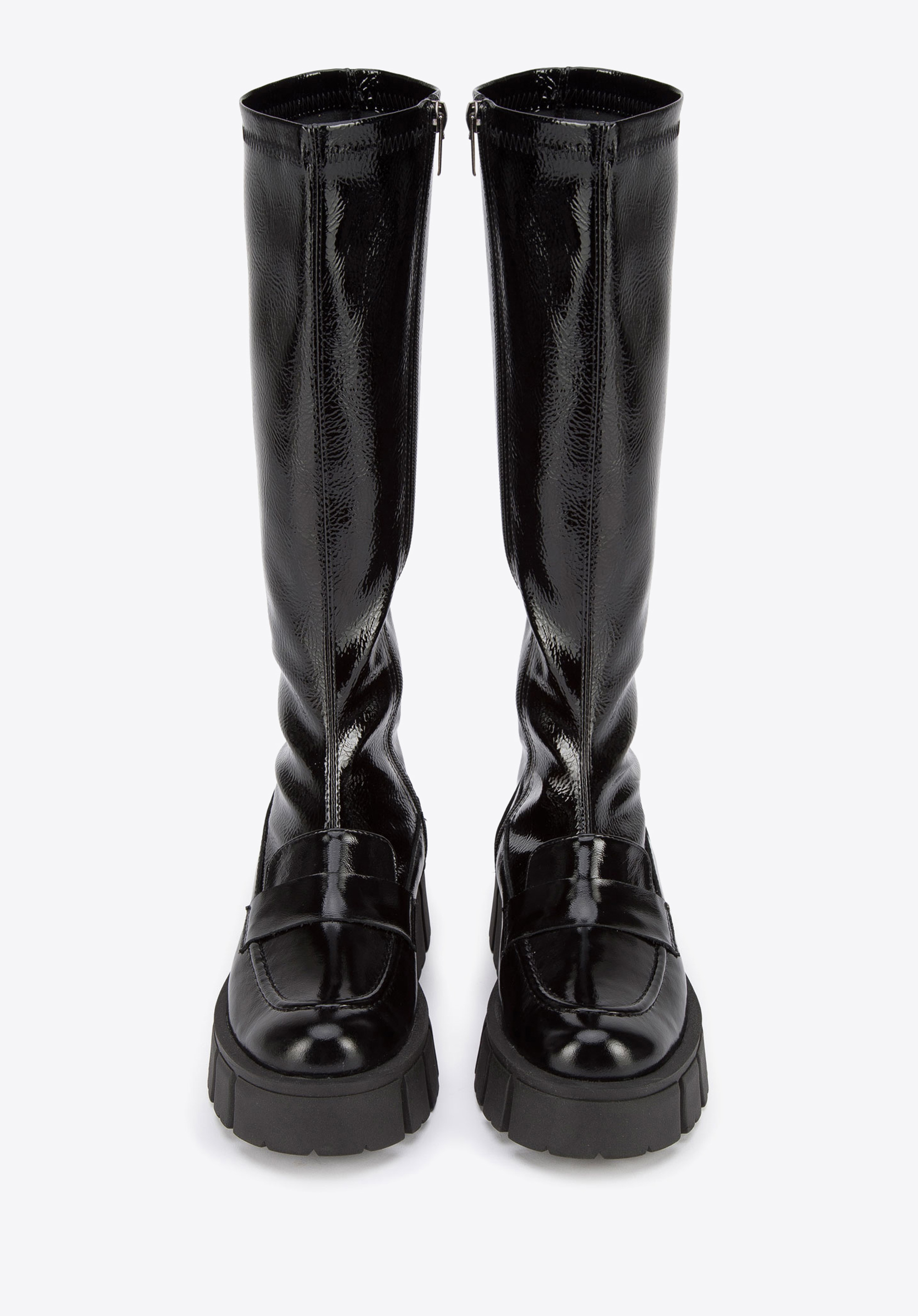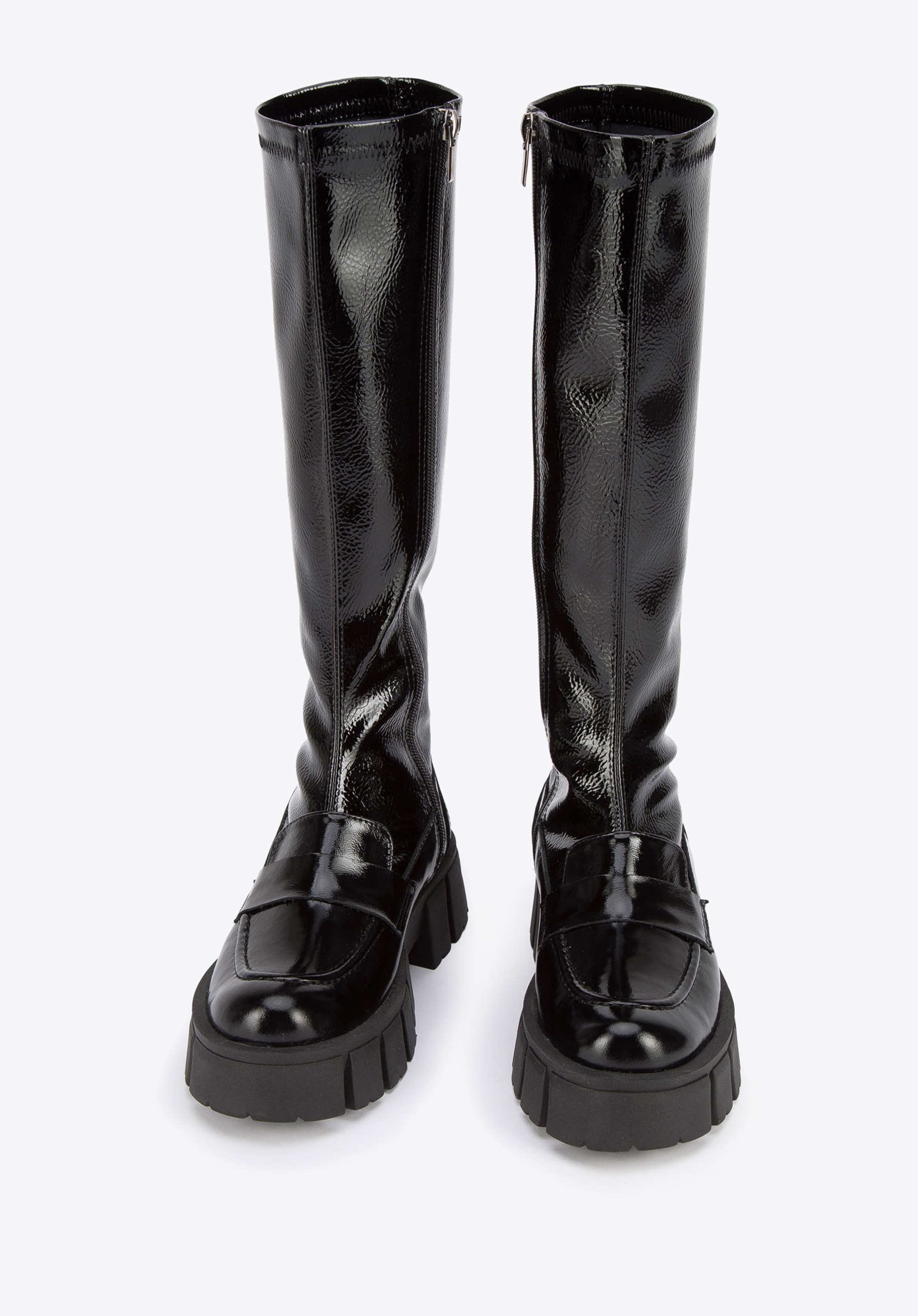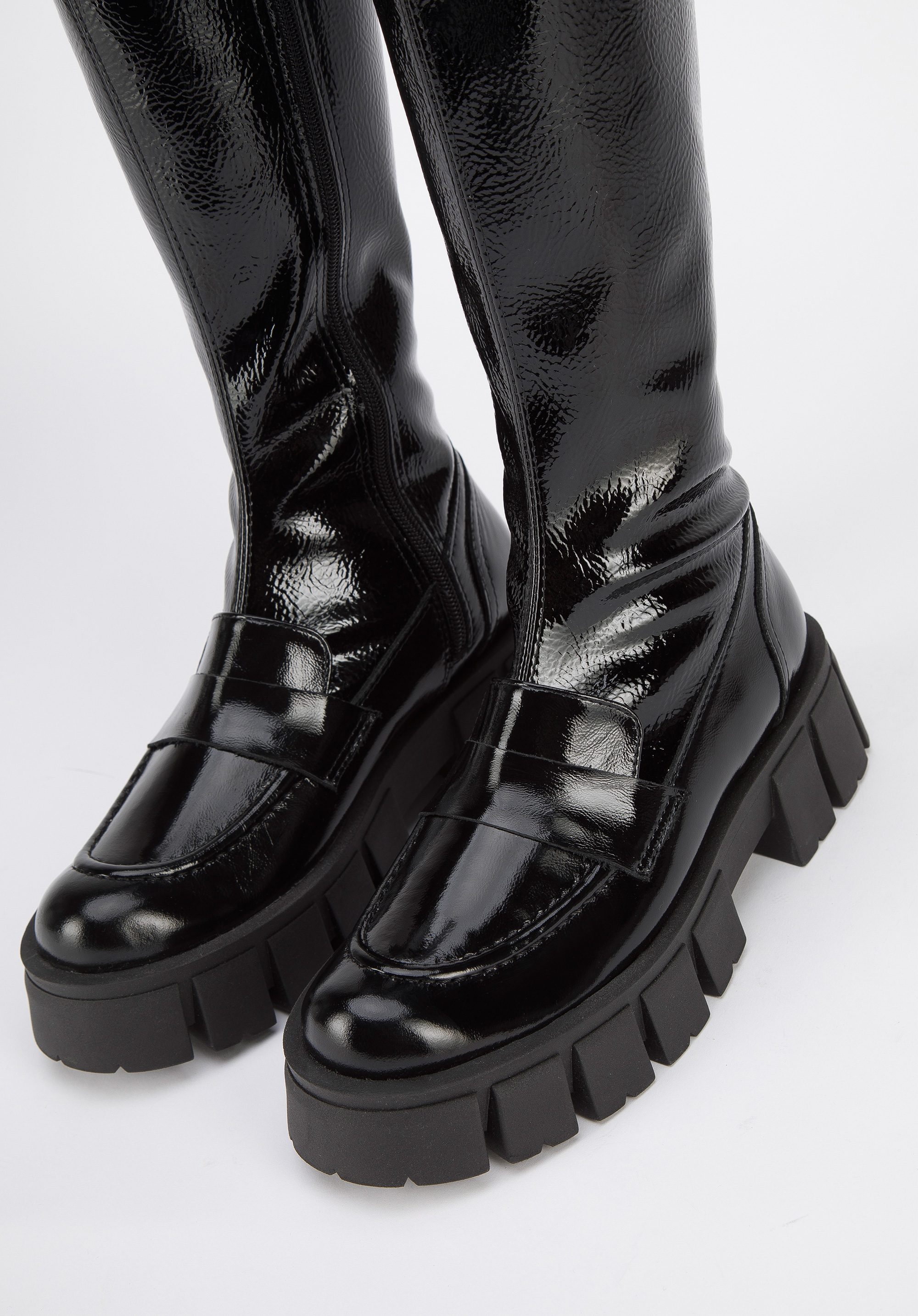 Diese einzigartigen Schuhe werden mehr als einen Blick auf sich ziehen. Sie sind in Polen aus hochwertigem Lackleder gefertigt. Die Vorderseite erinnert durch die gesäumte Schuhspitze und den Riemen an Mokassins. Sie haben den hohen Schaft und lassen sich aber dank des Reißverschlusses leicht anziehen. Außerdem isoliert die dicke Sohle gut gegen Kälte und bietet bei jedem Wetter die Haftung. Sie betonen das Bein perfekt mit einem Minirock oder einer maßgeschneiderten Hose. Die Stiefel à la Mokassins aus Lackleder sind ein Accessoire für jede Frau, die modische Accessoires mit Charakter mag.
